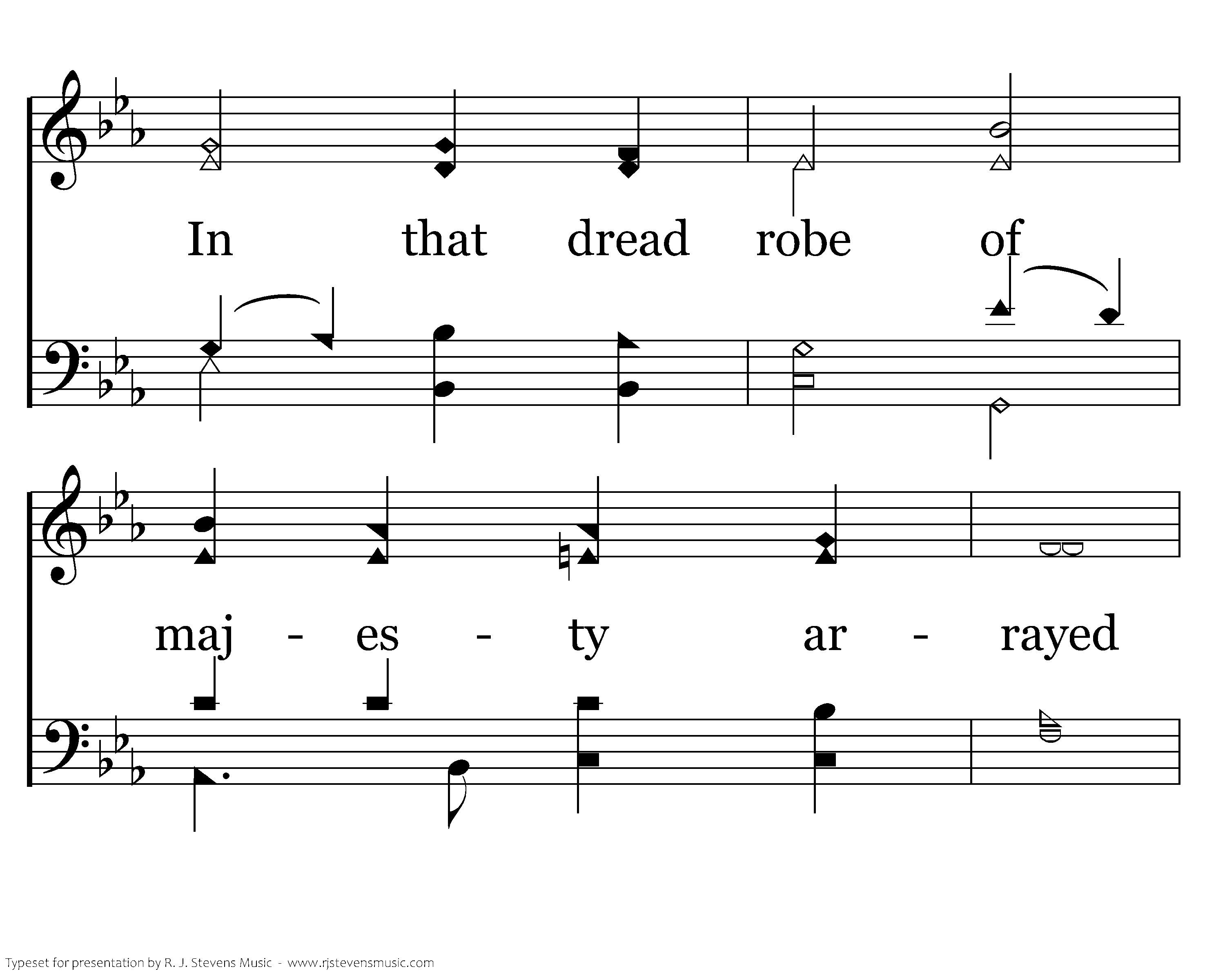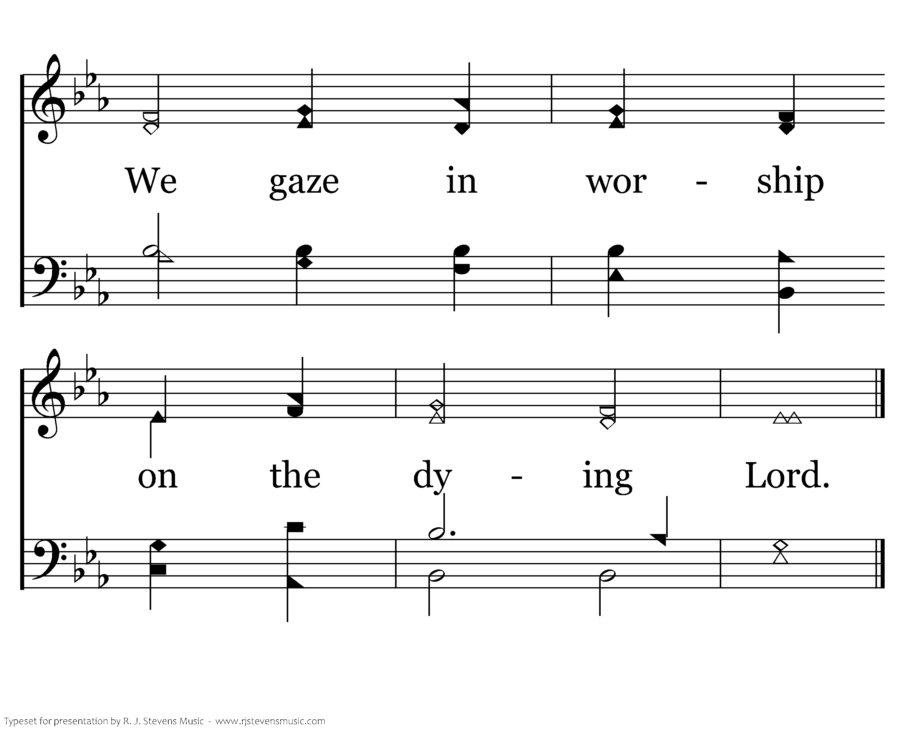 We see by faith upon the cross displayed, His body broken and His blood outpoured; In that dread robe of majesty arrayed We gaze in worship on the dying Lord.