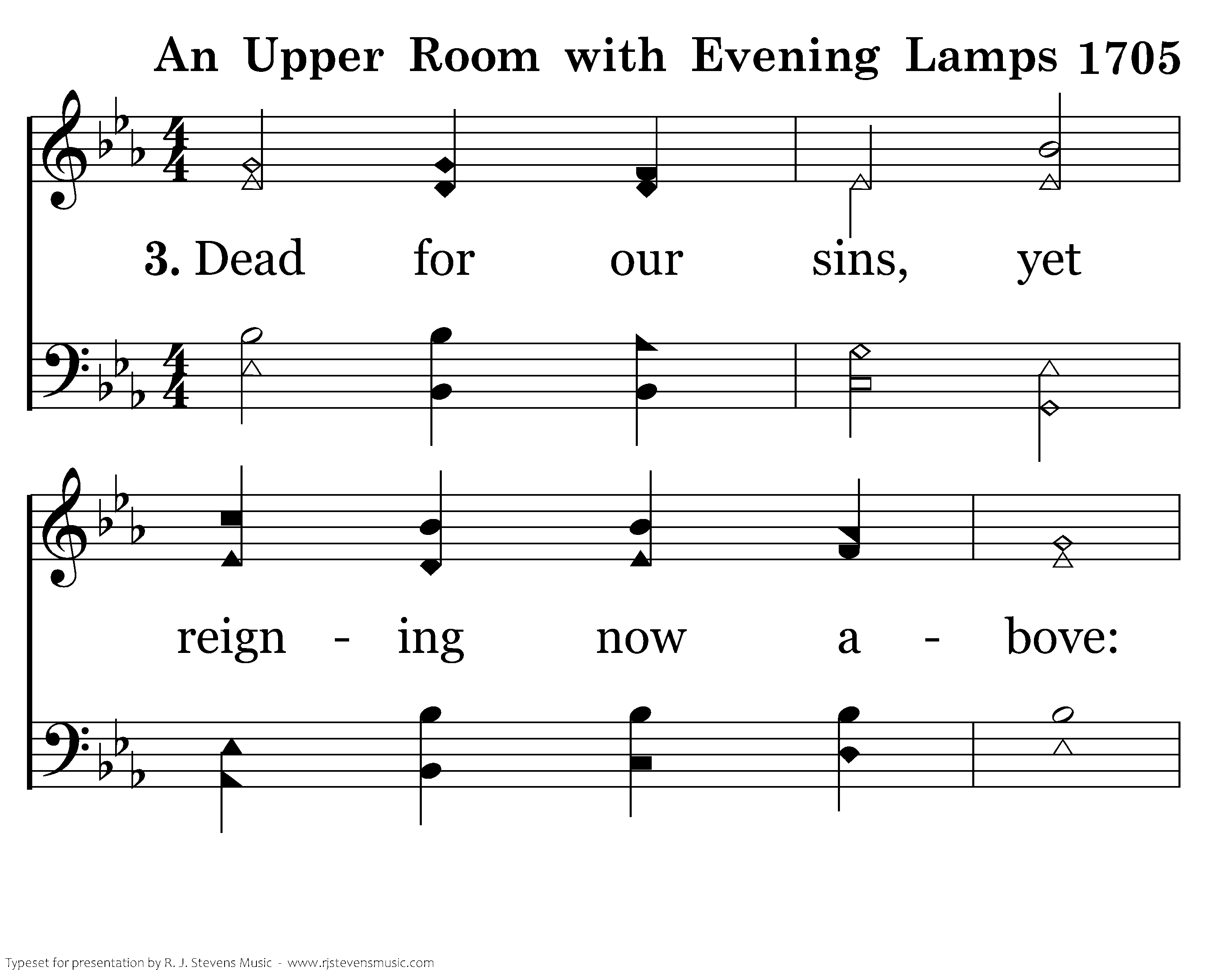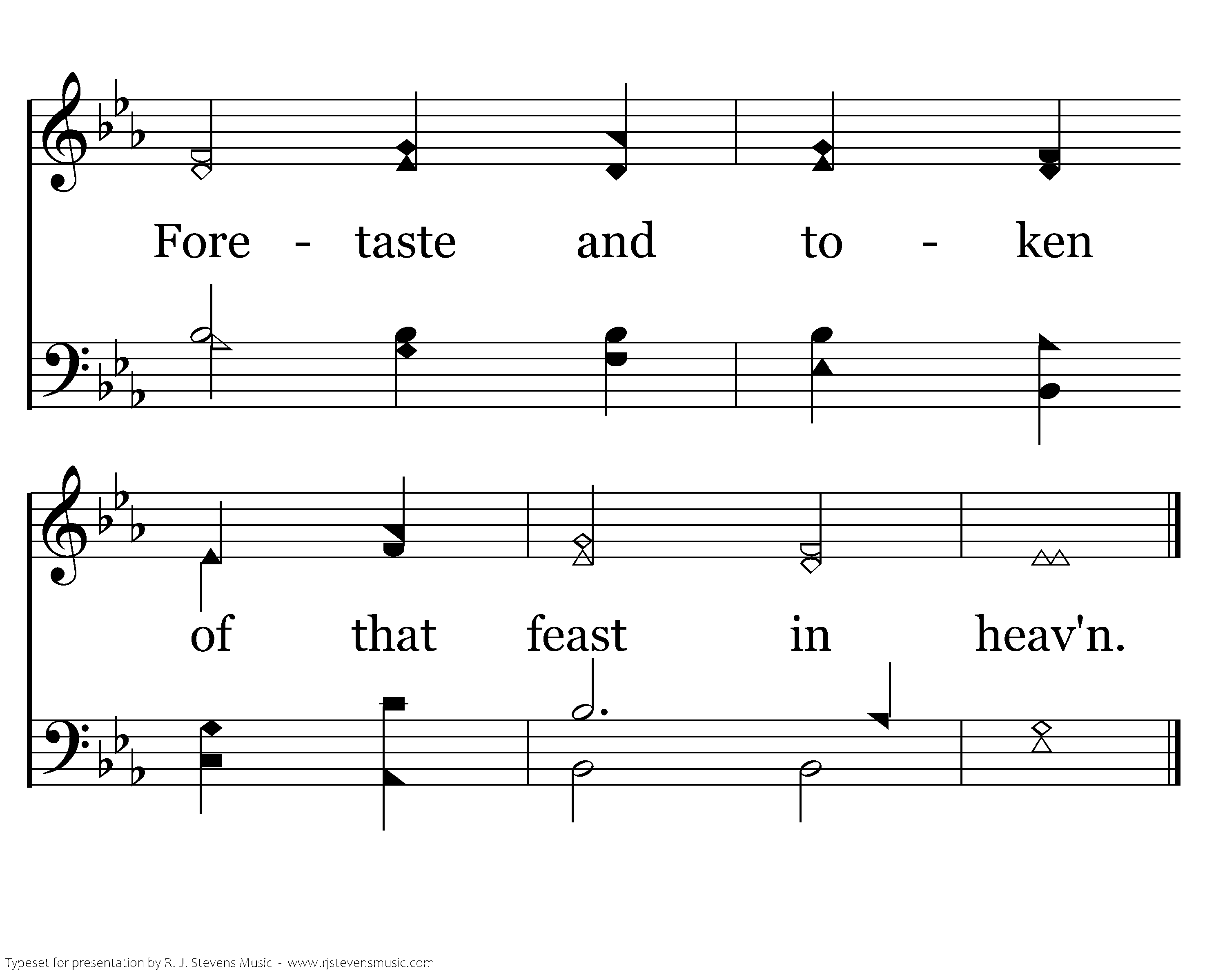 Dead for our sins, yet reigning now above: Still to our hearts we find His presence giv'n, Take for ourselves the pledges of His love, Foretaste and token of that feast in heav'n.