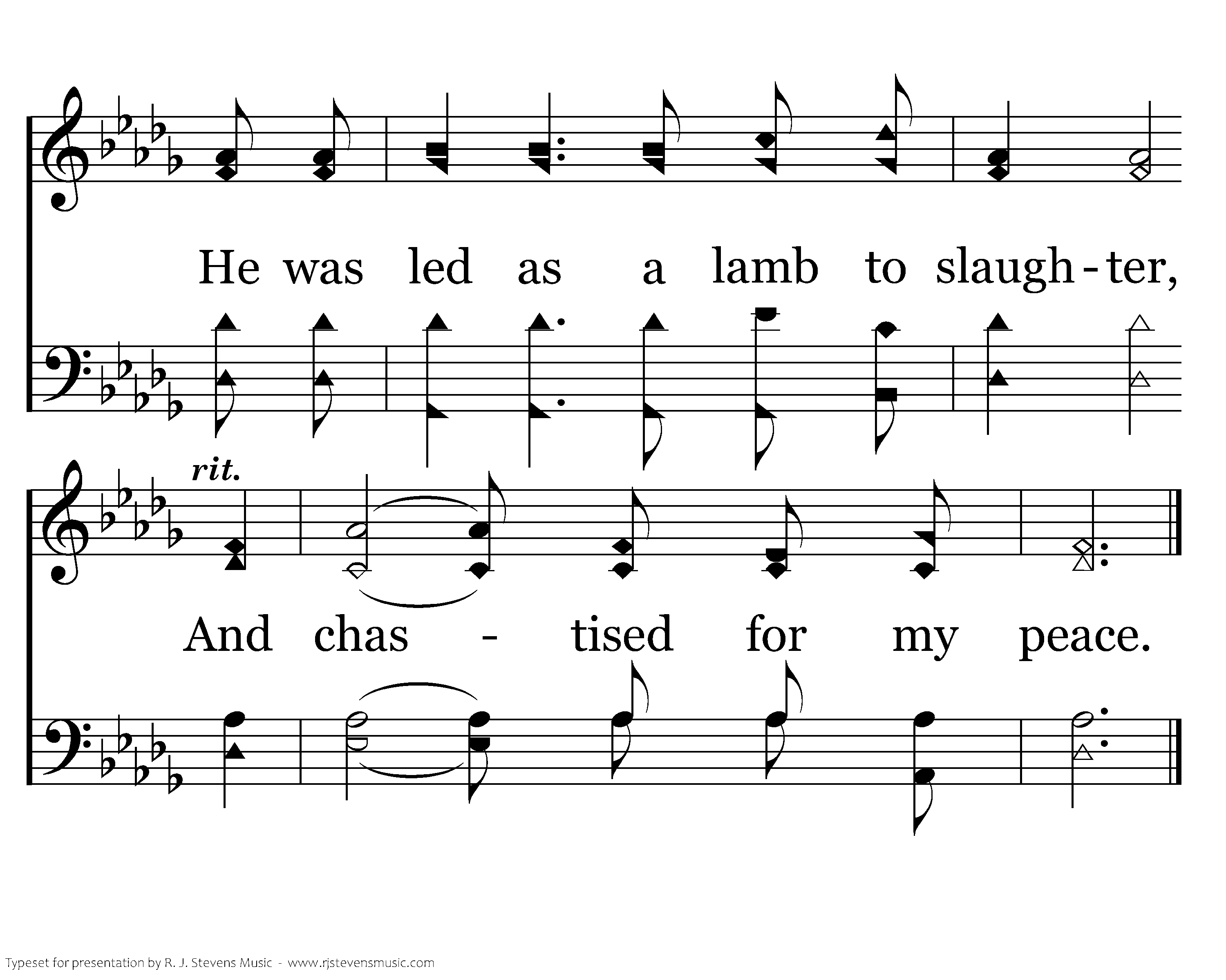 He was wounded for my transgressions, He was bruised for my iniquities. He was led as a lamb to slaughter, And chastised for my peace.