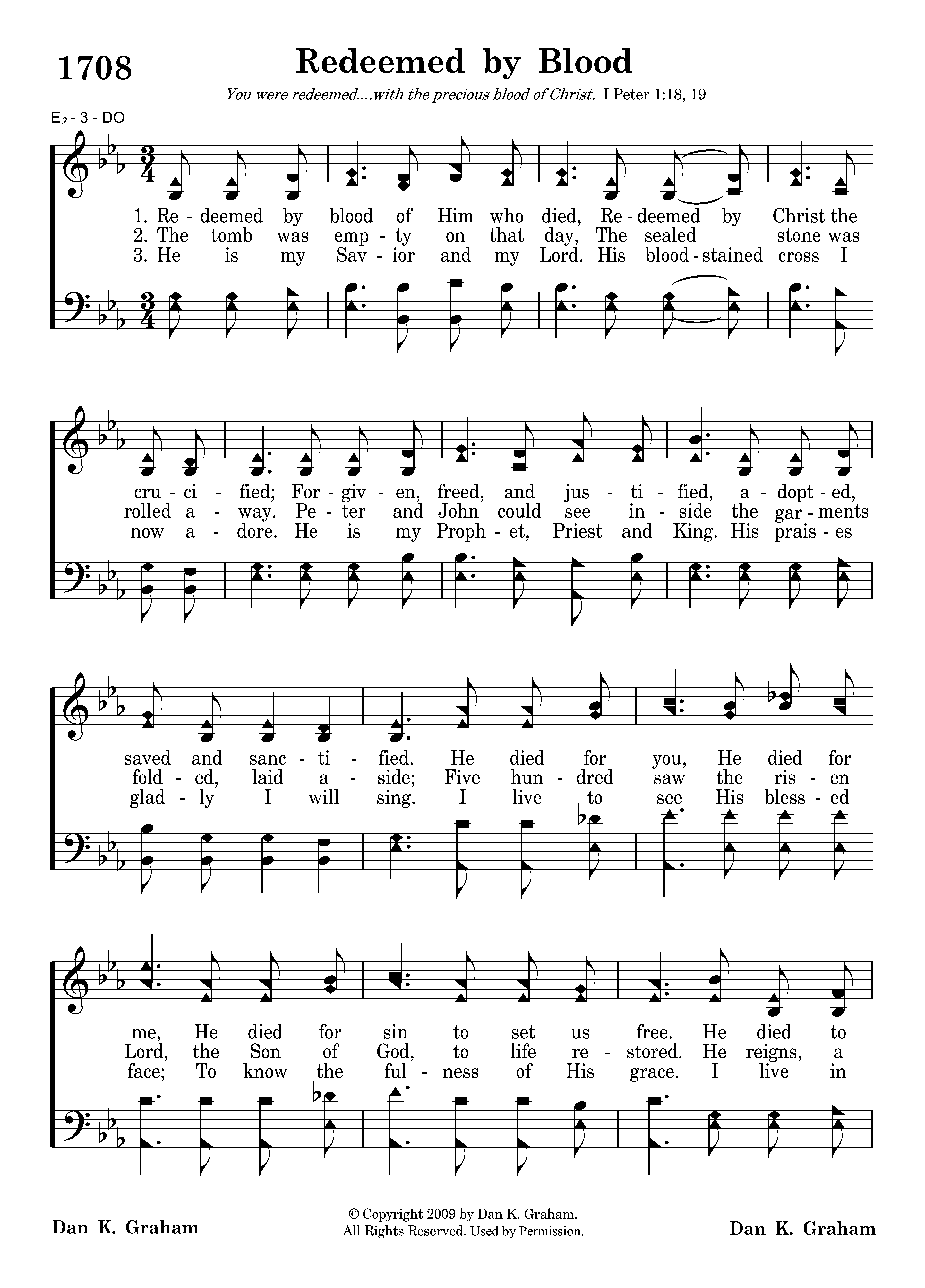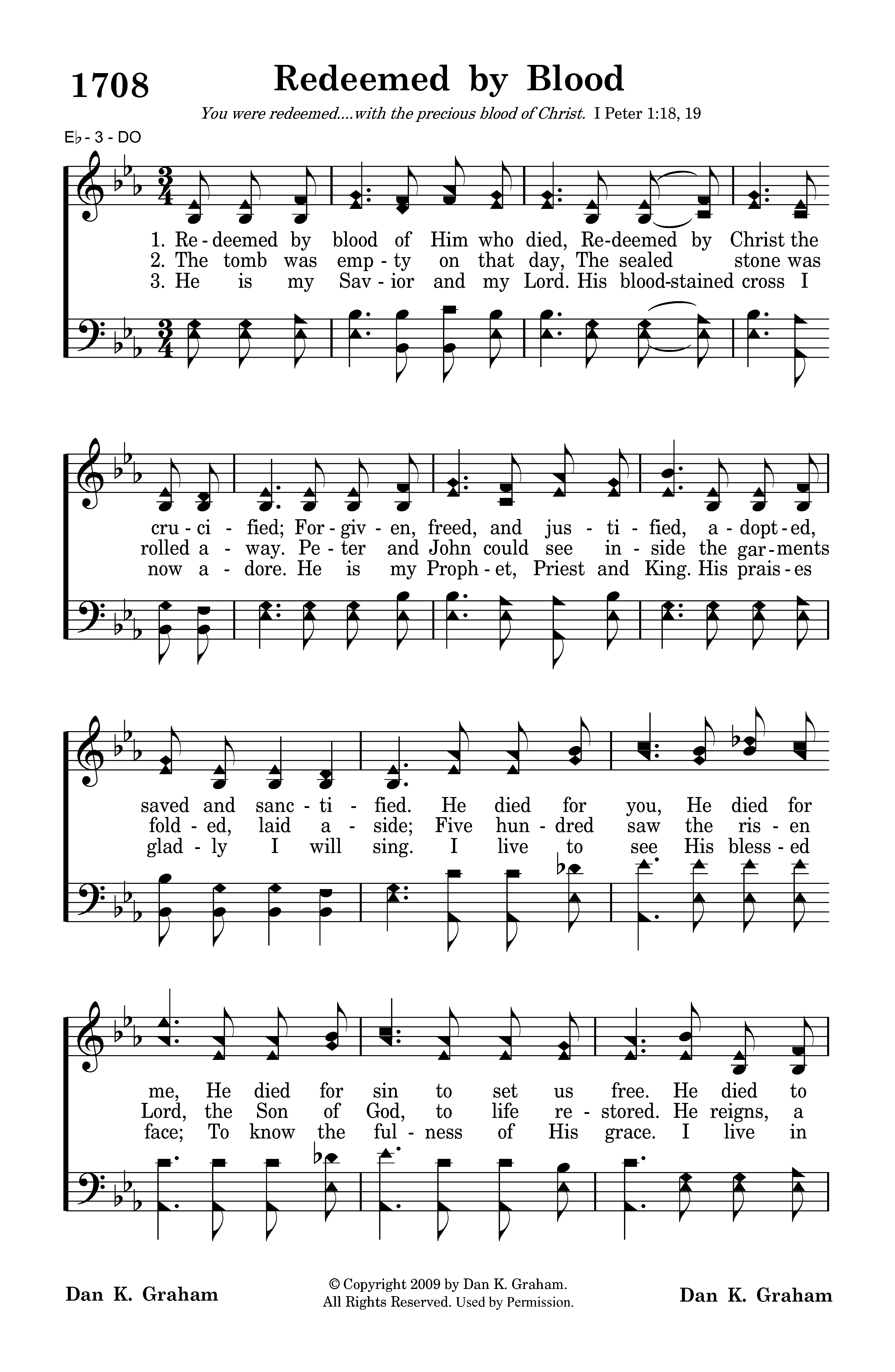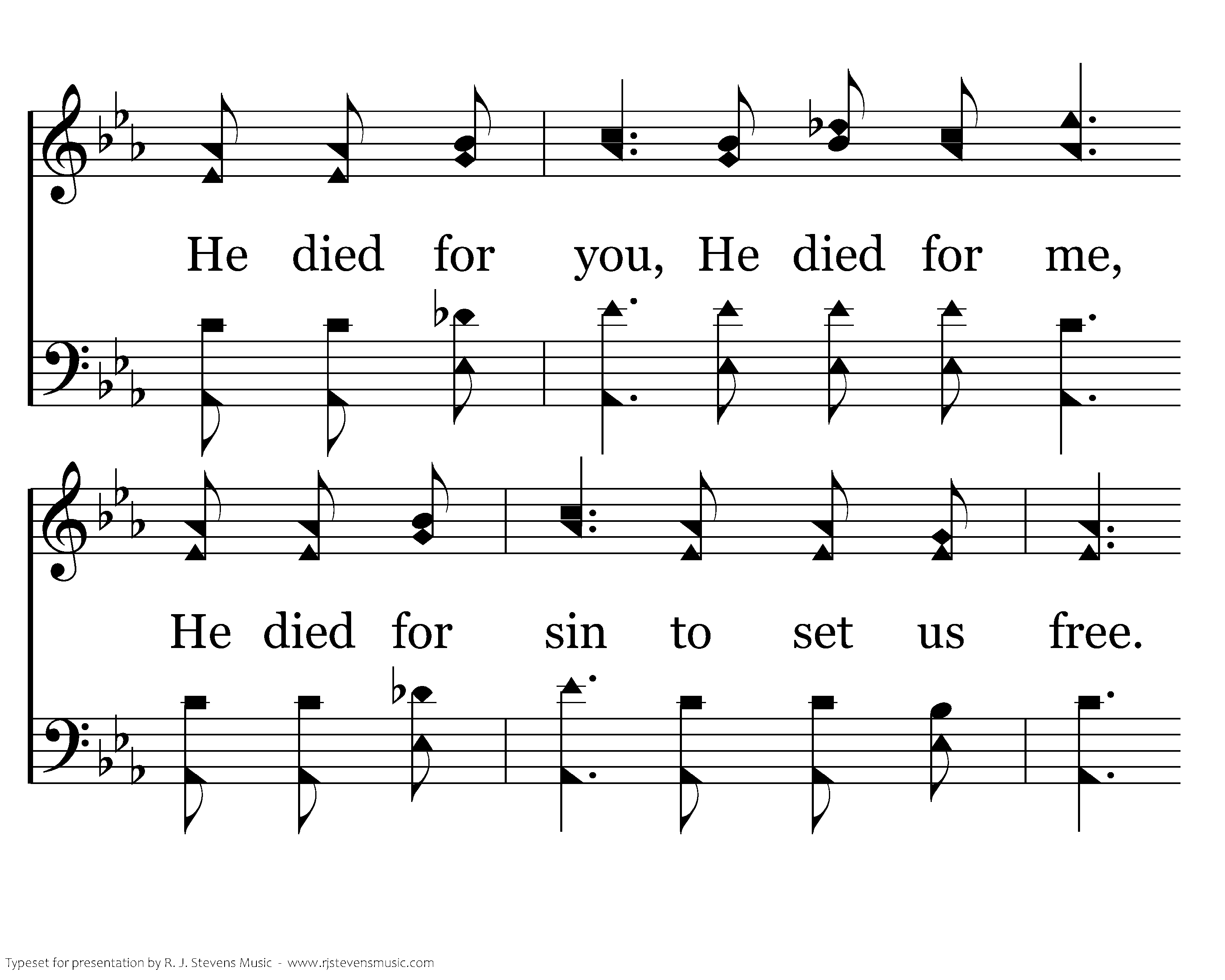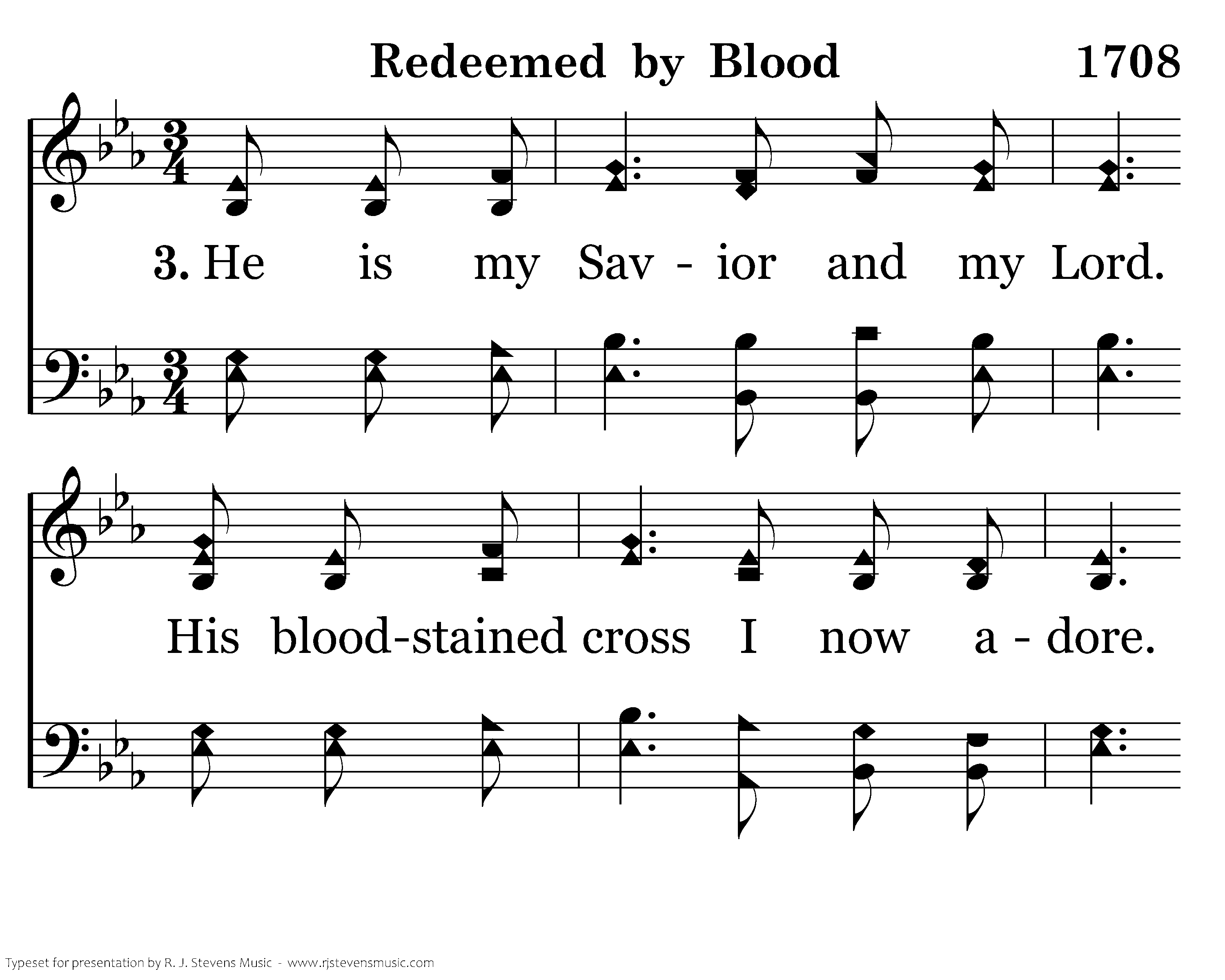 Redeemed by blood of Him who died, Redeemed by Christ the crucified; Forgiven, freed, and justified, adopted, saved and sanctified. He died for you, He died for me, He died for sin to set us free. He died to rescue all who fall. He suffered, bled and died for all.