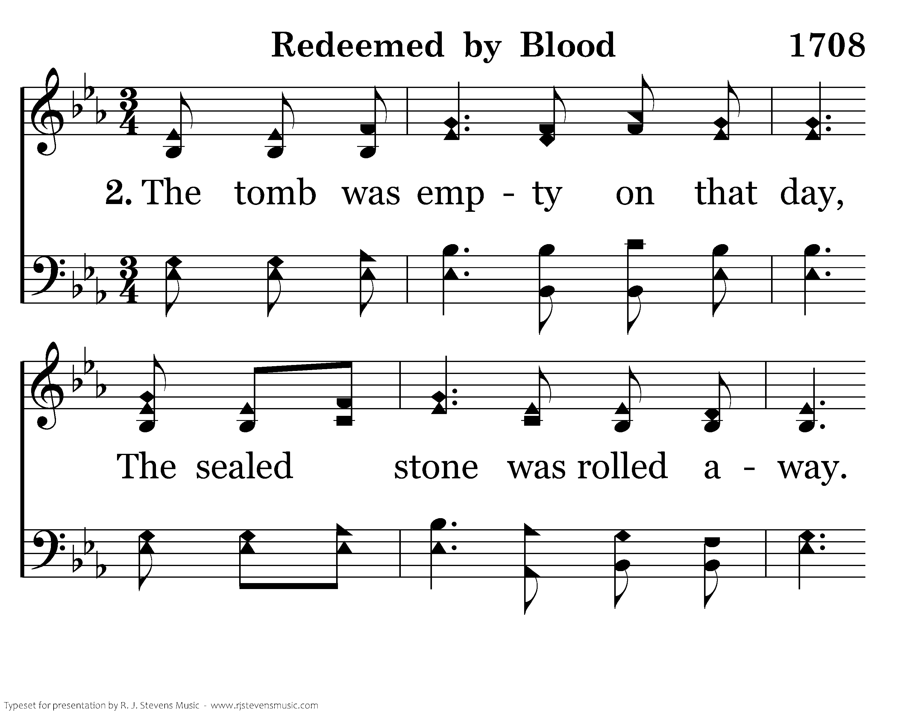 The tomb was empty on that day, The sealed stone was rolled away. Peter and John could see inside the garments folded, laid aside; Five hundred saw the risen Lord, the Son of God, to life restored. He reigns, a priest upon His throne. The blood He offers is His own.