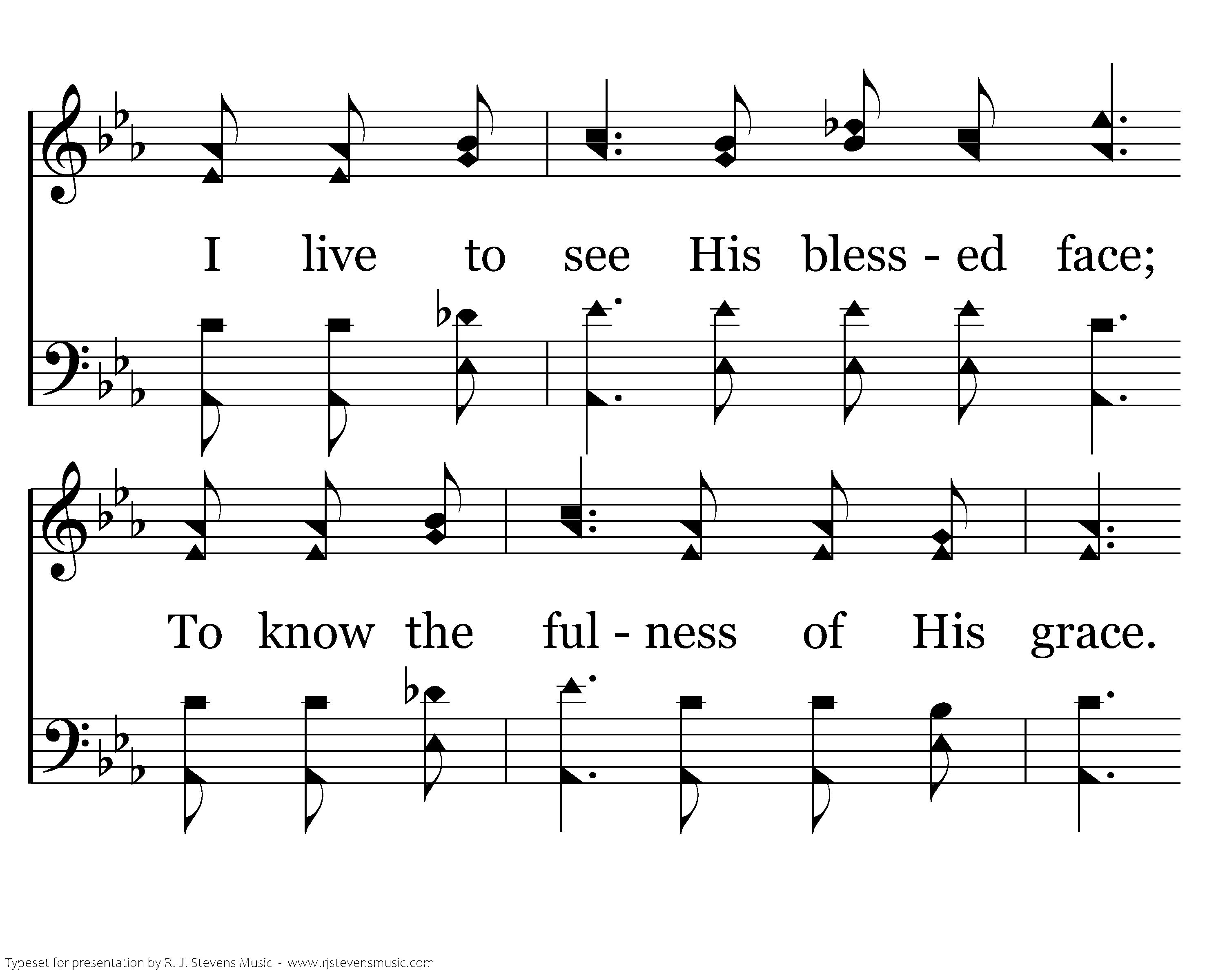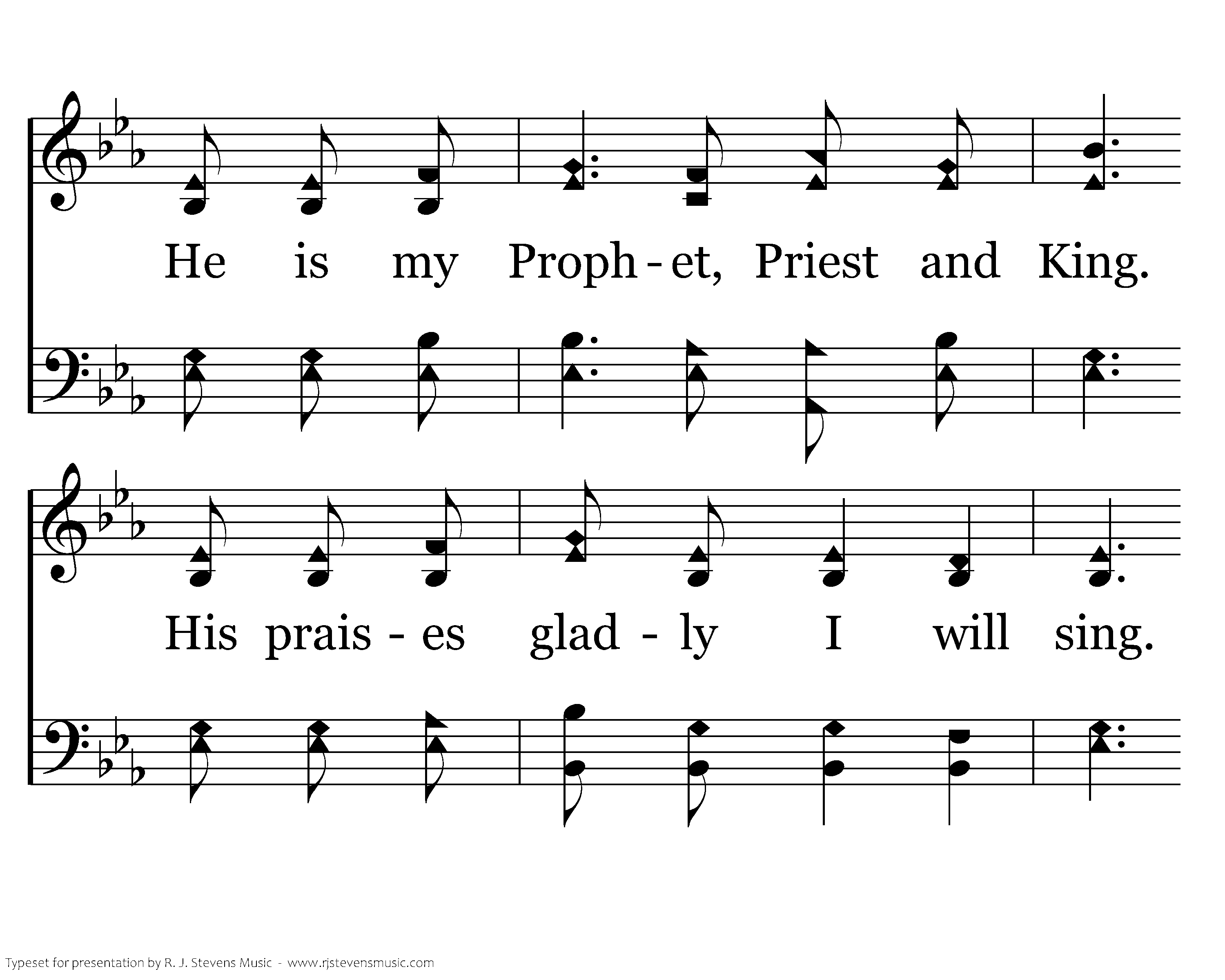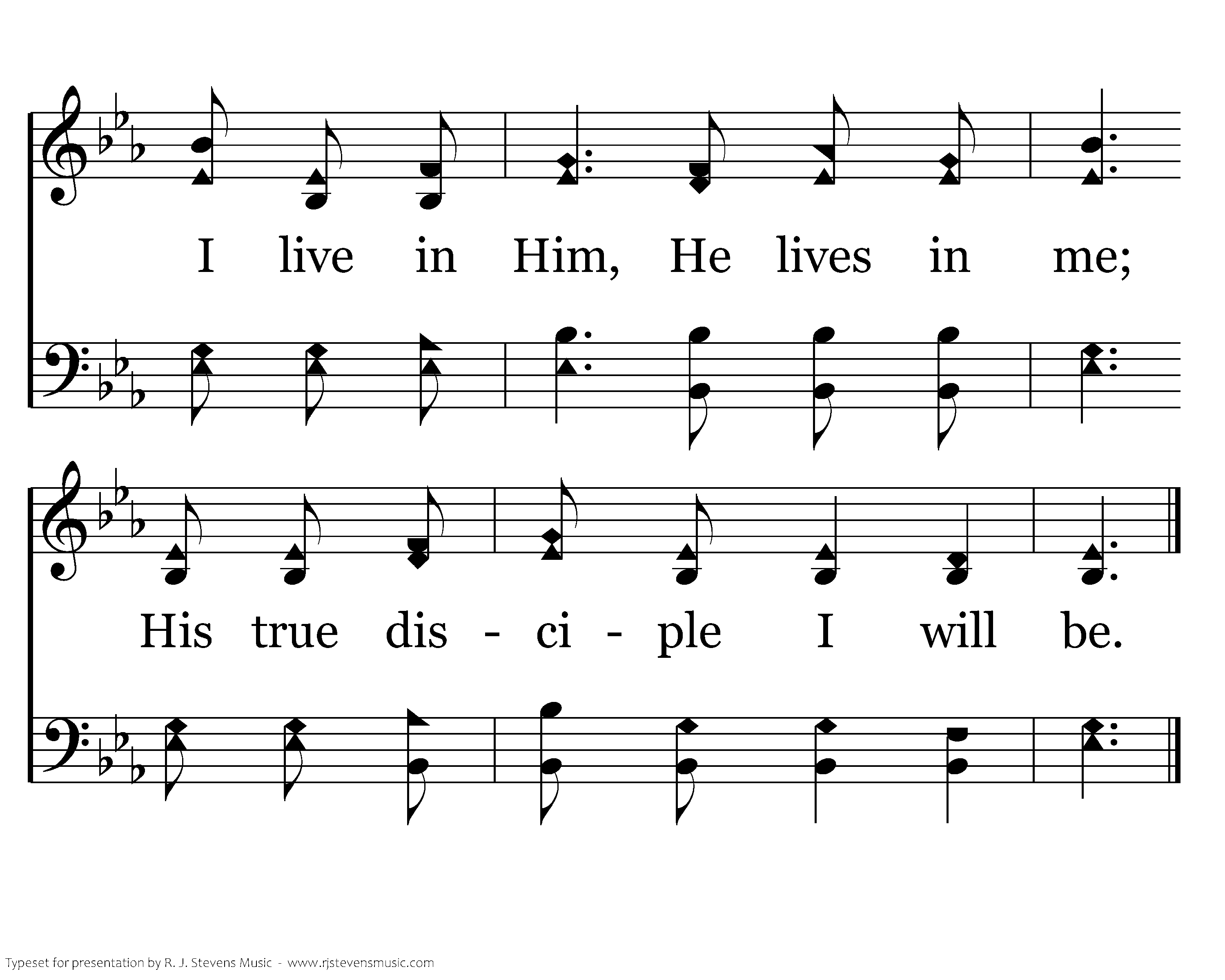 He is my Savior and my Lord. His bloodstained cross I now adore. He is my Prophet, Priest and King. His praises gladly I will sing. I live to see His blessed face; To know the fulness of His grace. I live in Him, He lives in me; His true disciple I will be.
