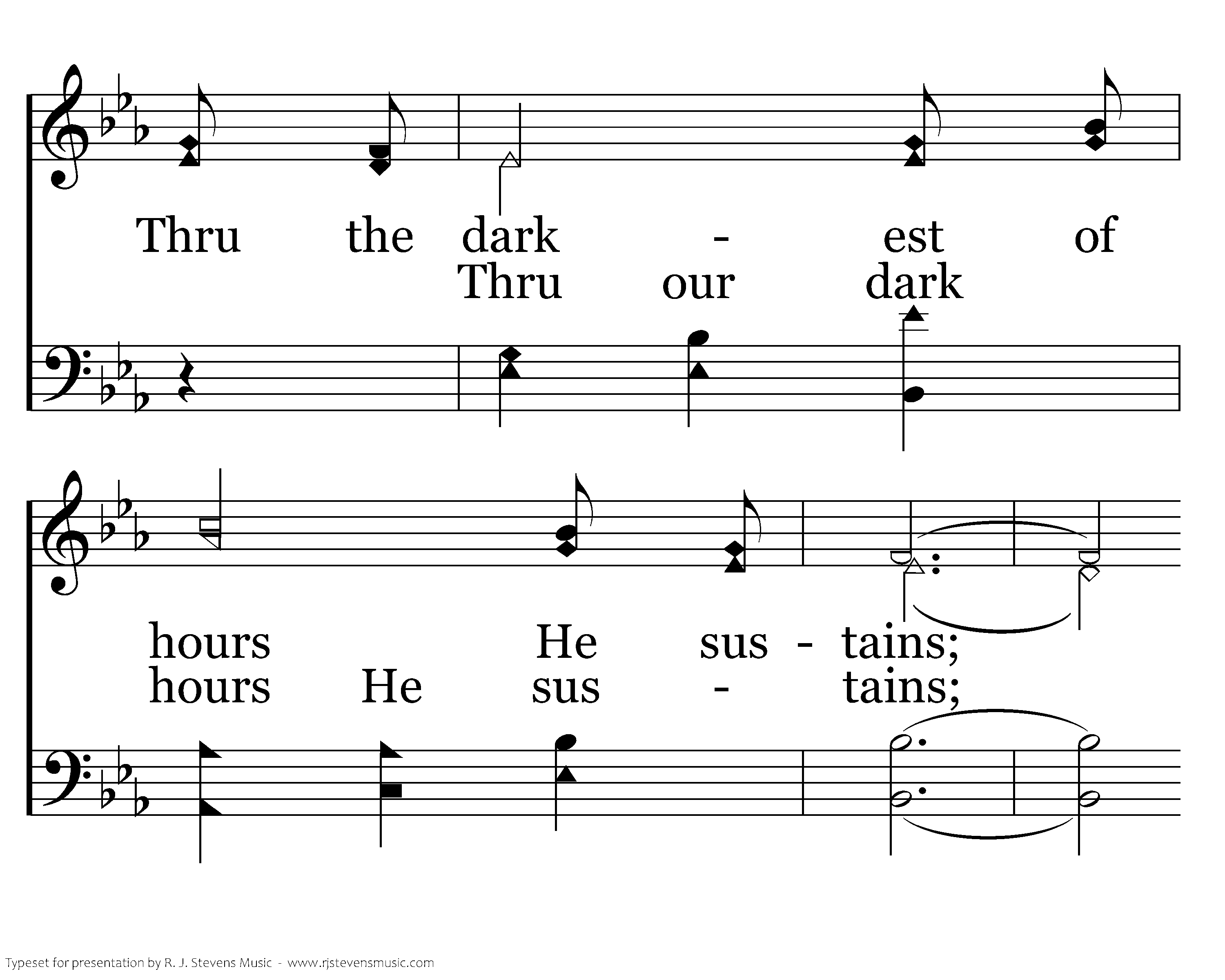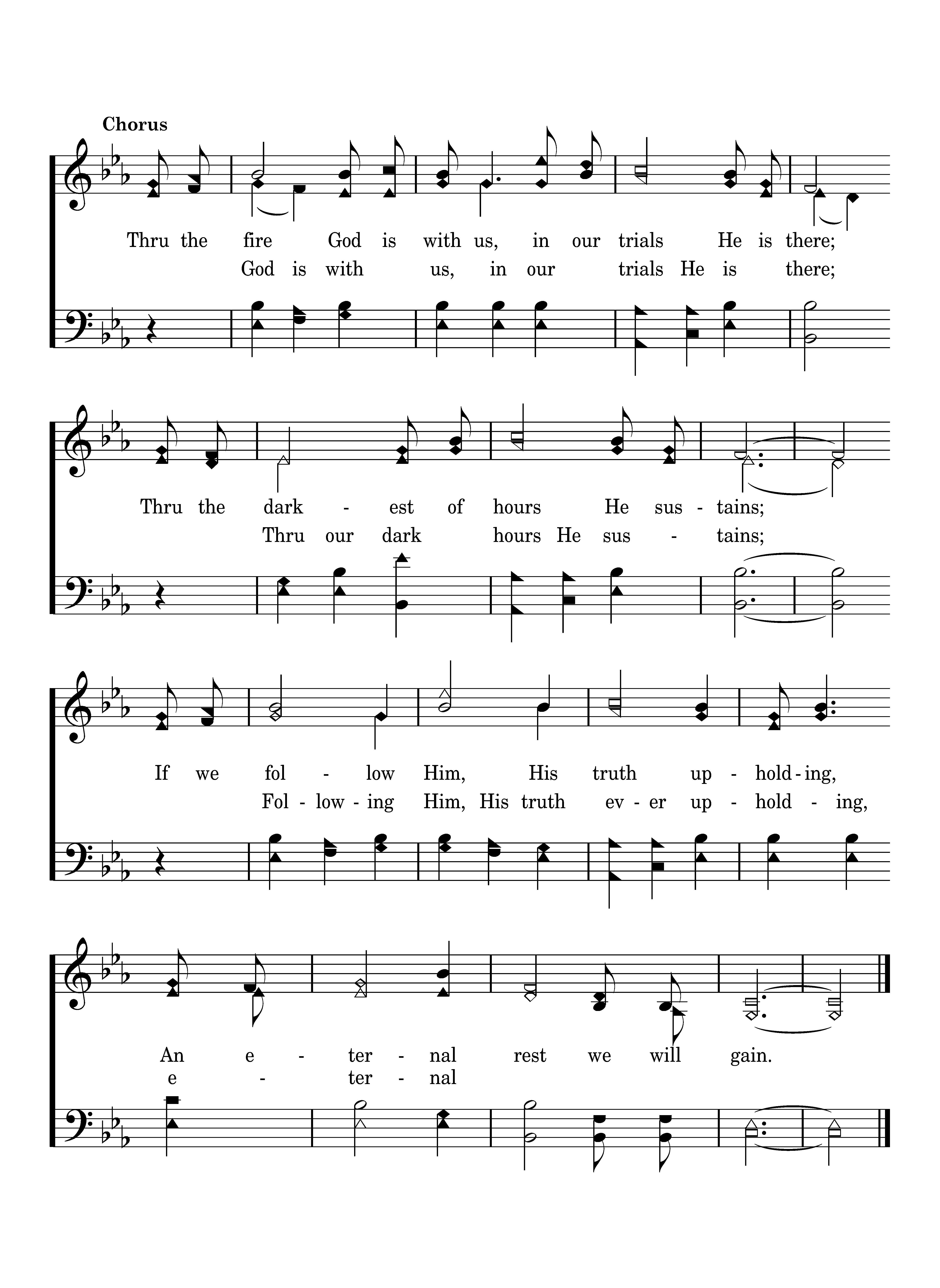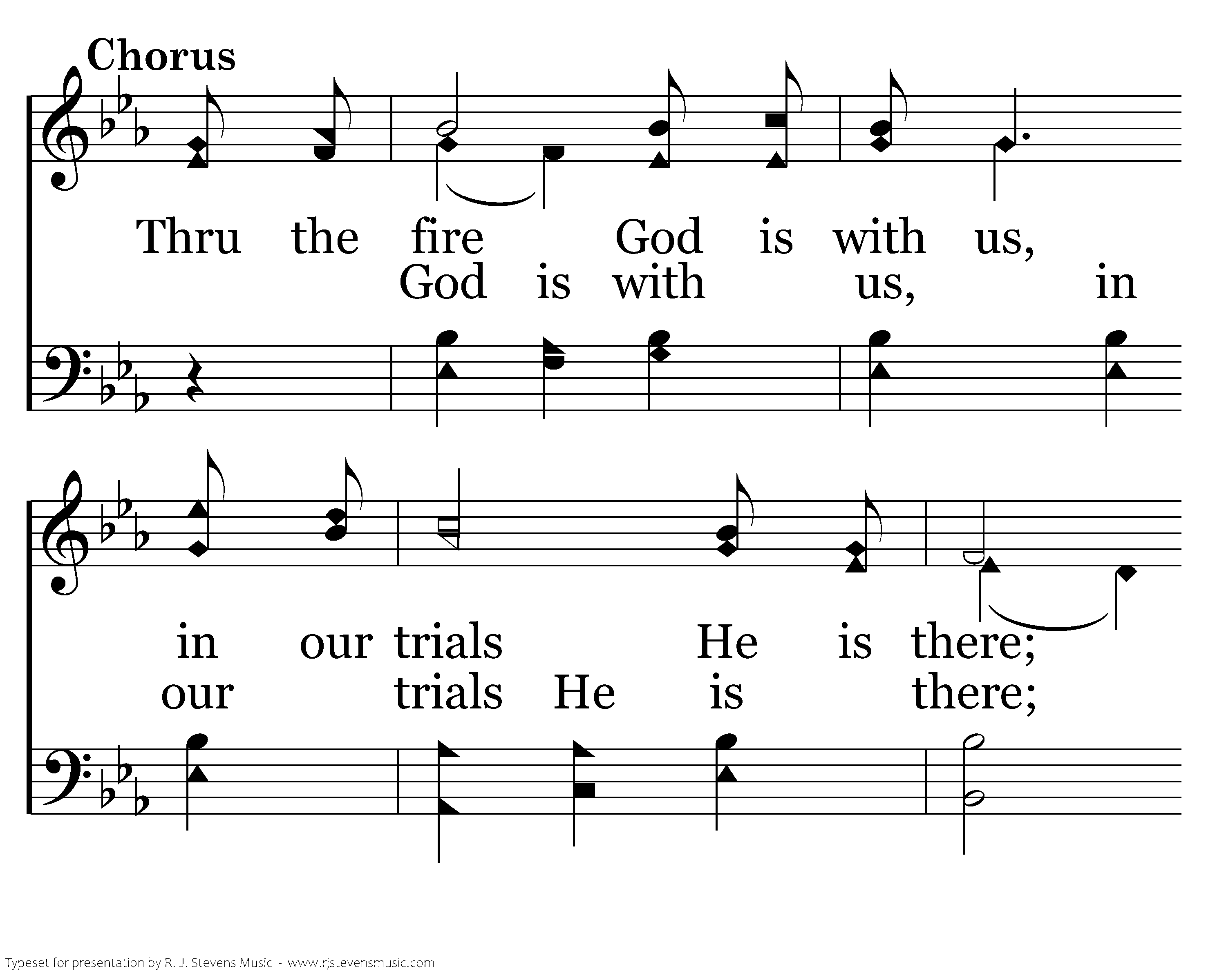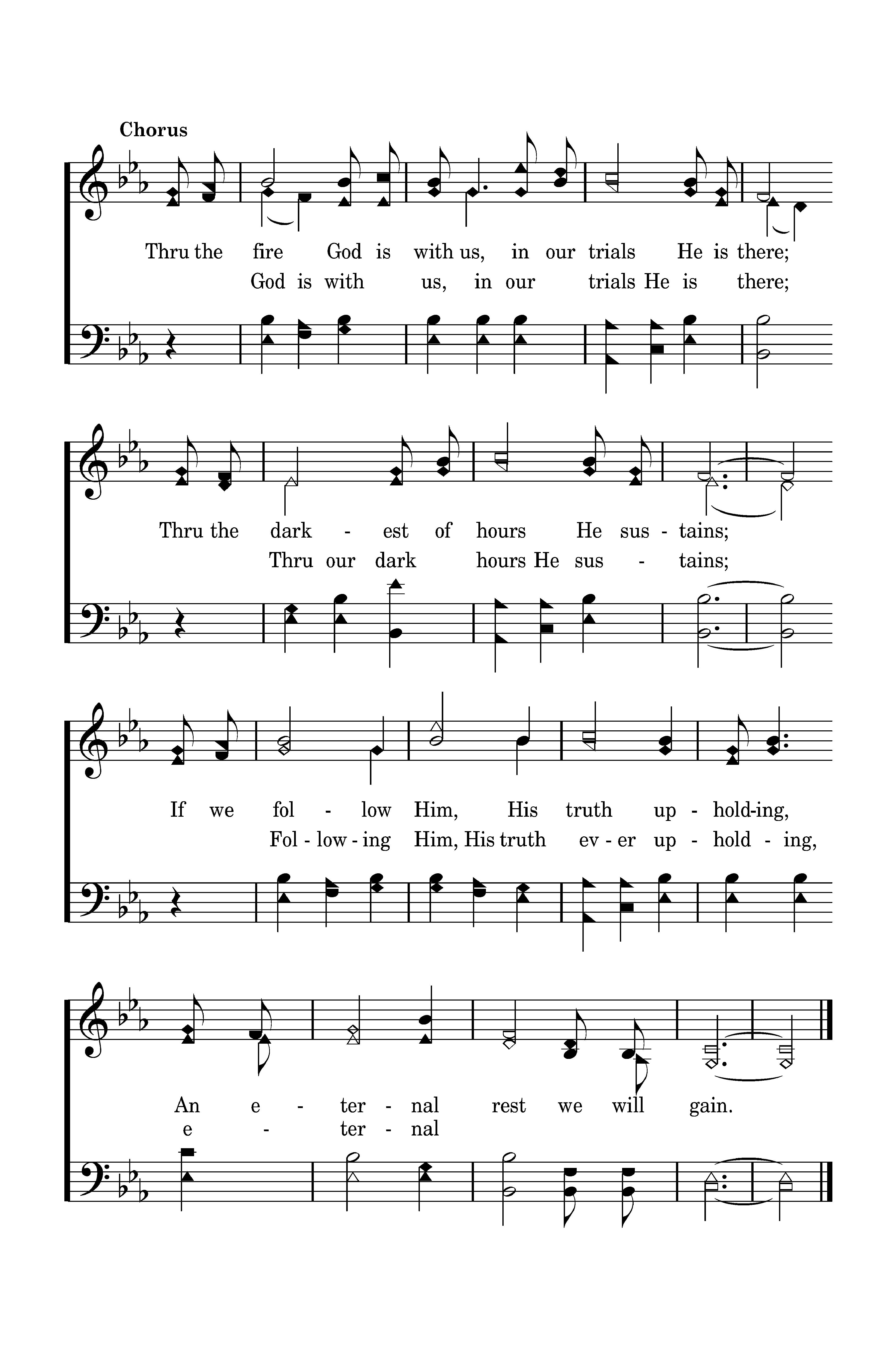 Thru the fire God is with us, in our trials He is there; Thru the darkest of hours He sustains; If we follow Him, His truth upholding, An eternal rest we will gain.