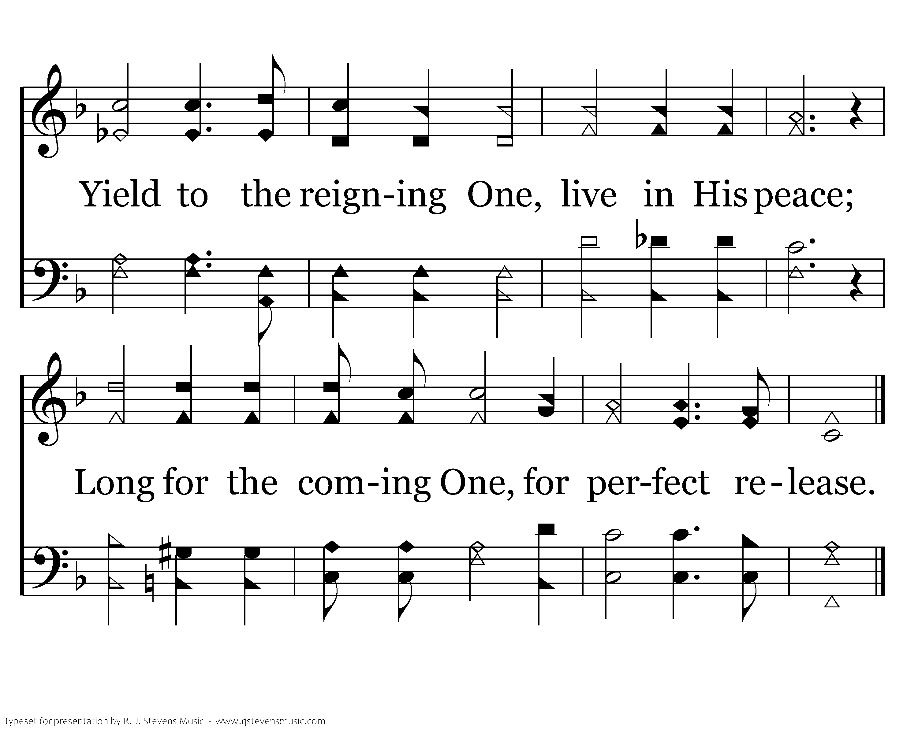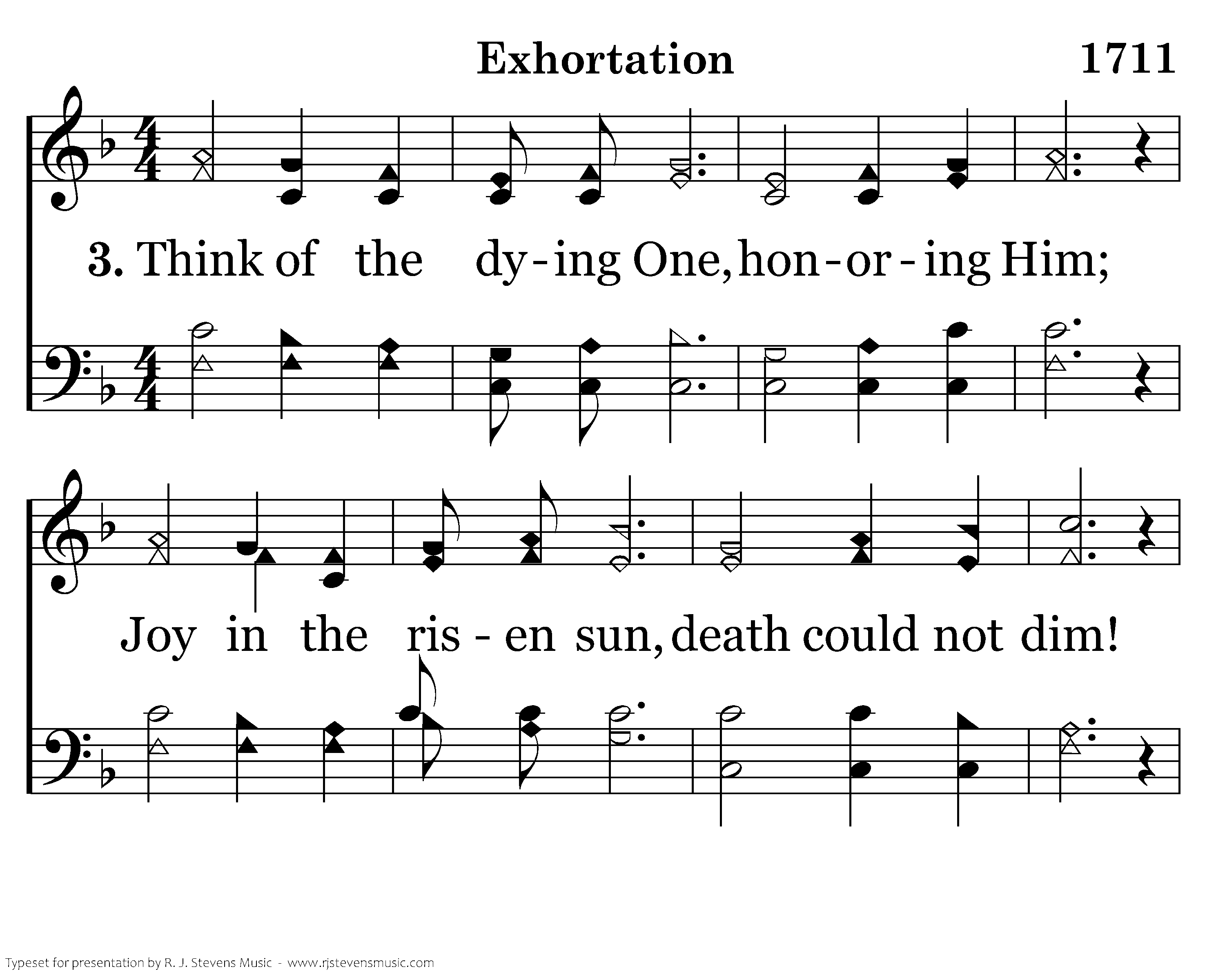 Think of the dying One, honoring Him; Joy in the risen sun, death could not dim! Yield to the reigning One, live in His peace; Long for the coming One, for perfect release.