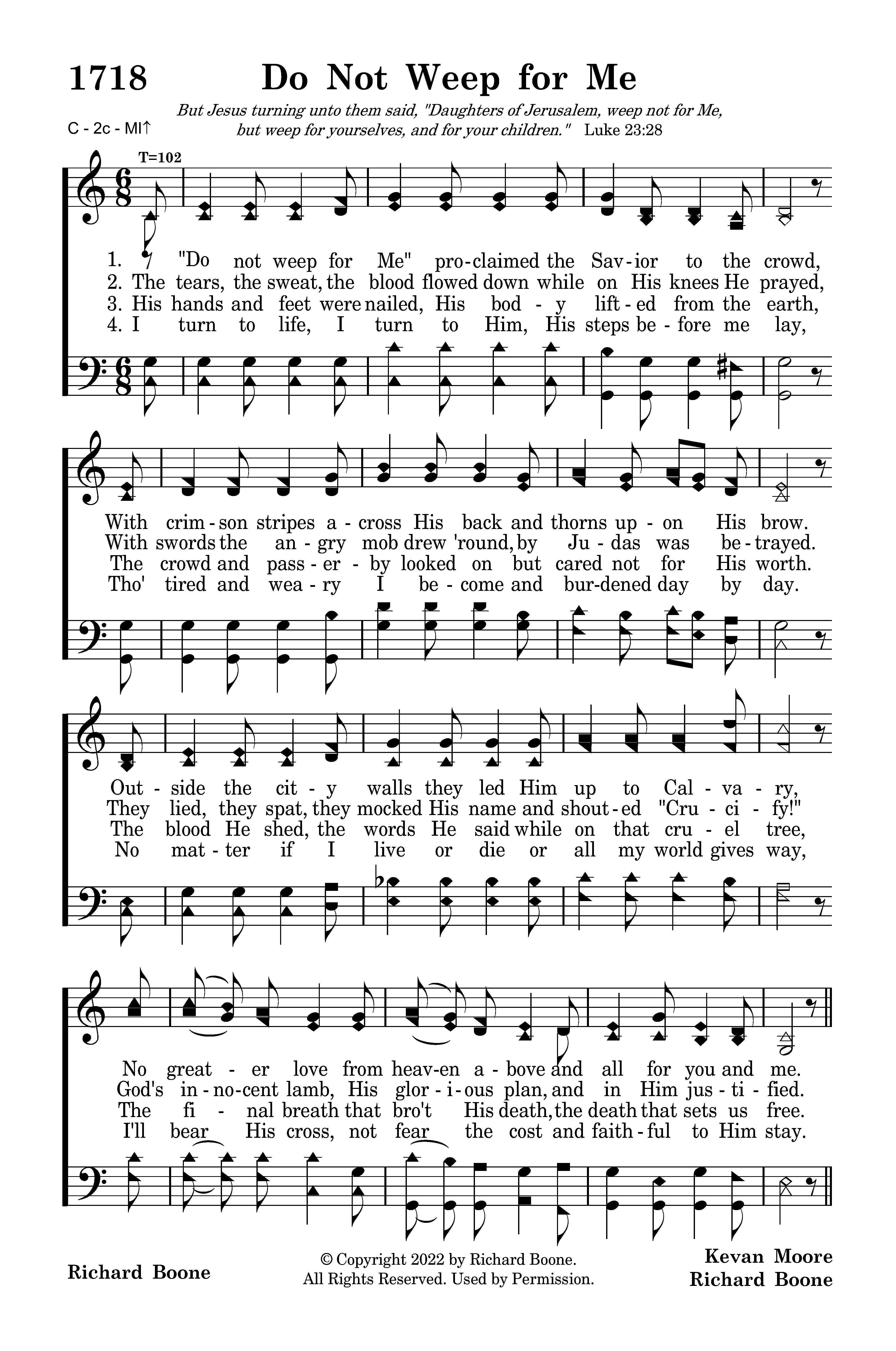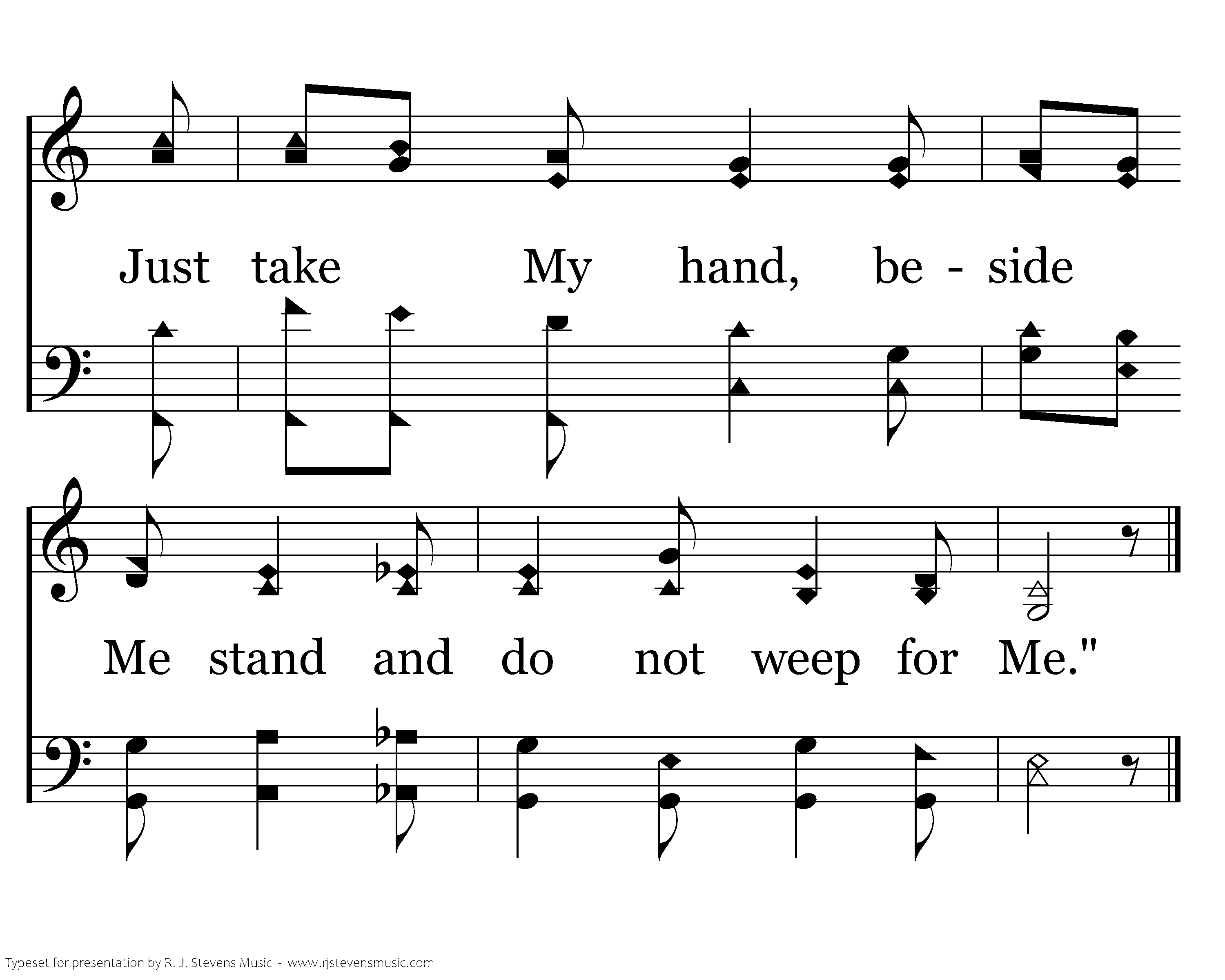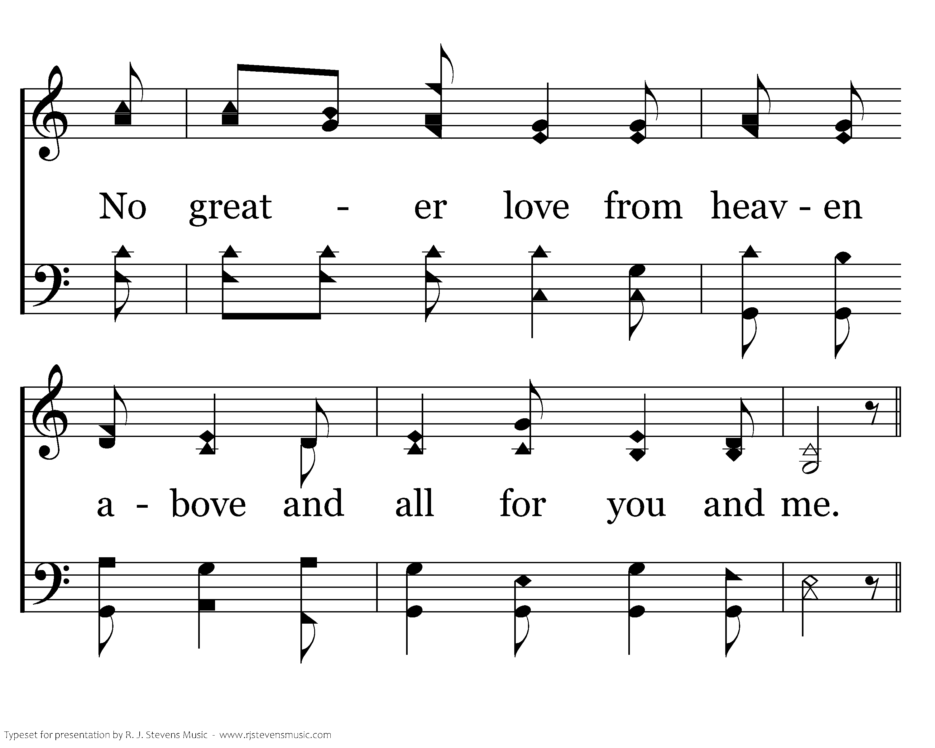 "Do not weep for Me" proclaimed the Savior to the crowd, With crimson stripes across His back and thorns upon His brow. Outside the city walls they led Him up to Calvary, No greater love from heaven above and all for you and me.
