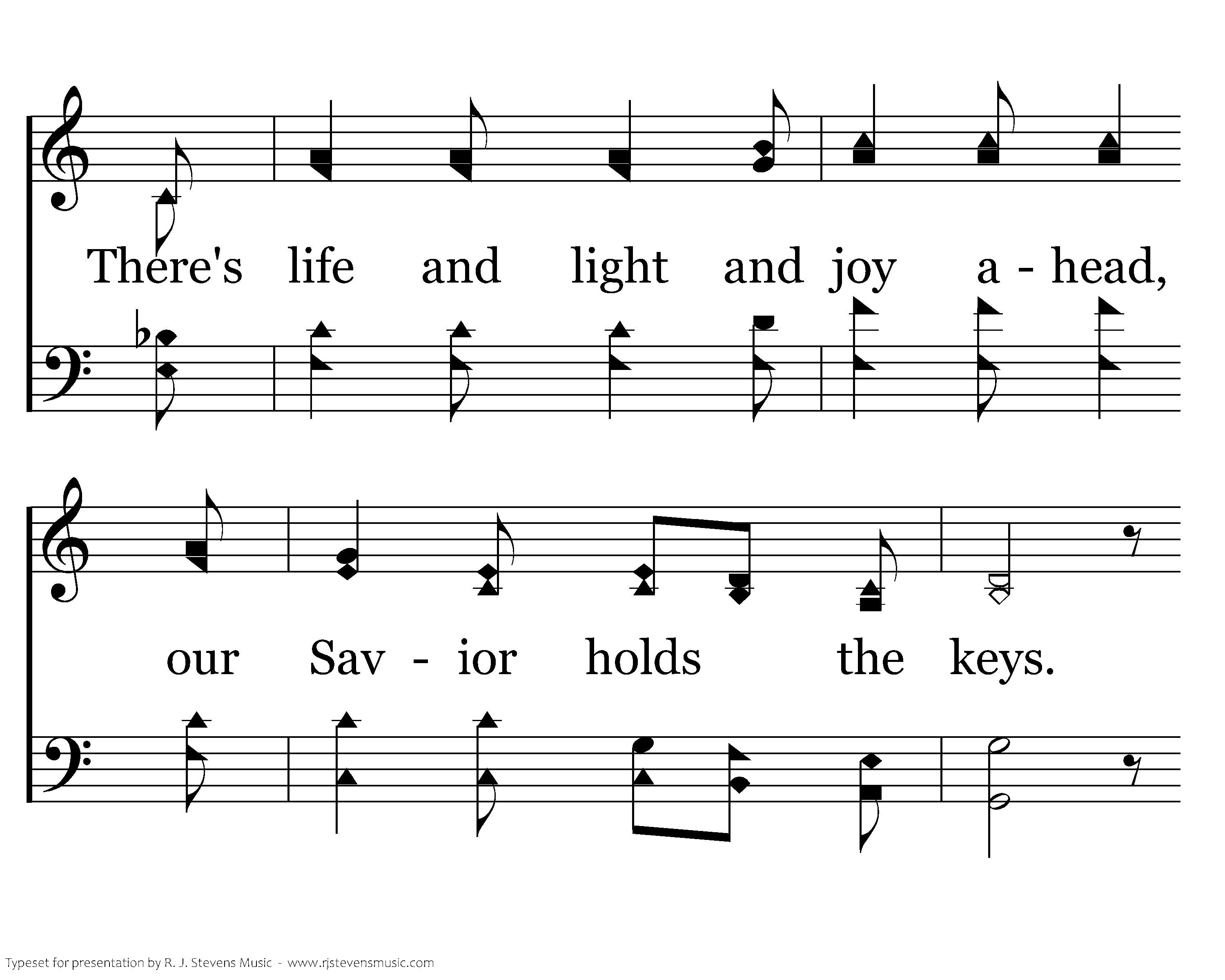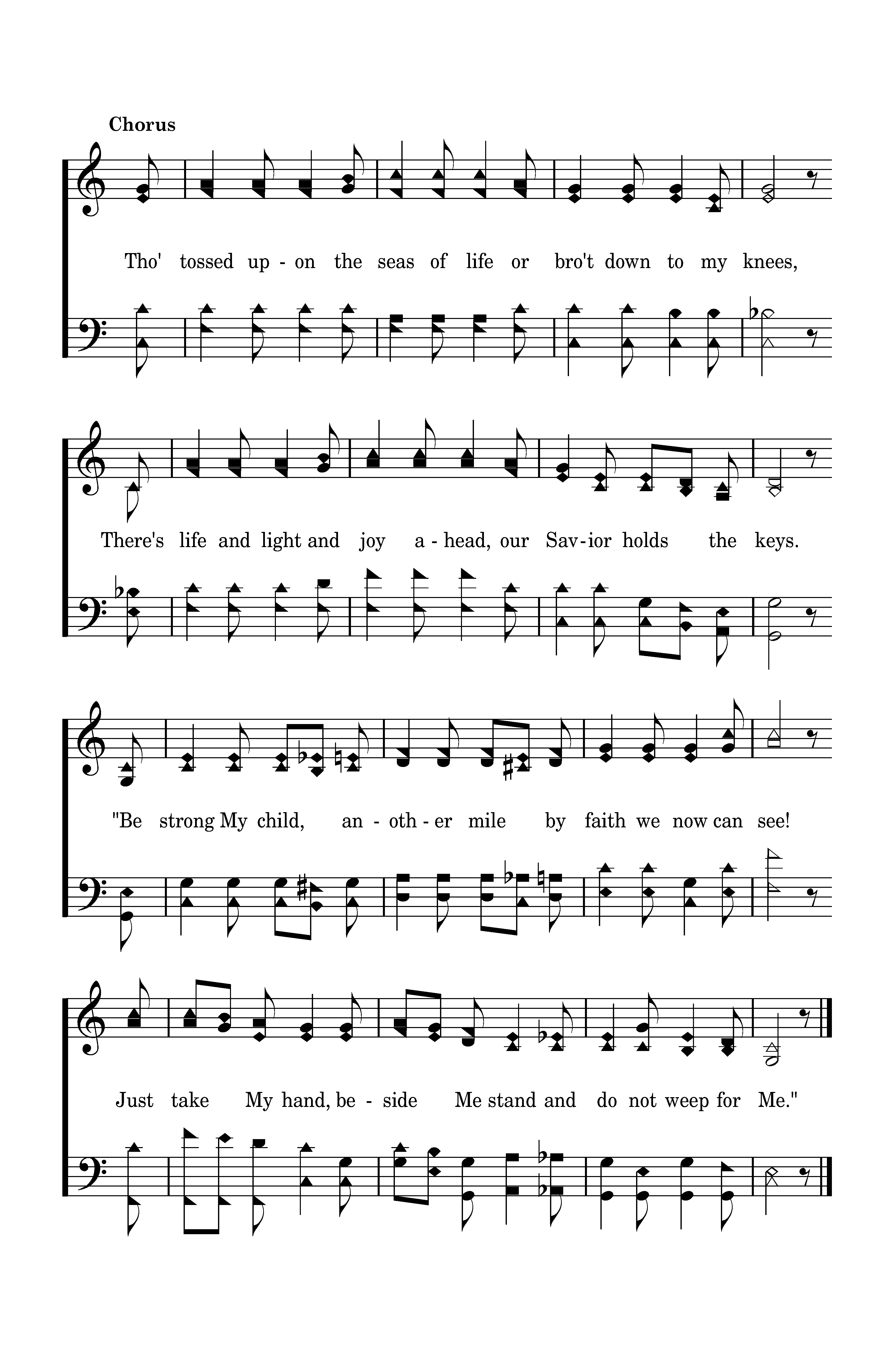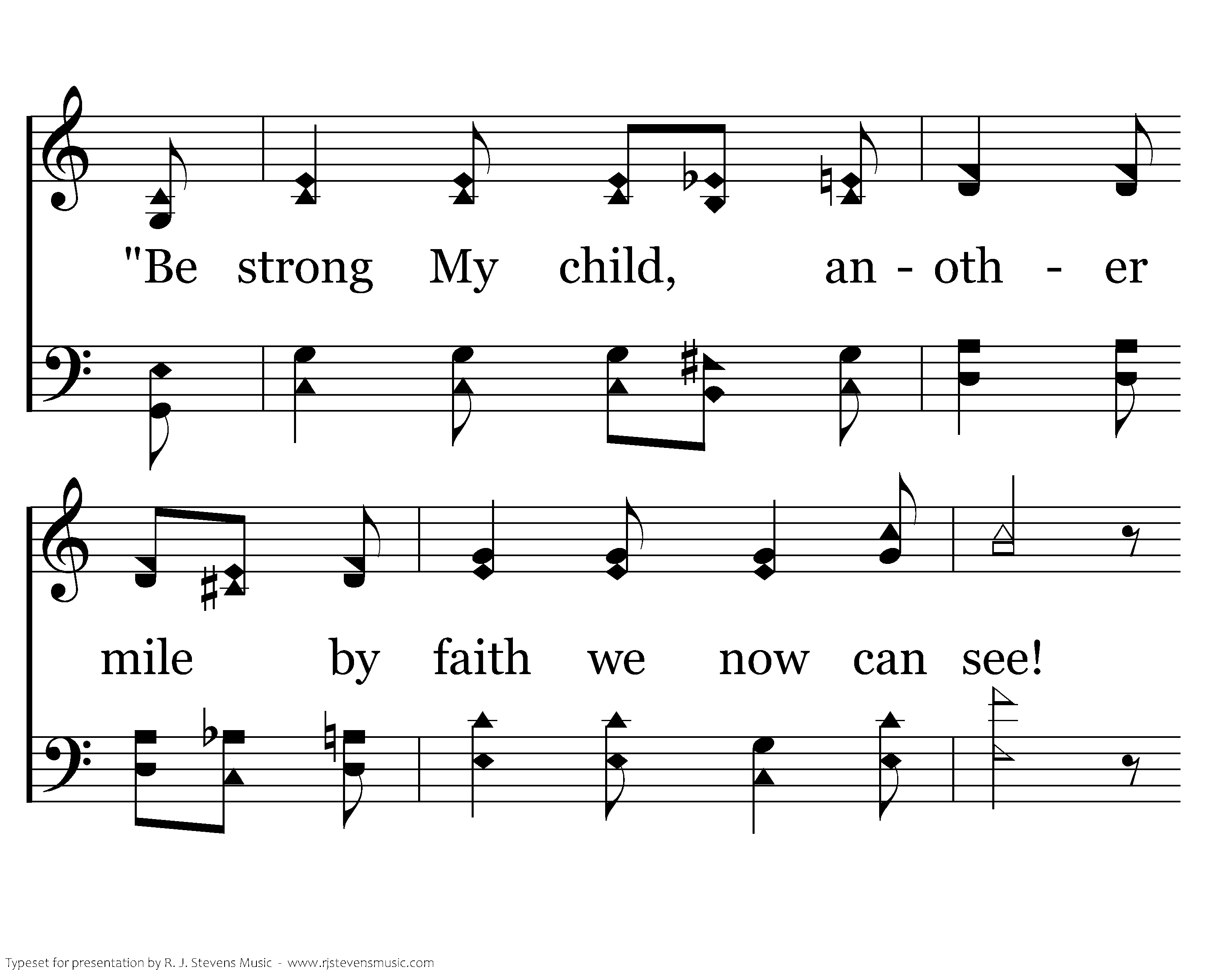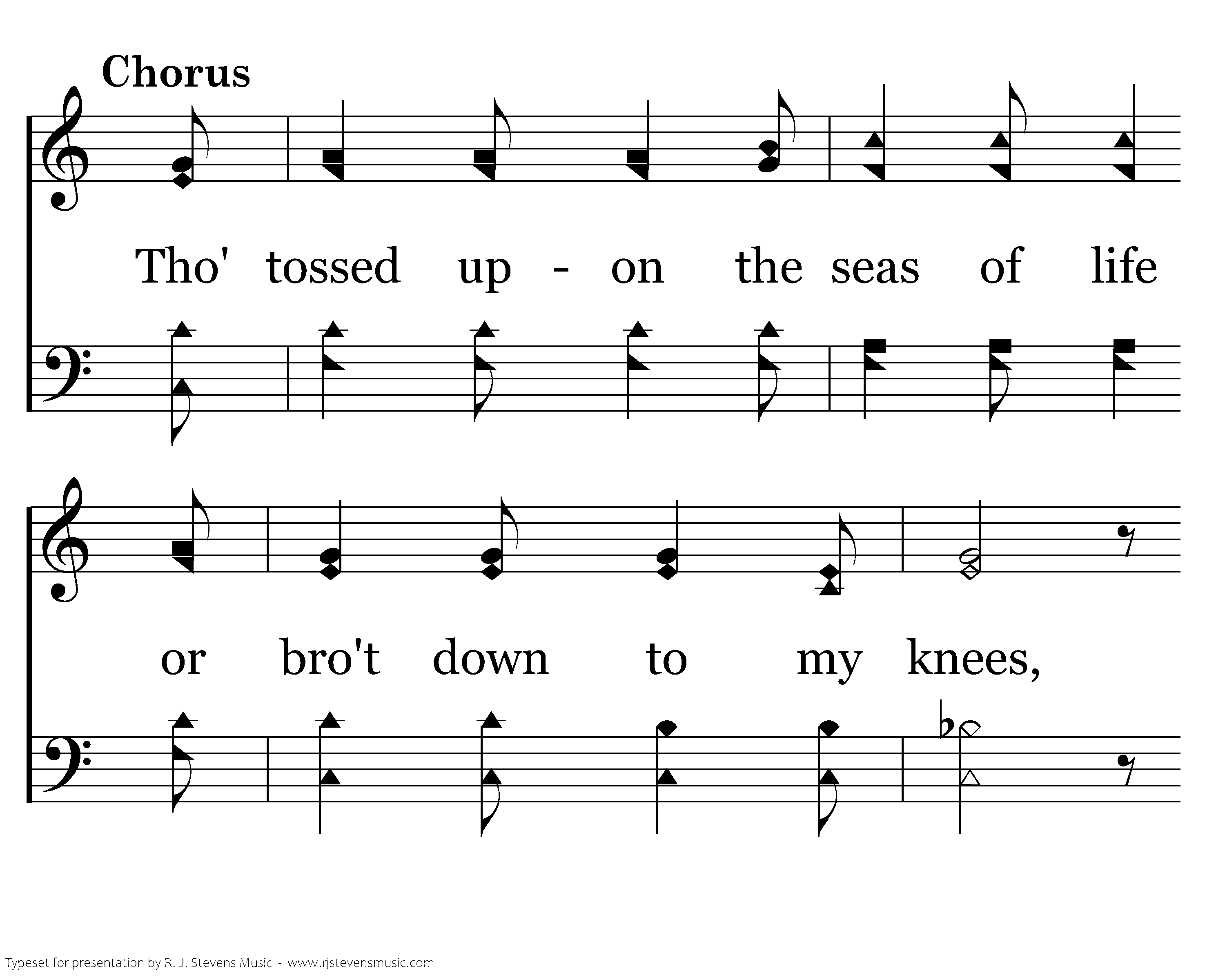 Tho' tossed upon the seas of life or bro't down to my knees, There's life and light and joy ahead, our Savior holds the keys. "Be strong My child, another mile by faith we now can see! Just take My hand, beside Me stand and do not weep for Me."