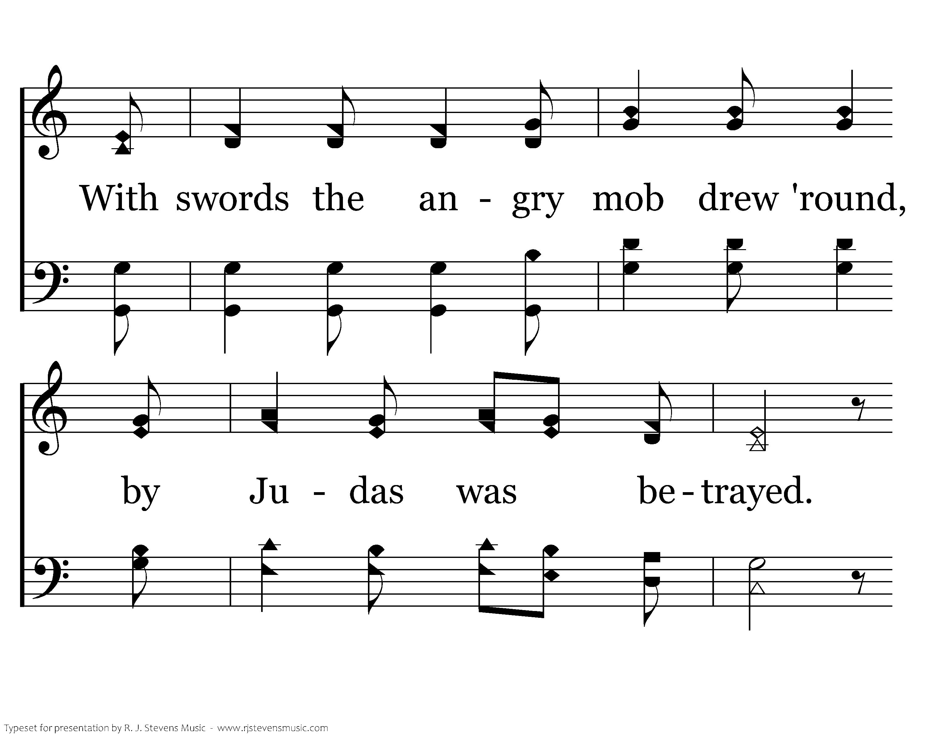 The tears, the sweat, the blood flowed down while on His knees He prayed, With swords the angry mob drew 'round, by Judas was betrayed. They lied, they spat, they mocked His name and shouted "Crucify!" God's innocent lamb, His glorious plan, and in Him justified.