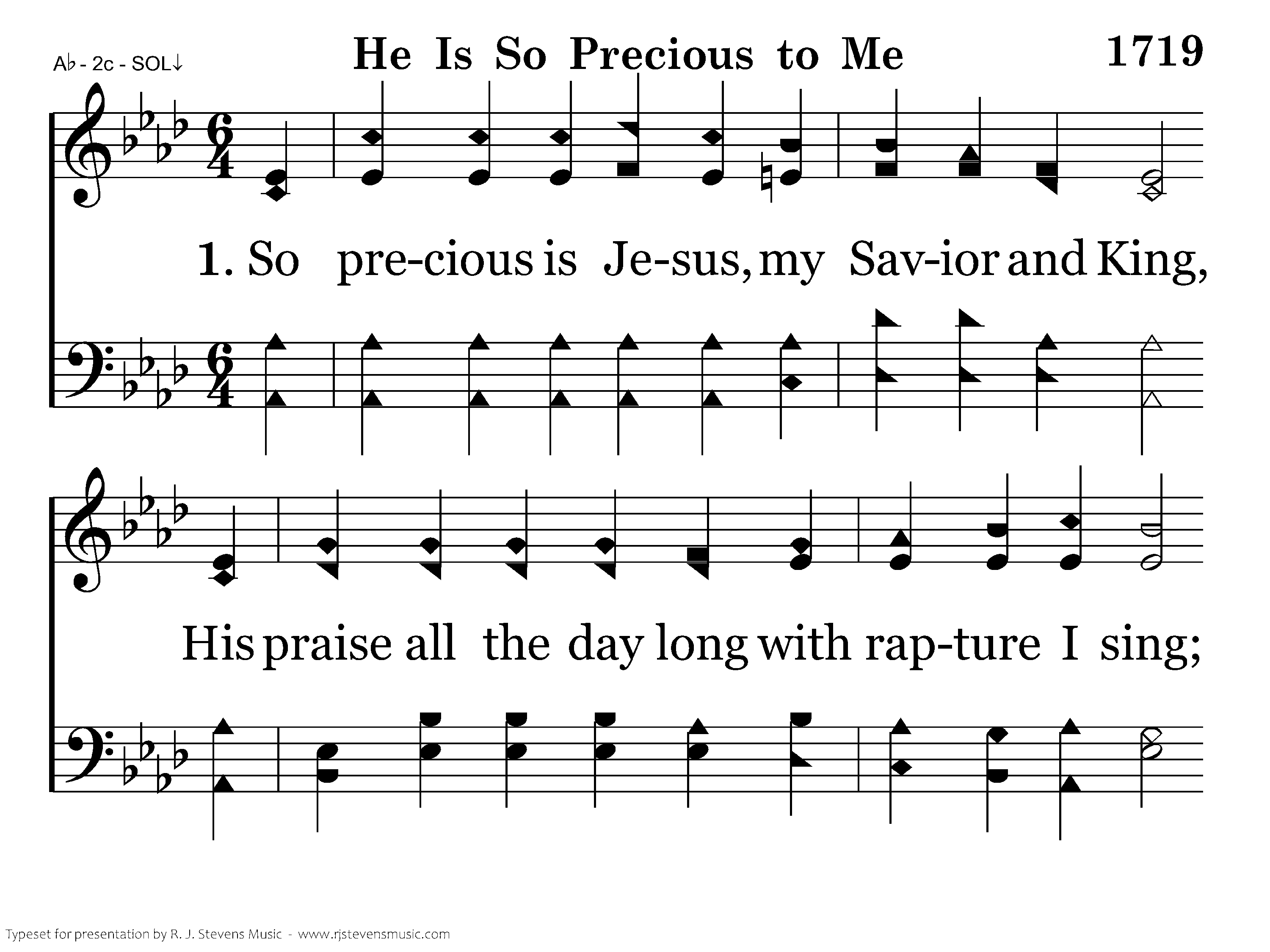 So precious is Jesus, my Savior and King, His praise all the day long with rapture I sing; To Him in my weakness for strength I can cling, For He is so precious to me.