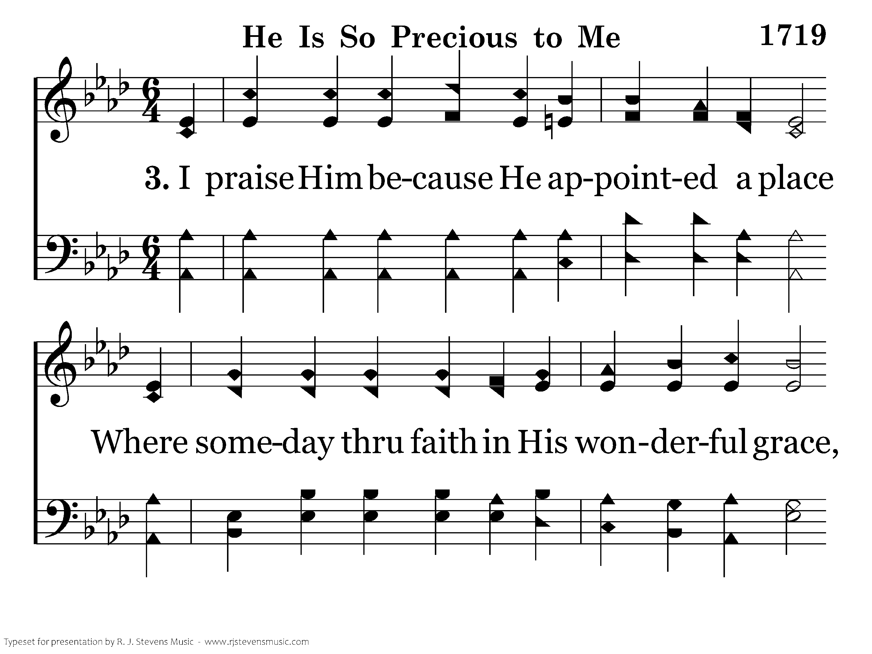 I praise Him because He appointed a place Where someday thru faith in His wonderful grace, I know I shall see Him and look on His face, For He is so precious to me.
