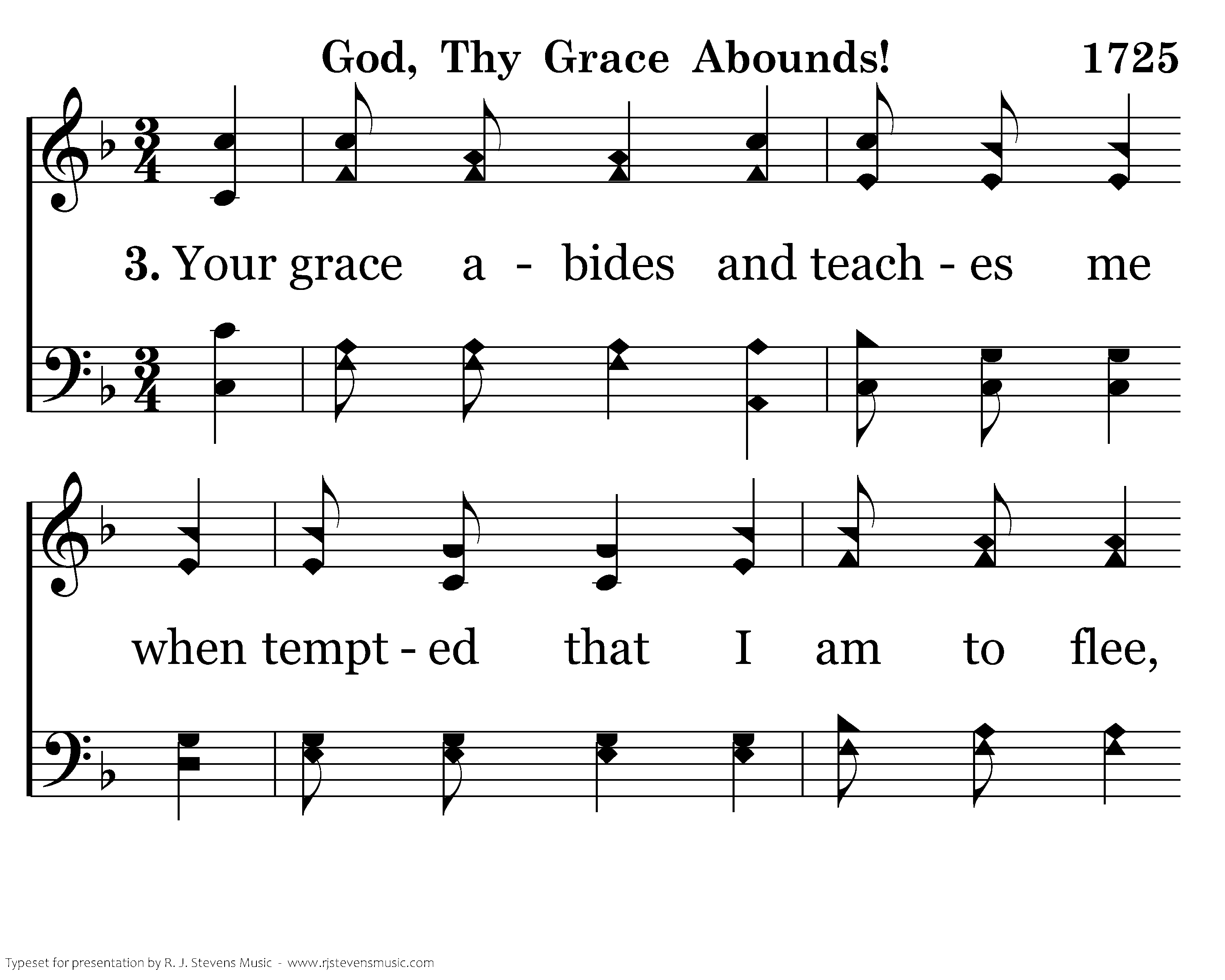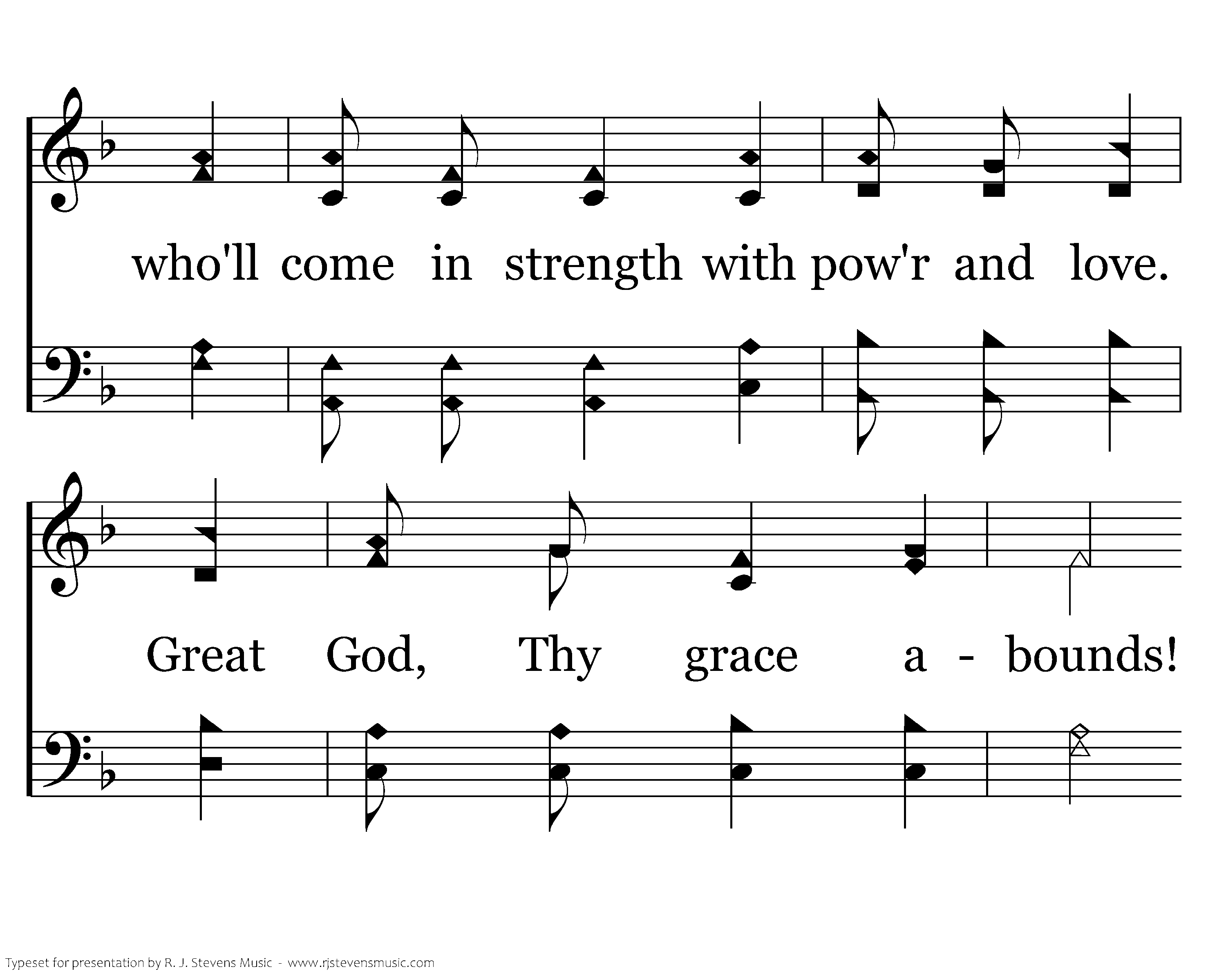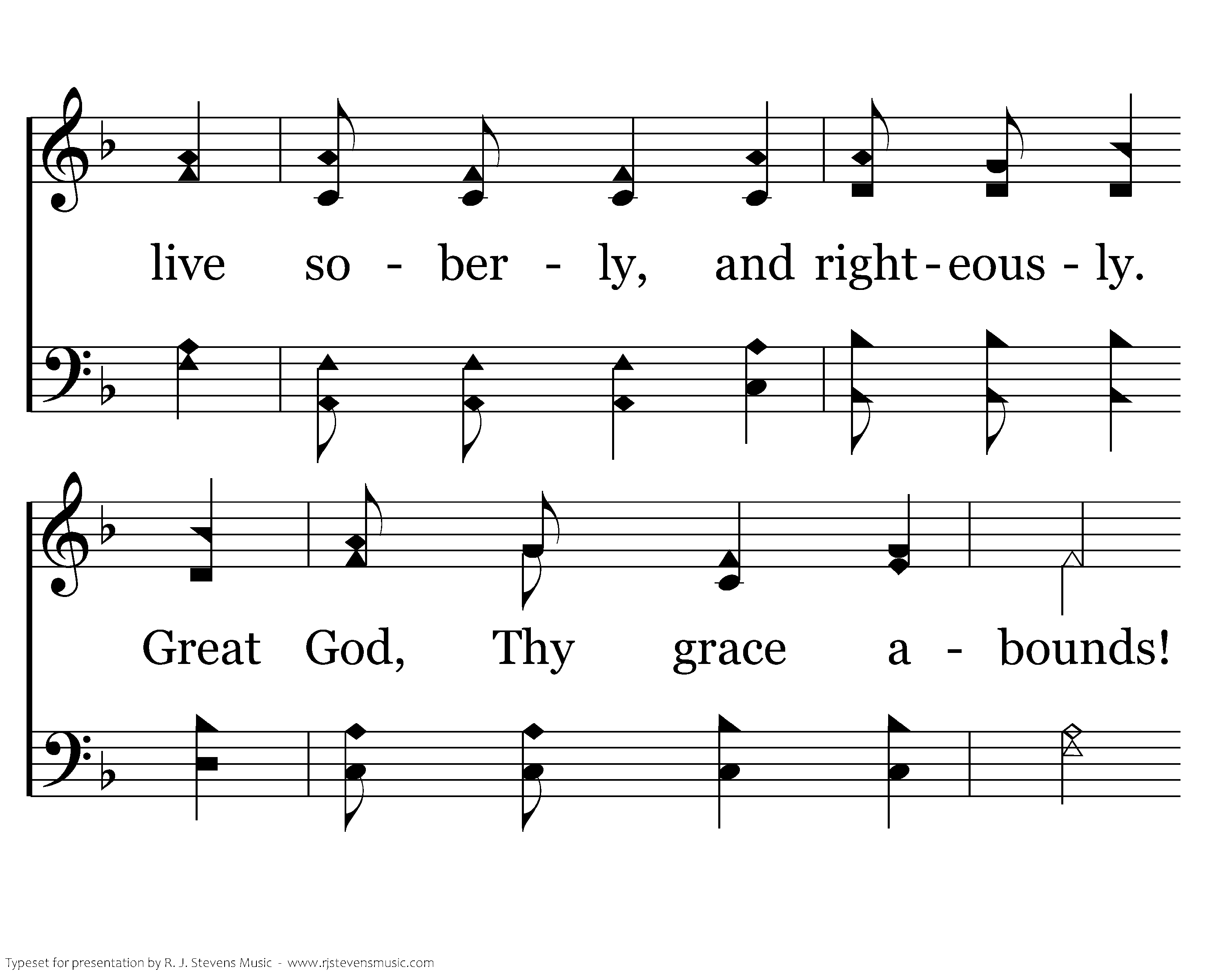 Your grace abides and teaches me when tempted that I am to flee, live soberly, and righteously. Great God, Thy grace abounds! I'm looking for the coming of my Lord and King from Heav'n above who'll come in strength with pow'r and love. Great God, Thy grace abounds! Great God, Thy grace abounds!