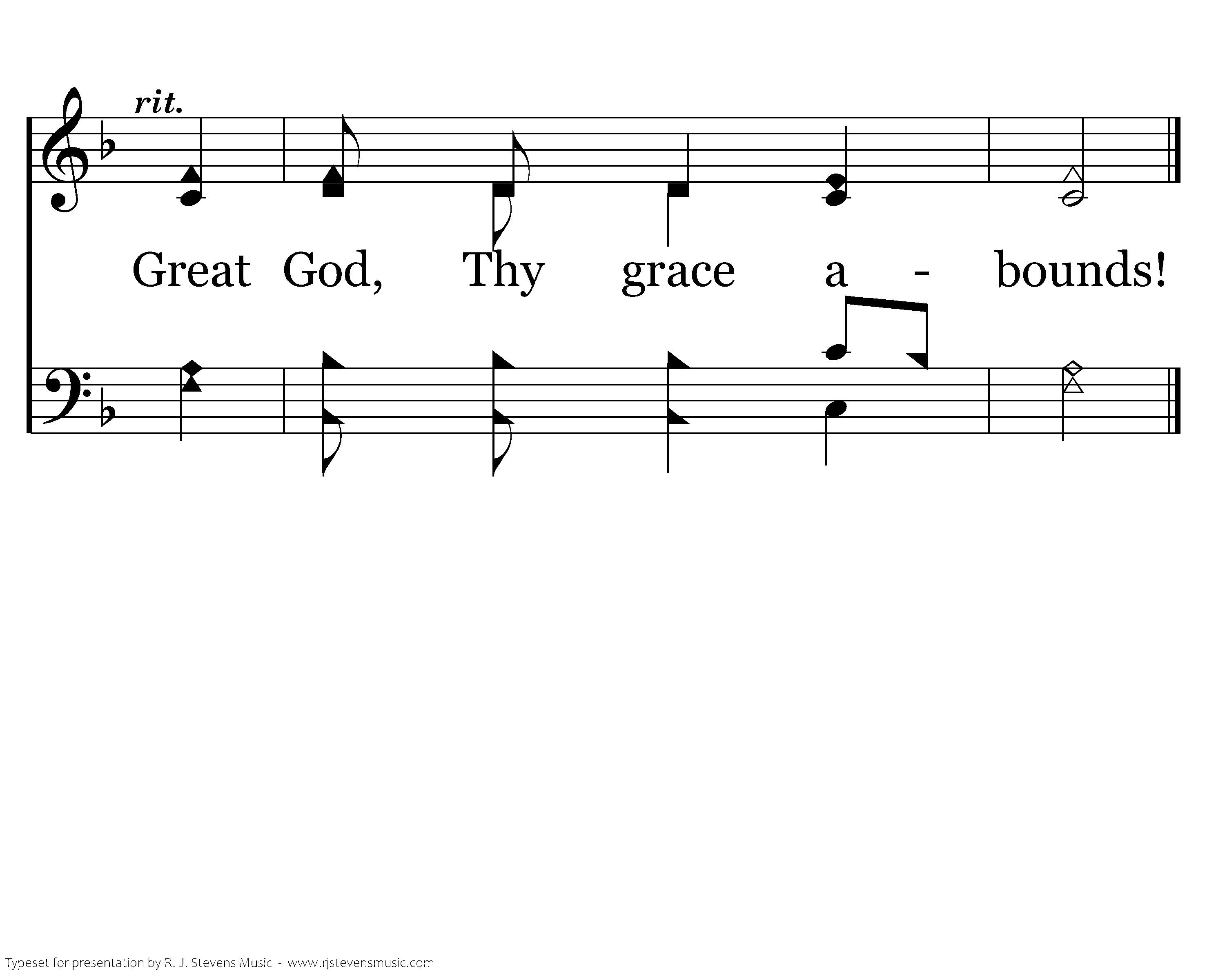 Now wiped away the sin so dread, You've buried that old man of death, and now I rise to live again. Great God, Thy grace abounds! The cov'nant made without a hand according to Your working plan; alive in Christ, immersed I am. Great God, Thy grace abounds! Great God, Thy grace abounds!