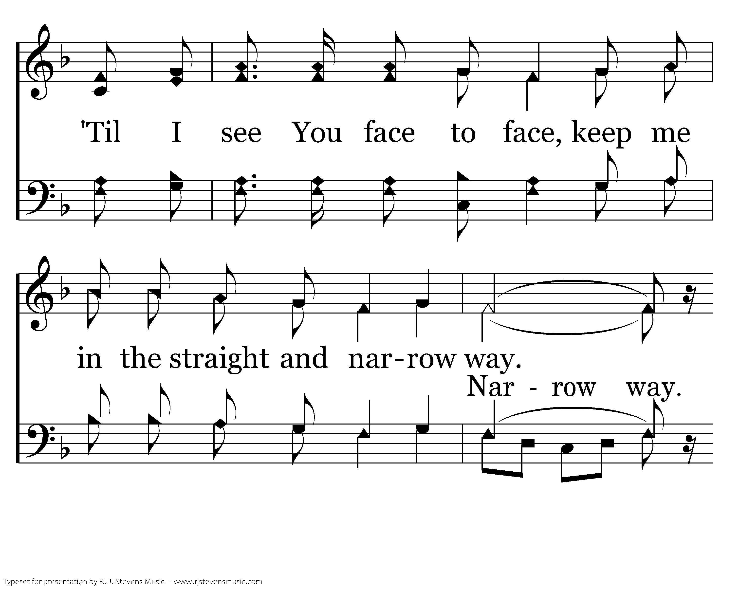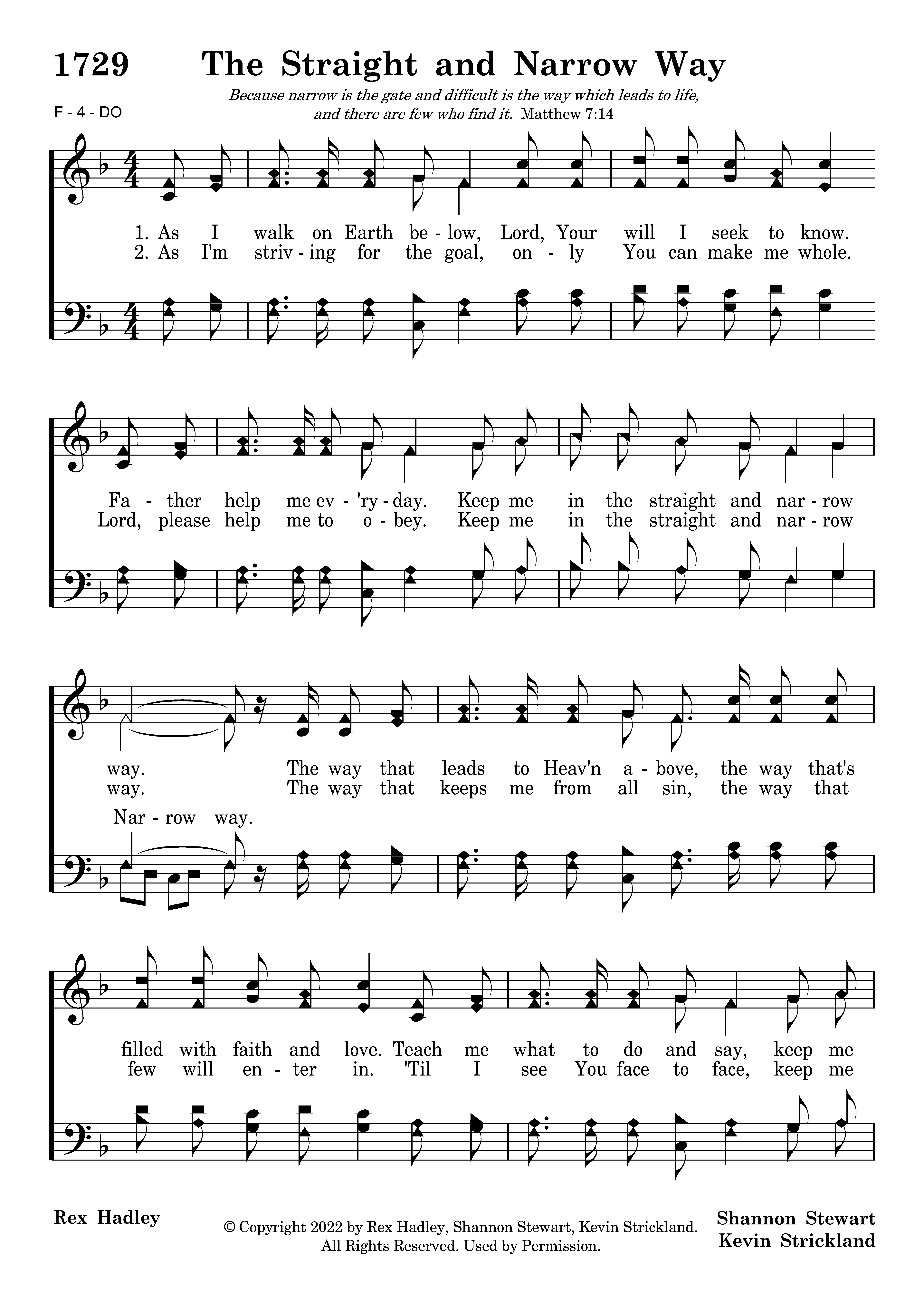 As I walk on Earth below, Lord, Your will I seek to know. Father help me ev'ryday. Keep me in the straight and narrow way. The way that leads to Heav'n above, the way that's filled with faith and love. Teach me what to do and say, keep me in the straight and narrow way. For there's a dark and troubled side of life filled with hatred, envy, and strife; but there's a bright and sunny side too, when we seek the Lord's will to do. So I kneel to you and pray; help me, help me ev'ry day. Keep me in the straight and narrow way.