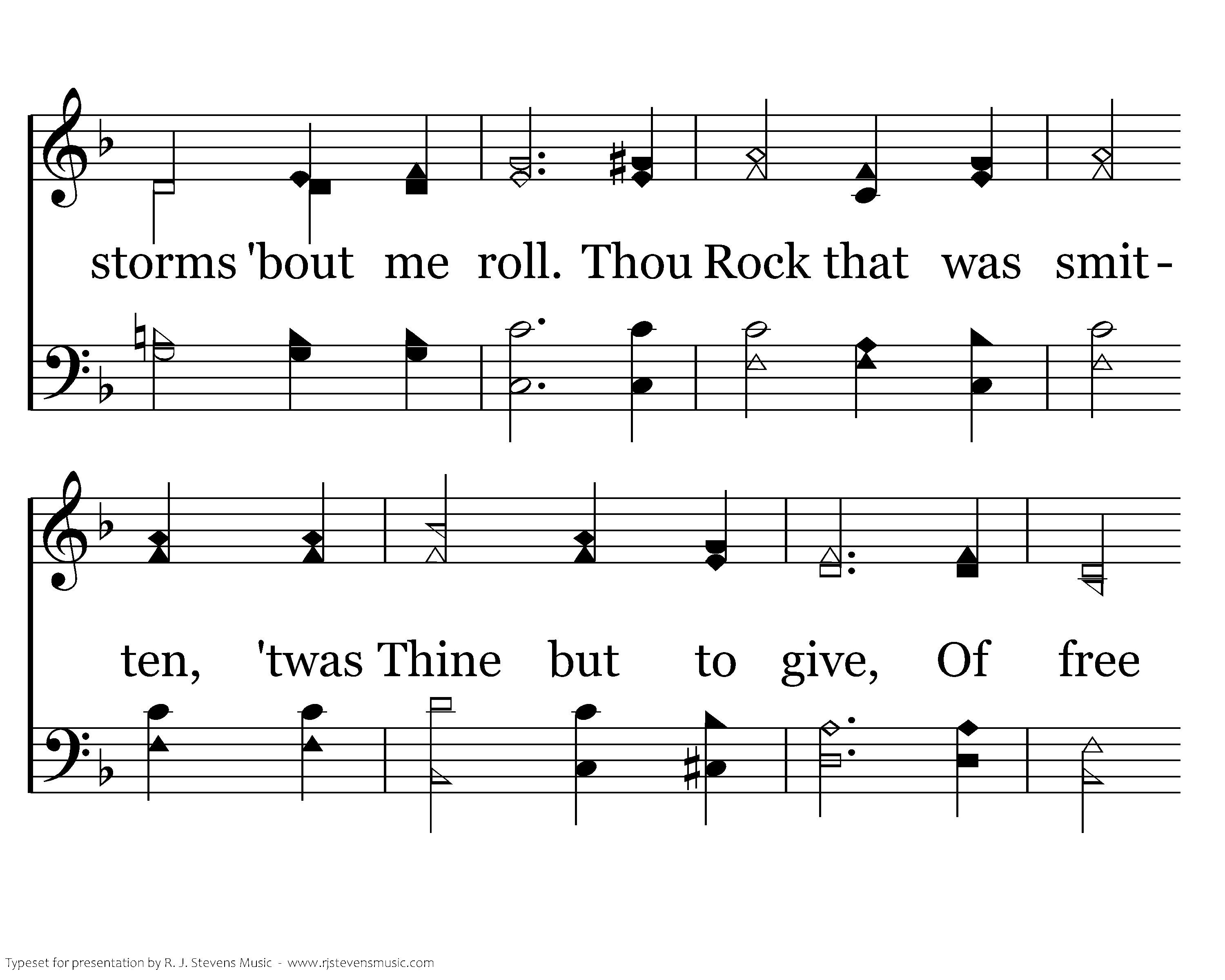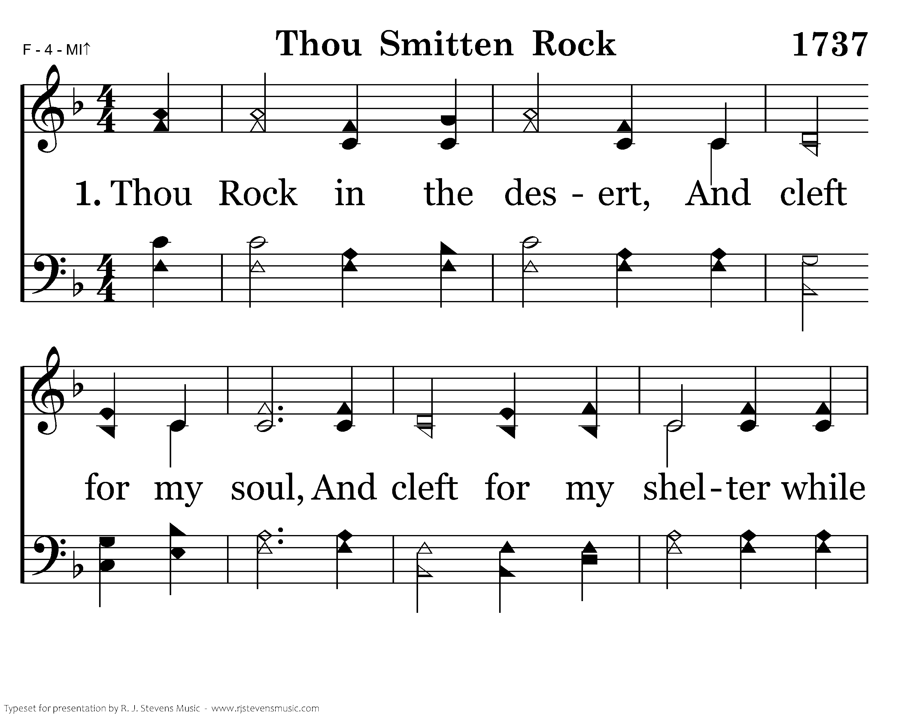 Thou Rock in the desert, And cleft for my soul, And cleft for my shelter while storms 'bout me roll. Thou Rock that was smitten, 'twas Thine but to give, Of free flowing waters, That helps me to live.