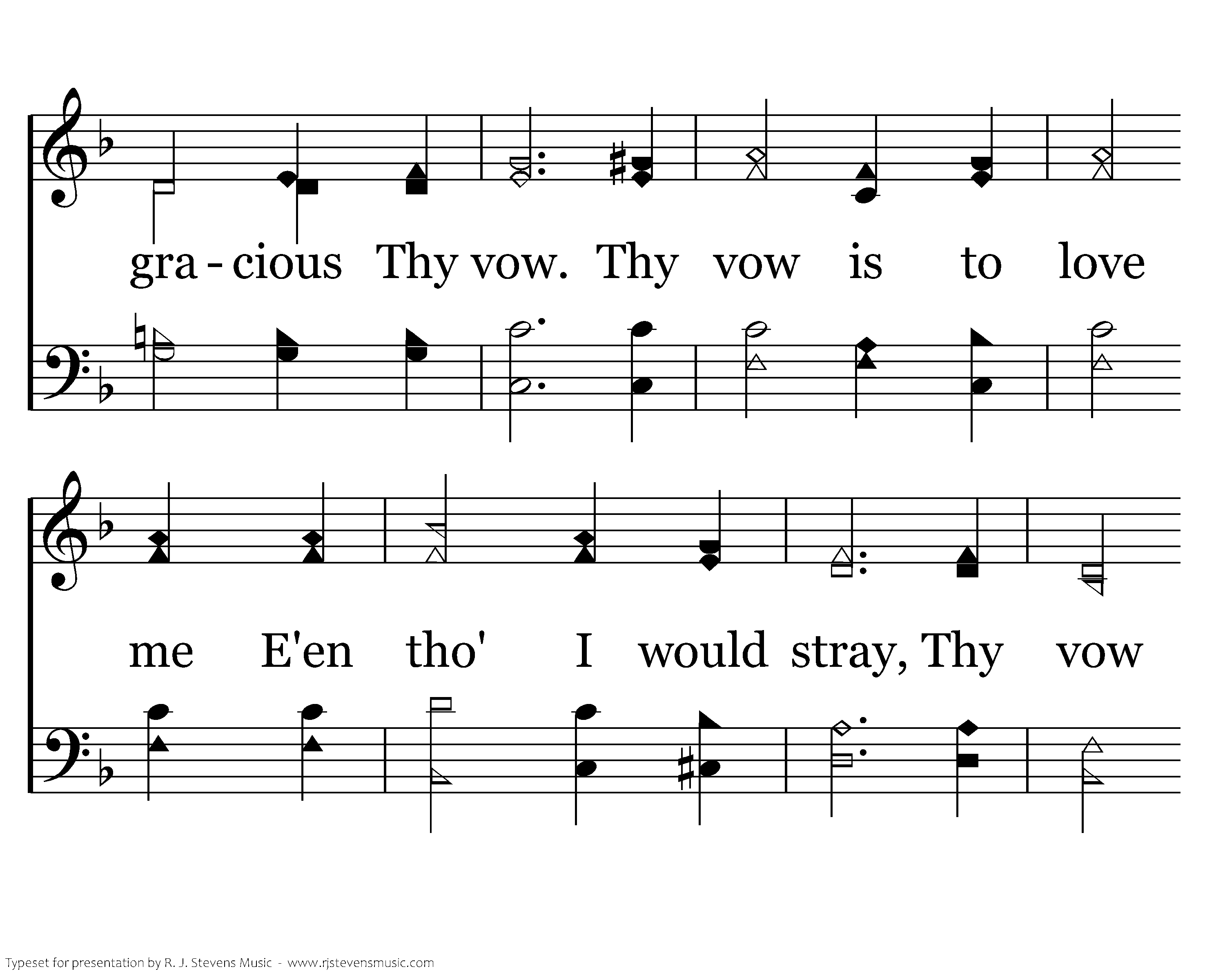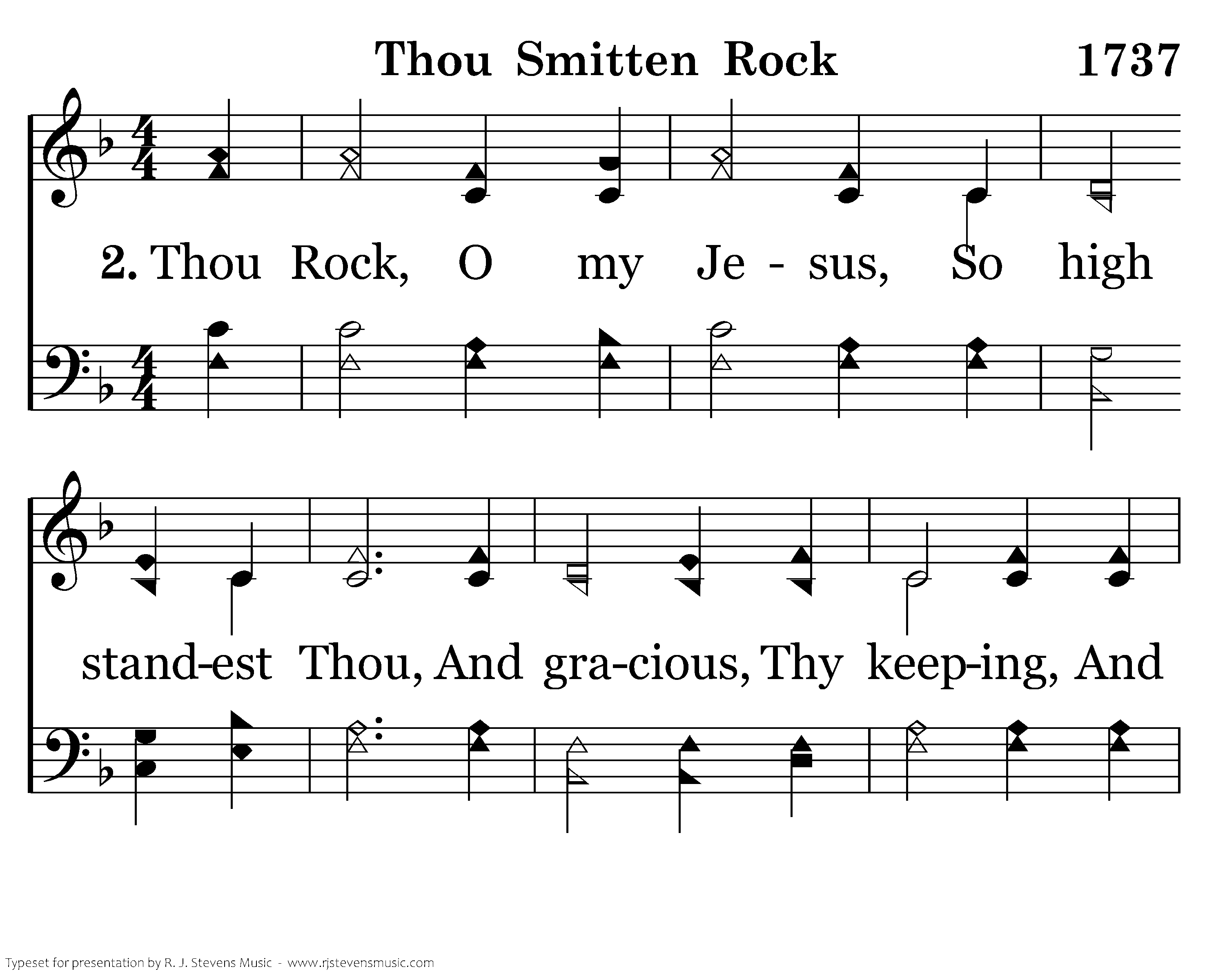 Thou Rock, O my Jesus, So high standest Thou, And gracious, Thy keeping, And gracious Thy vow. Thy vow is to love me E'en though I would stray, Thy vow is to keep me, Thru ev'ry long day.