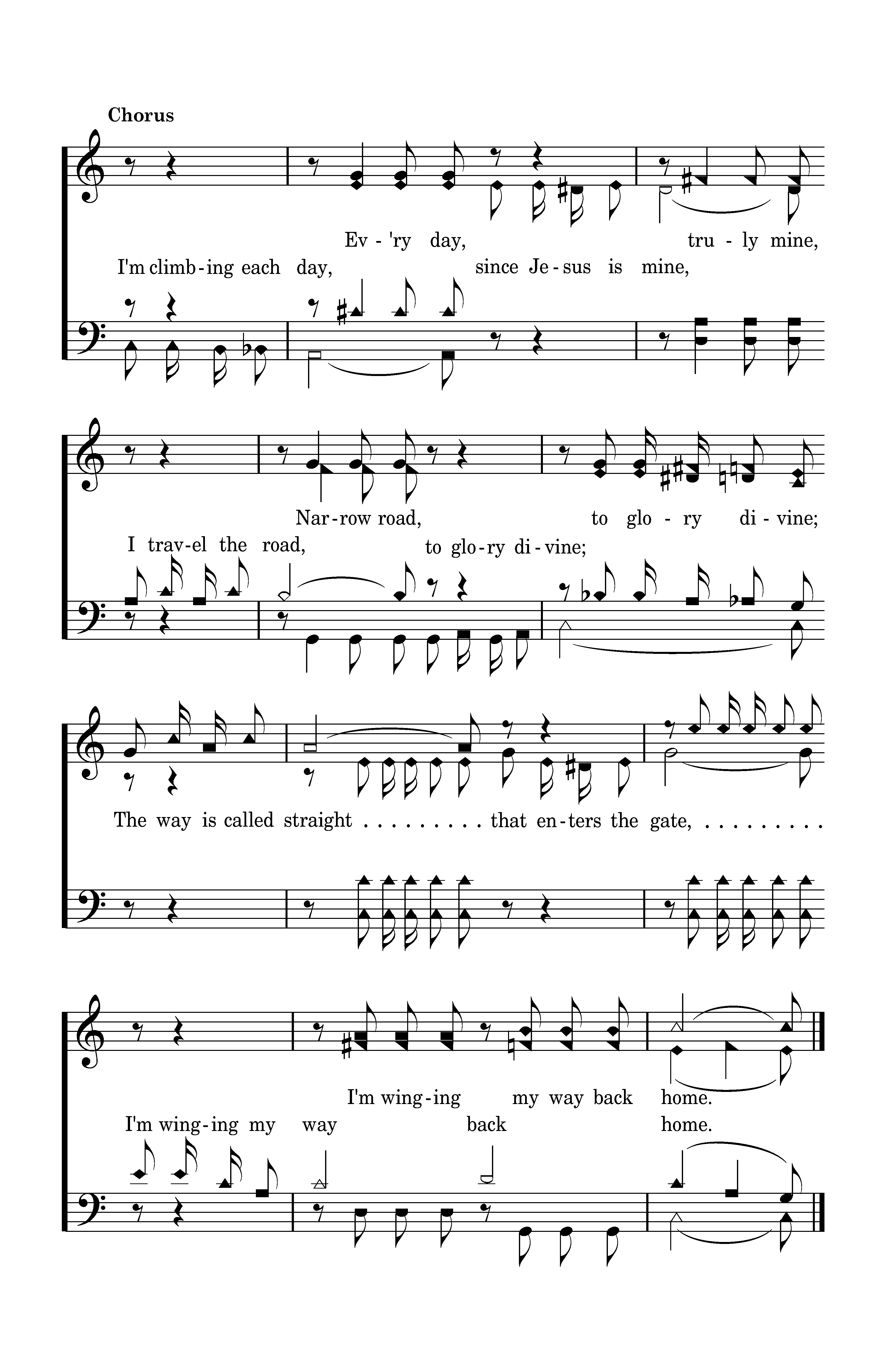 I'm climbing each day, Ev'ry day, truly mine, since Jesus is mine, I travel the road, Narrow road, to glory divine; to glory divine; The way is called straight that enters the gate, I'm winging my way back home. I'm winging my way back home.