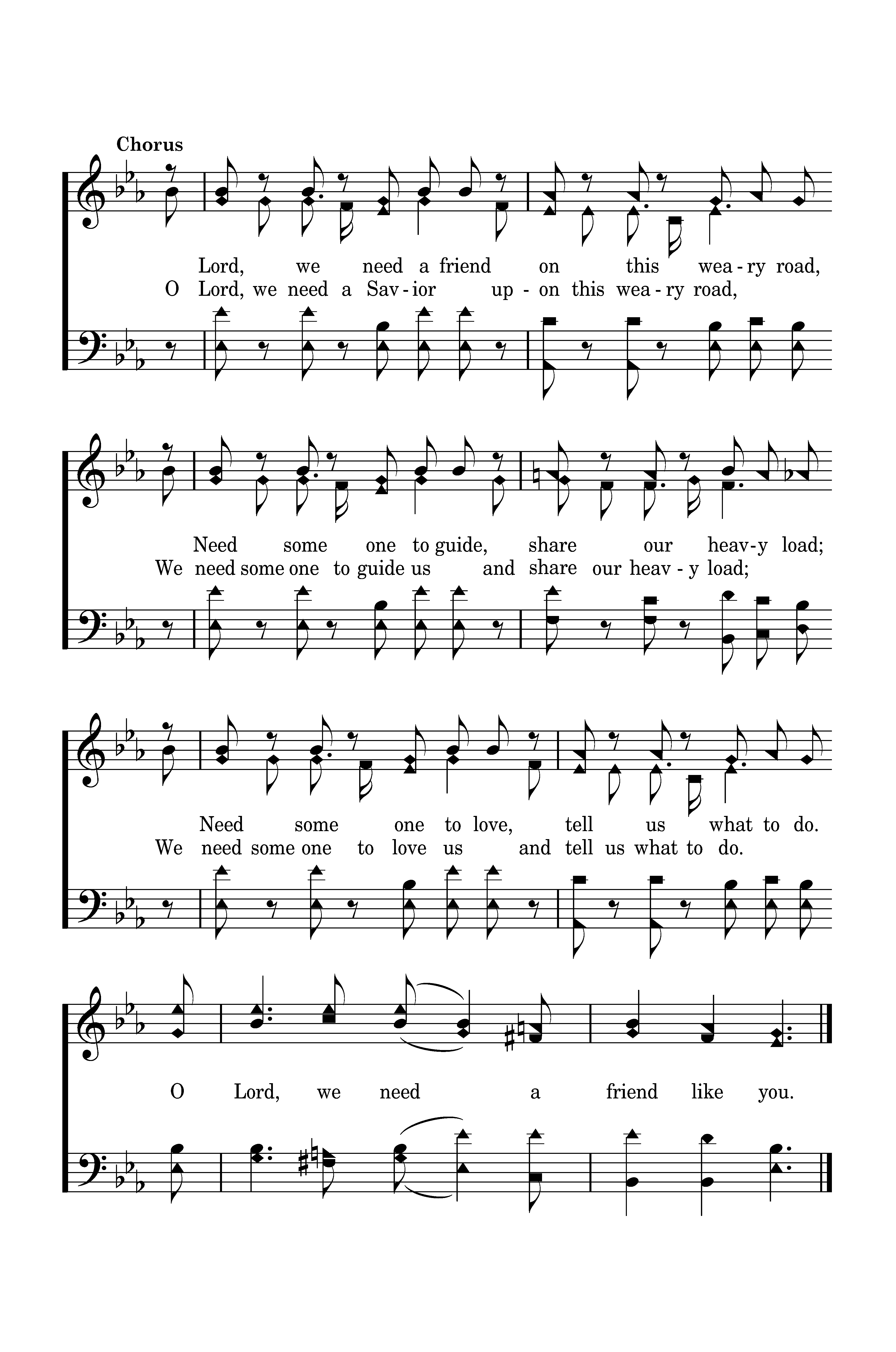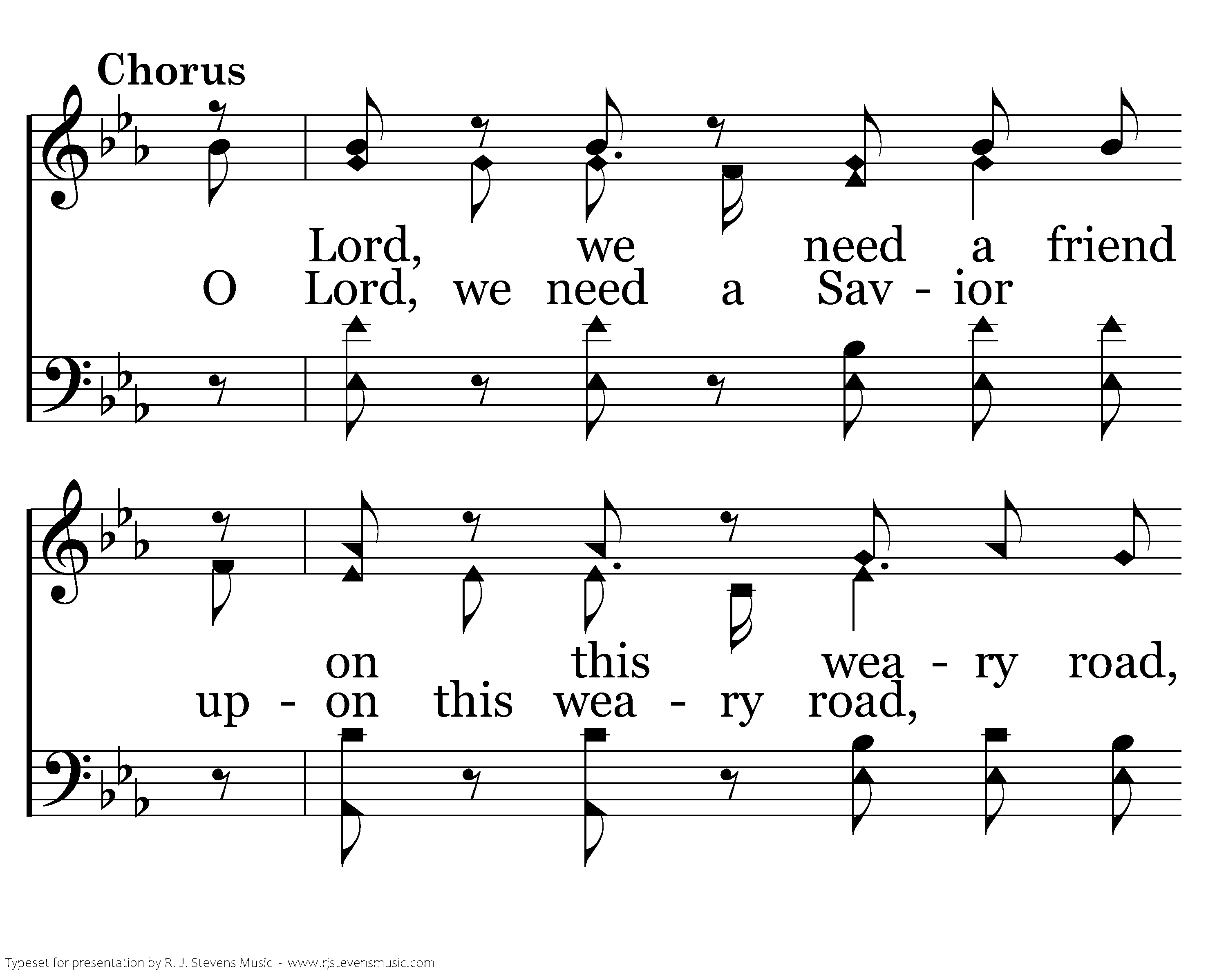 O Lord, we need a Savior upon this weary road, We need some one to guide us and share our heavy load; We need some one to love us and tell us what to do. O Lord, we need a friend like you.