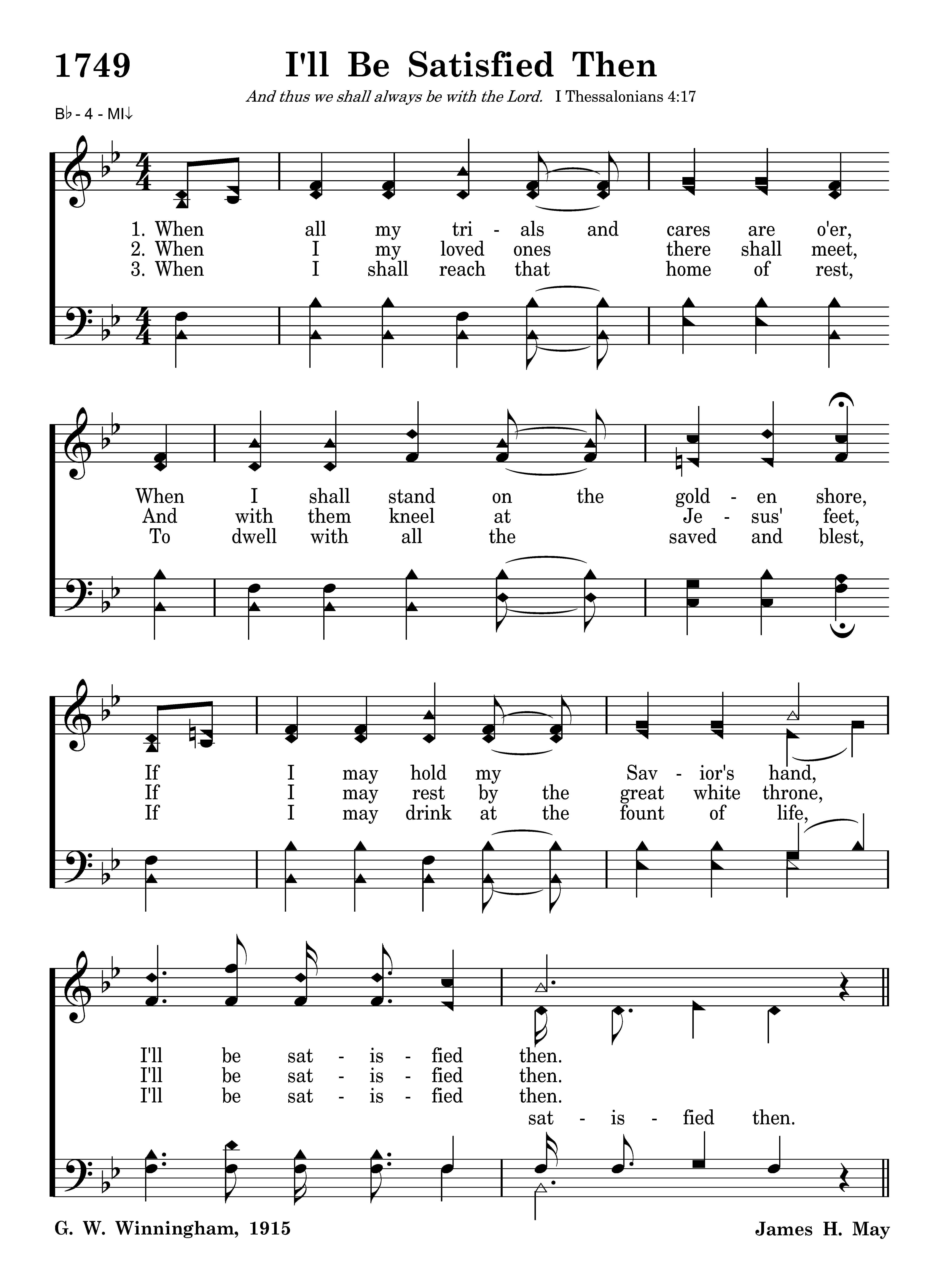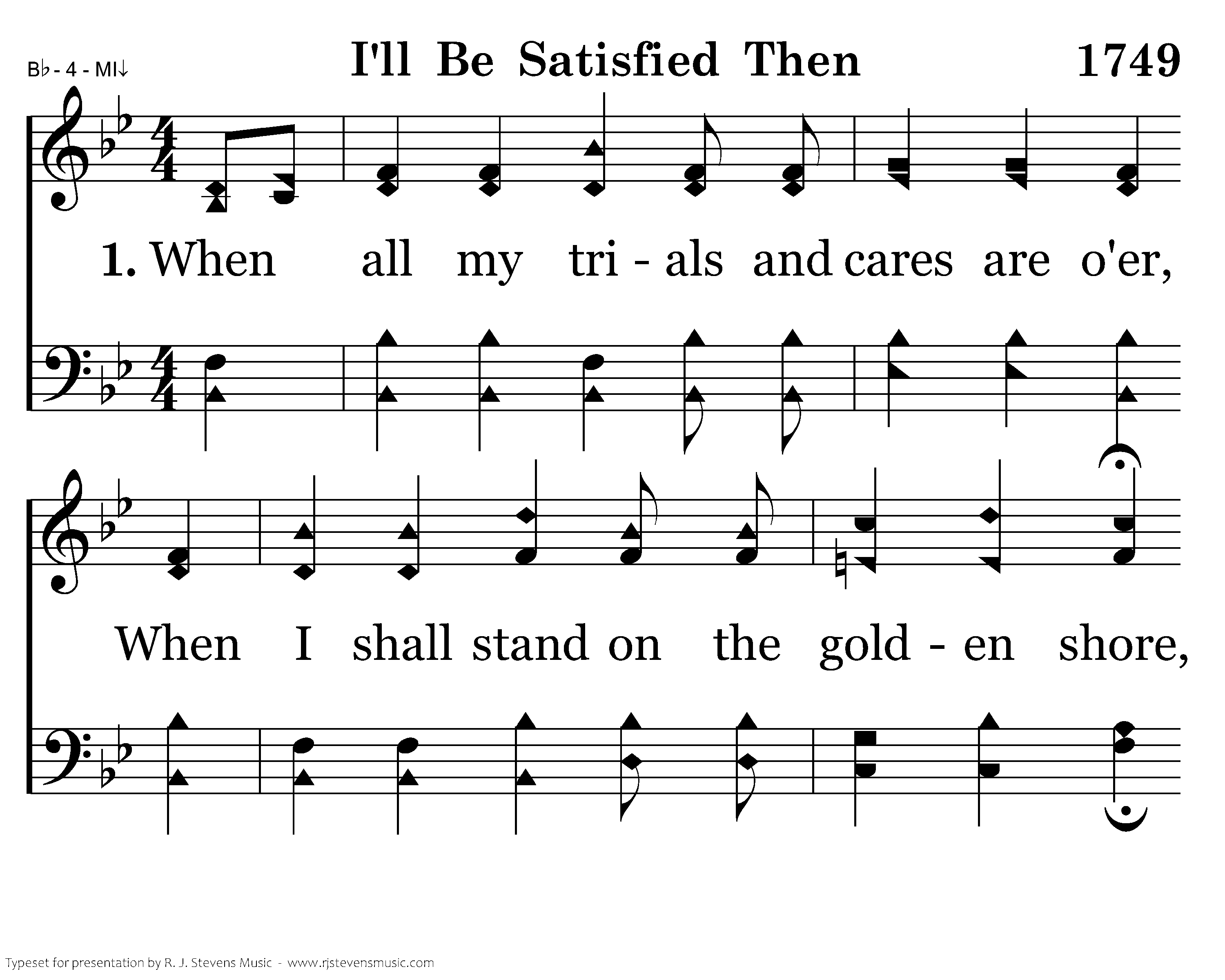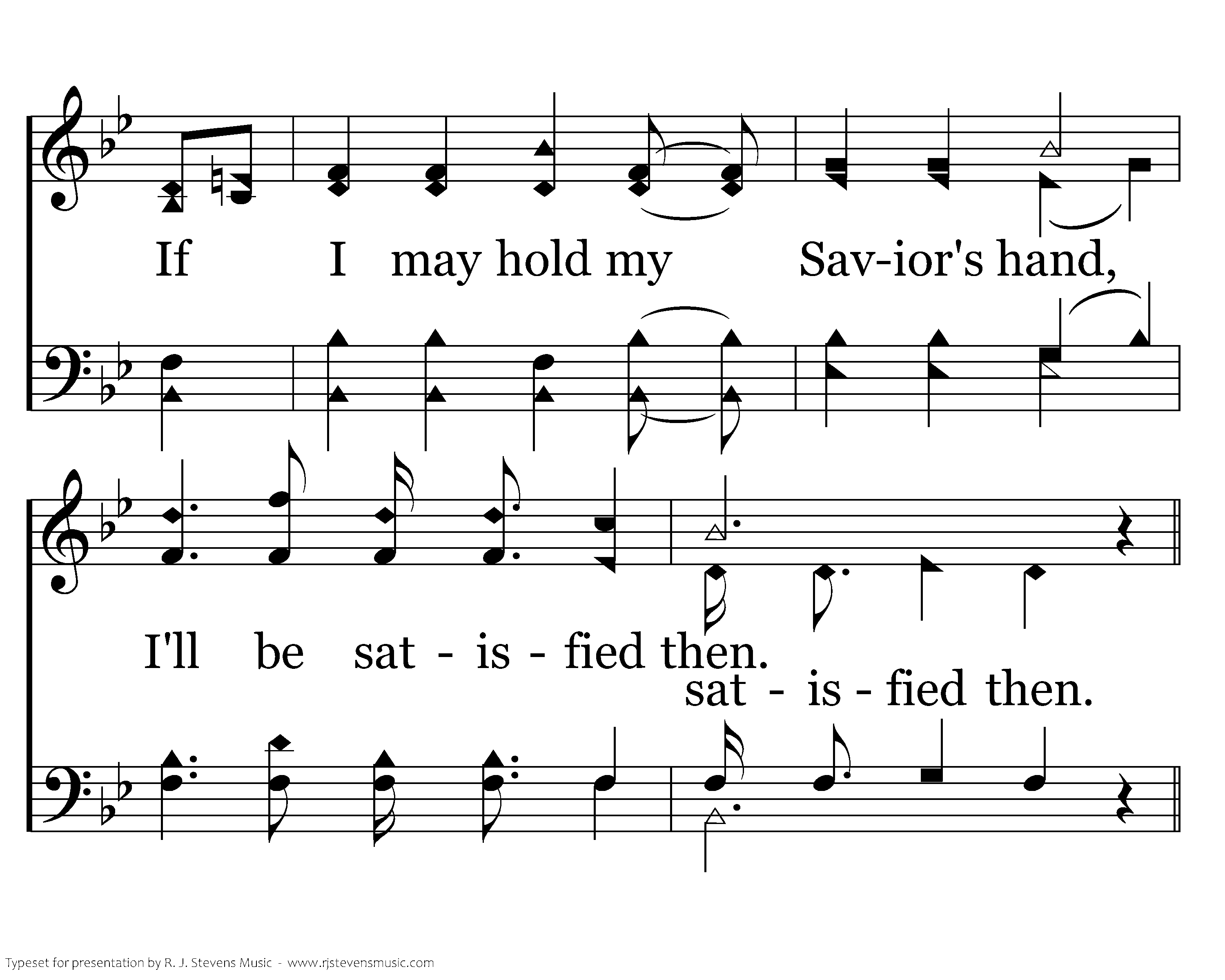When all my trials and cares are o'er, When I shall stand on the golden shore, If I may hold my Savior's hand, I'll be satisfied then. I'll be satisfied then, I'll be satisfied then, If I may hold my Savior's hand, I'll be satisfied then.