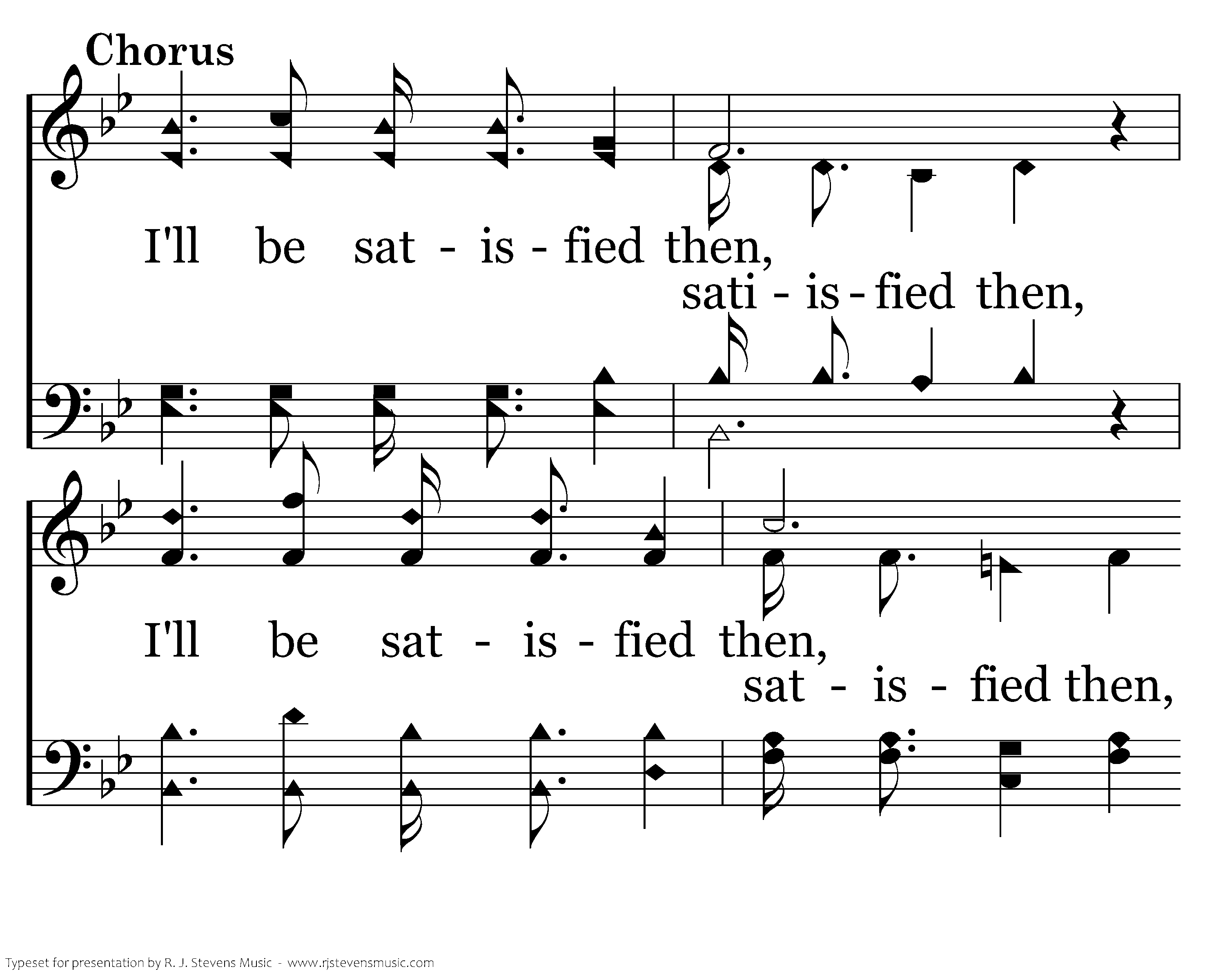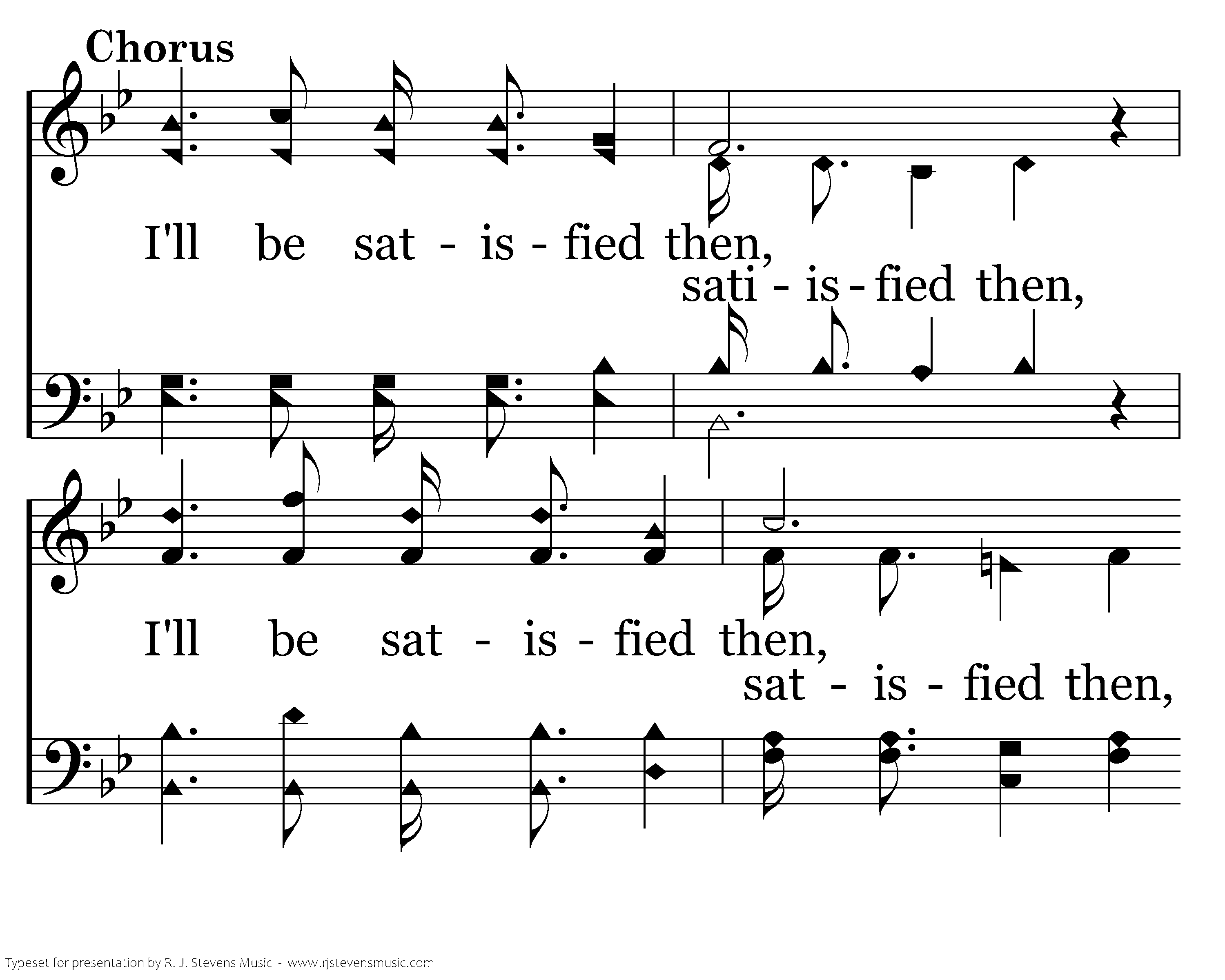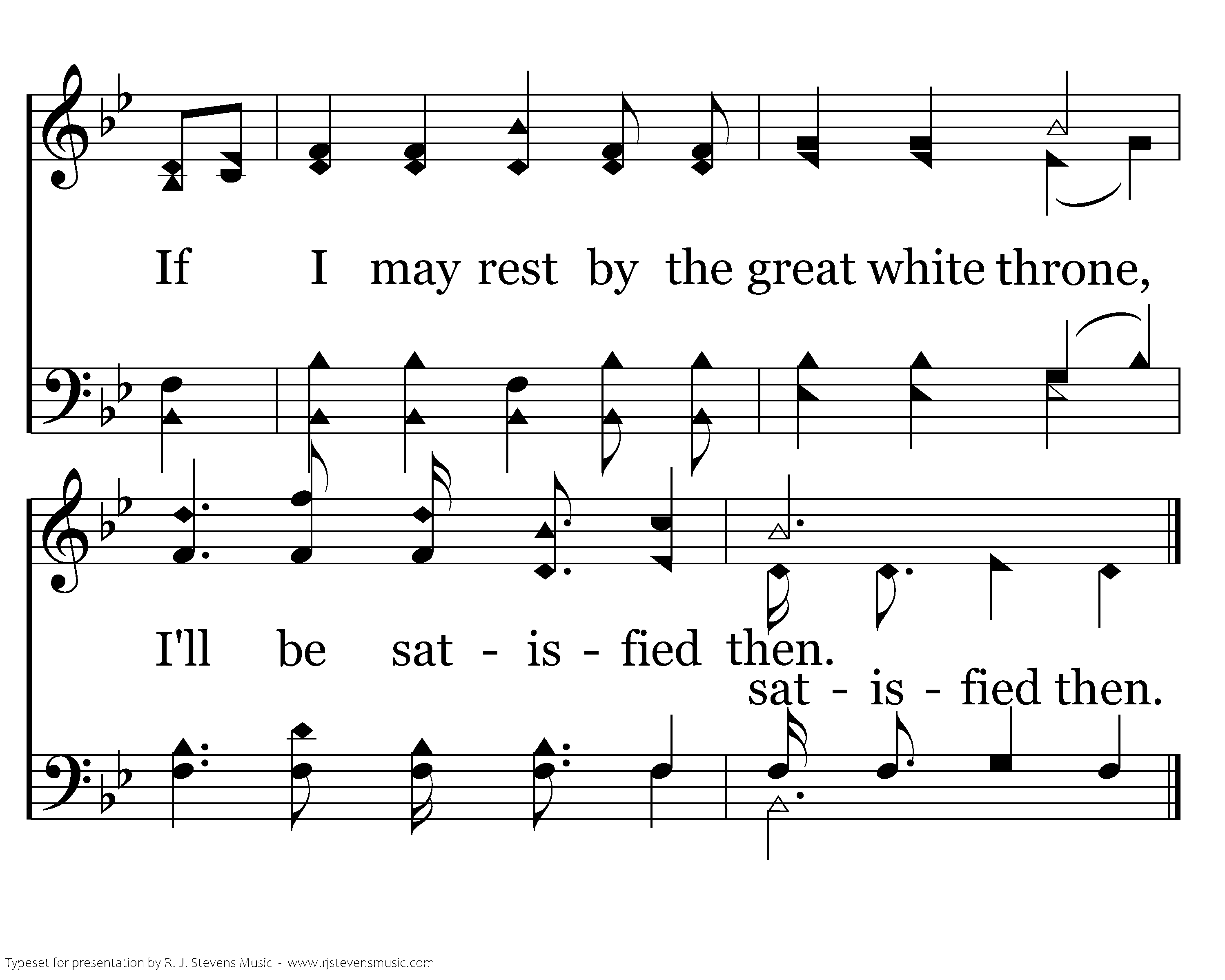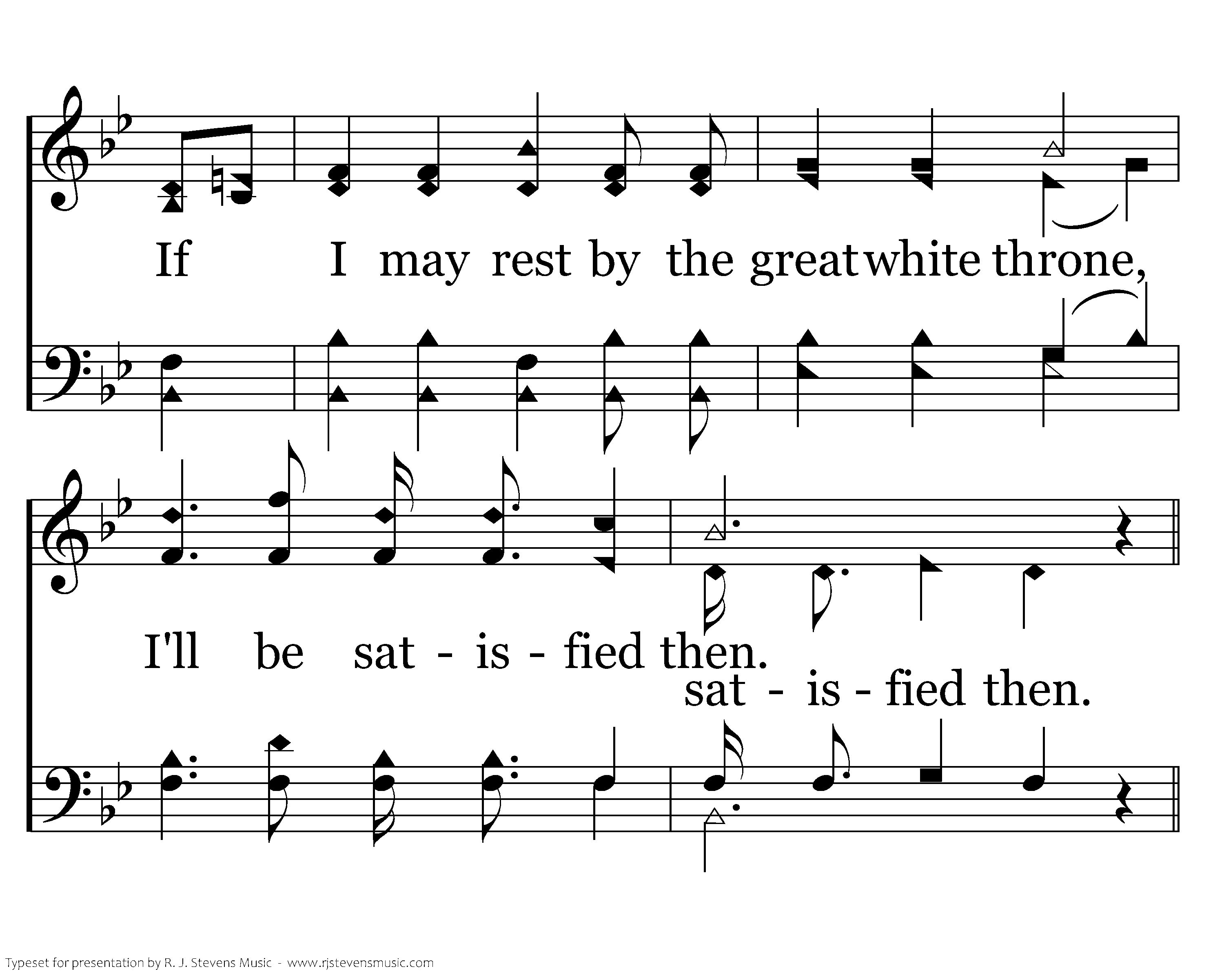 When I my loved ones there shall meet, And with them kneel at Jesus' feet, If I may rest by the great white throne, I'll be satisfied then. I'll be satisfied then, I'll be satisfied then, If I may rest by the great white throne, I'll be satisfied then.