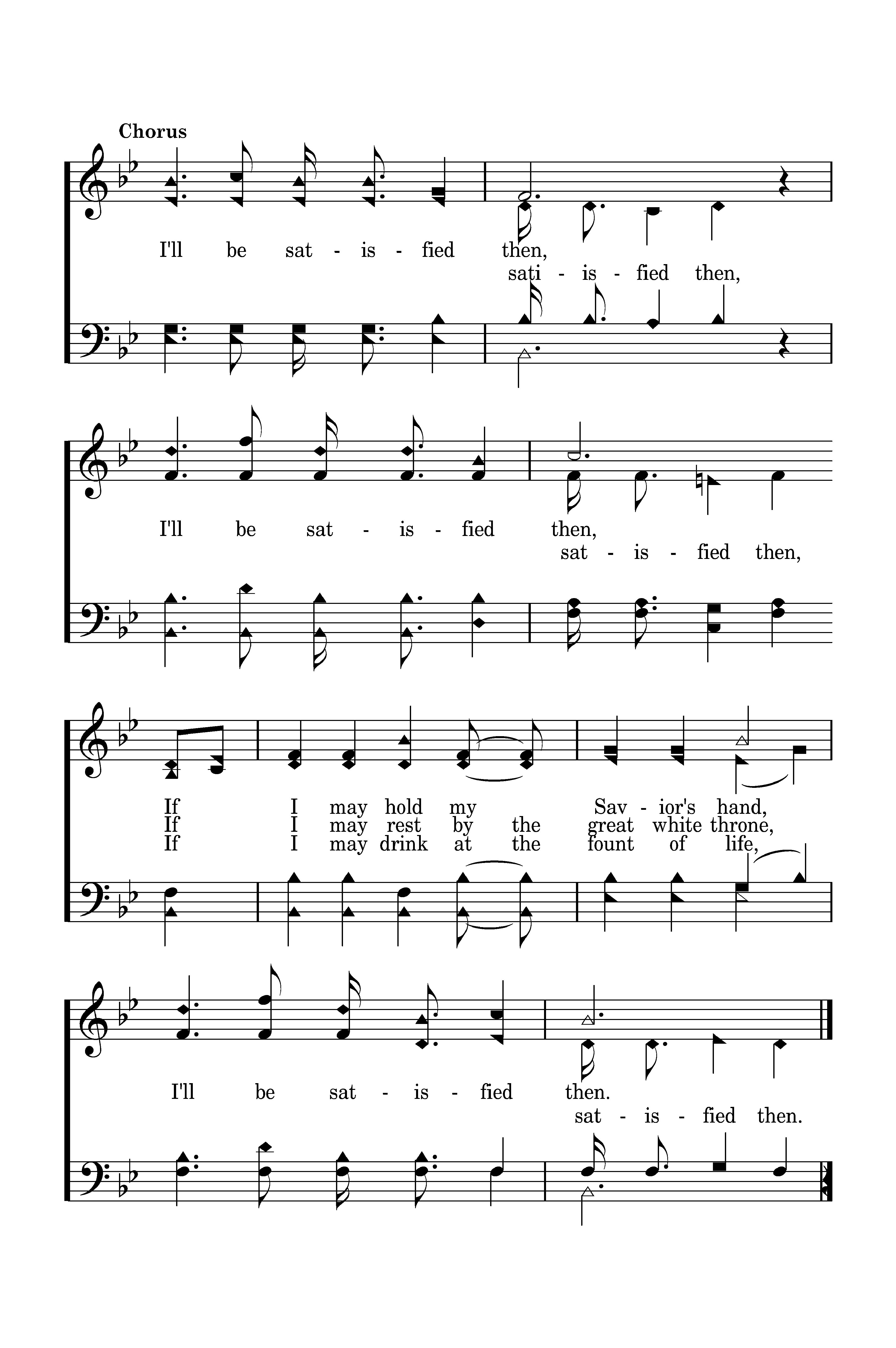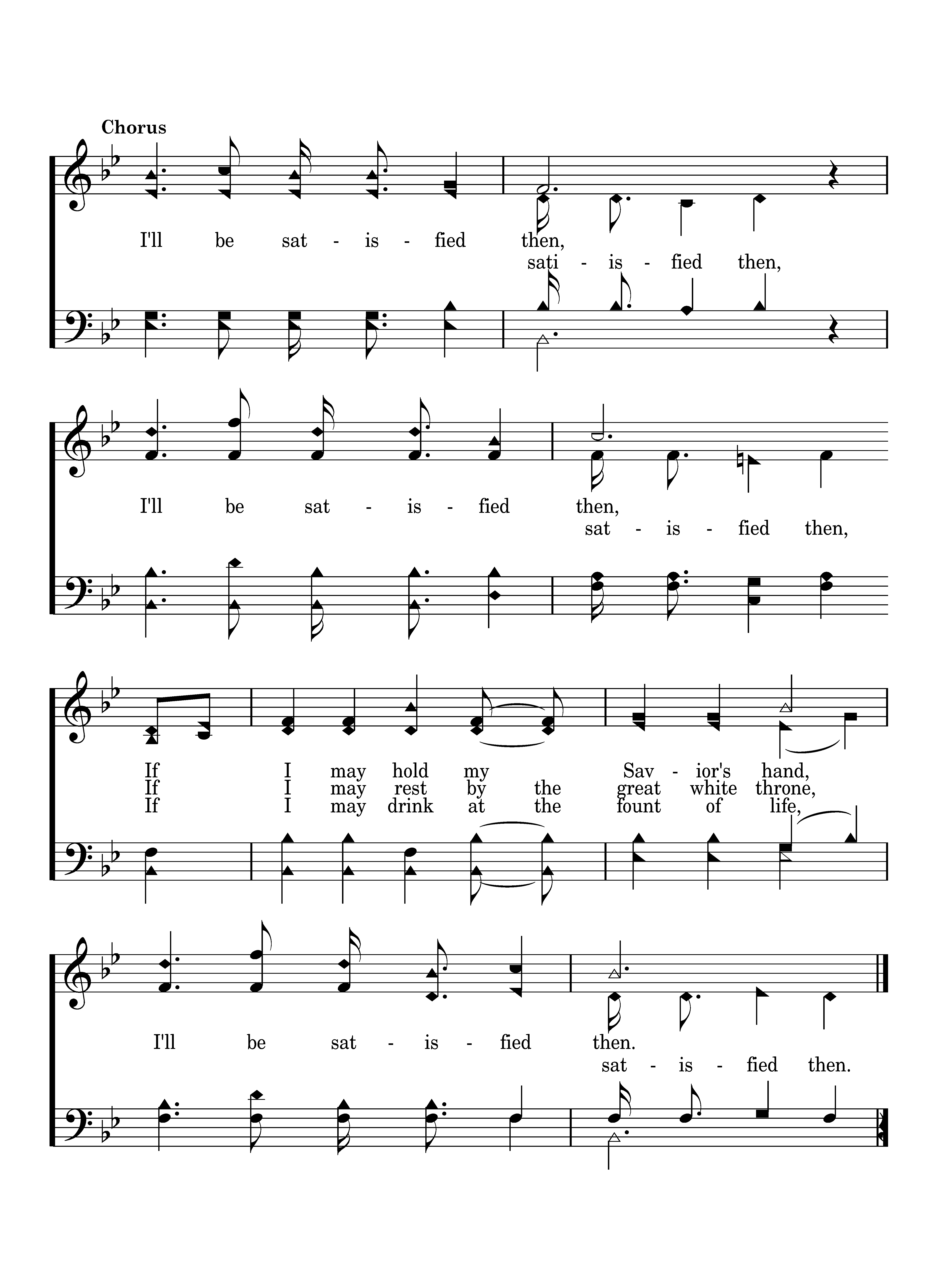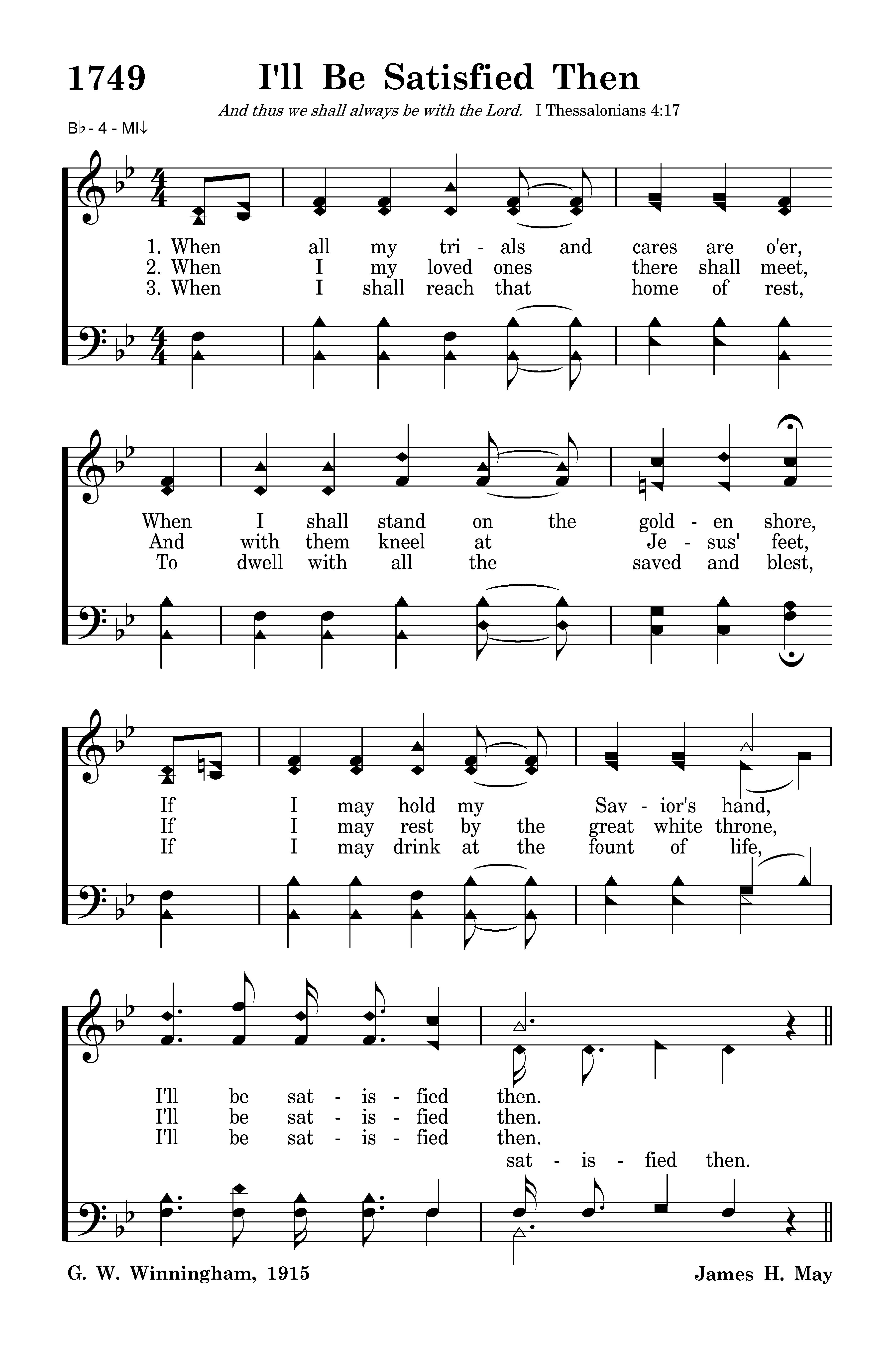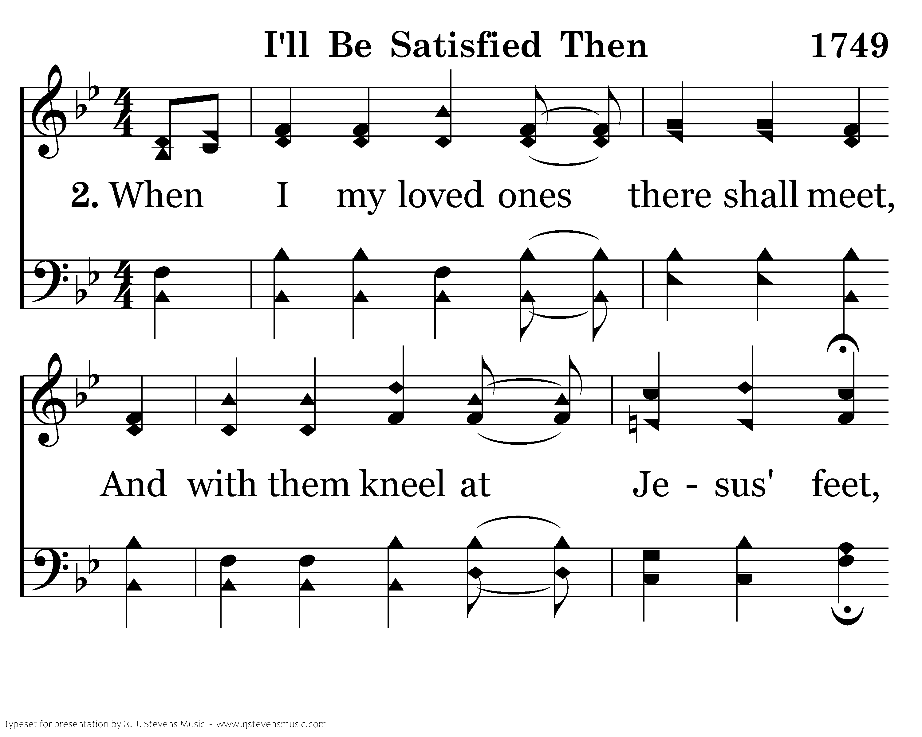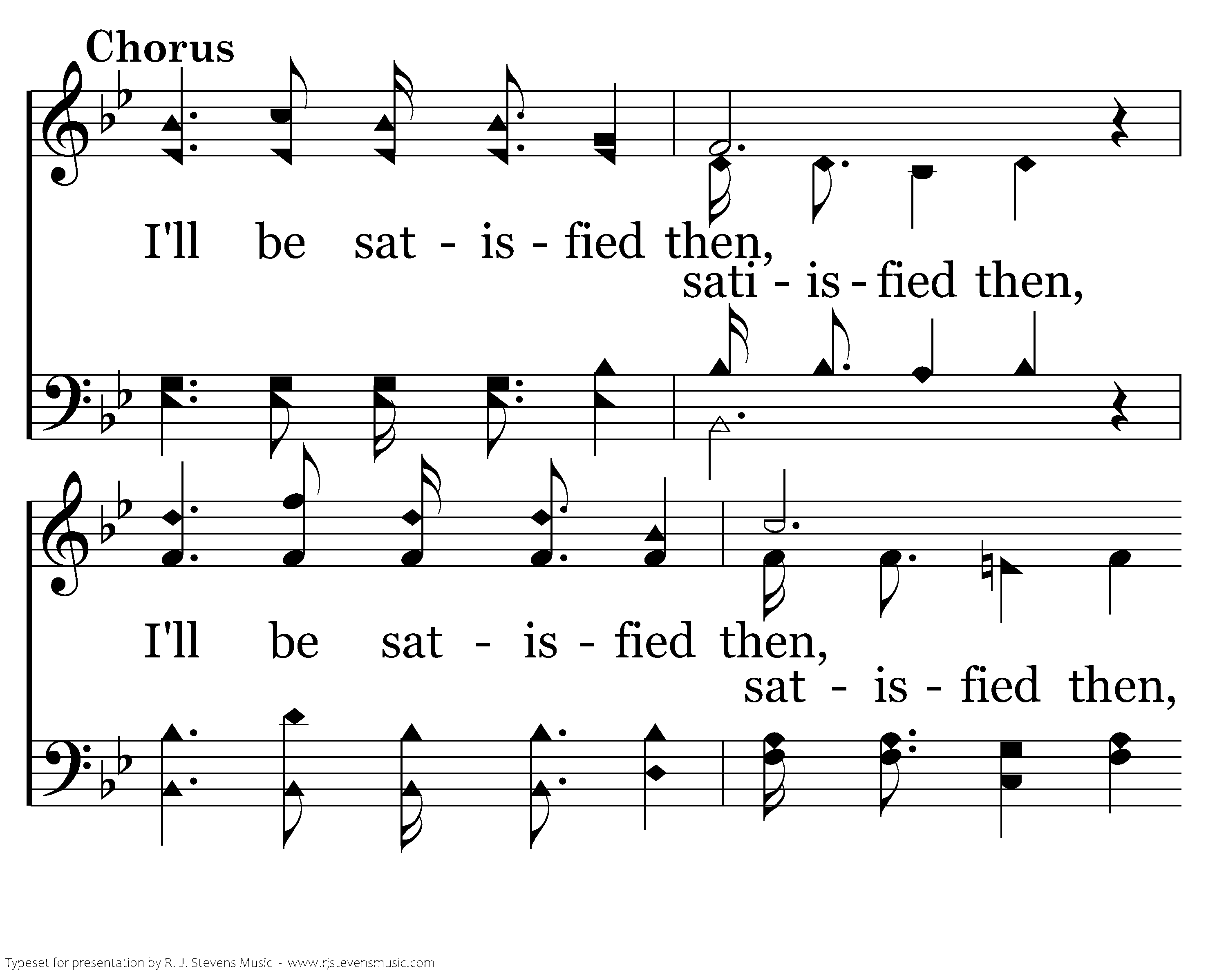 When I my loved ones there shall meet, And with them kneel at Jesus' feet, If I may rest by the great white throne, I'll be satisfied then. I'll be satisfied then, I'll be satisfied then, If I may rest by the great white throne, I'll be satisfied then.