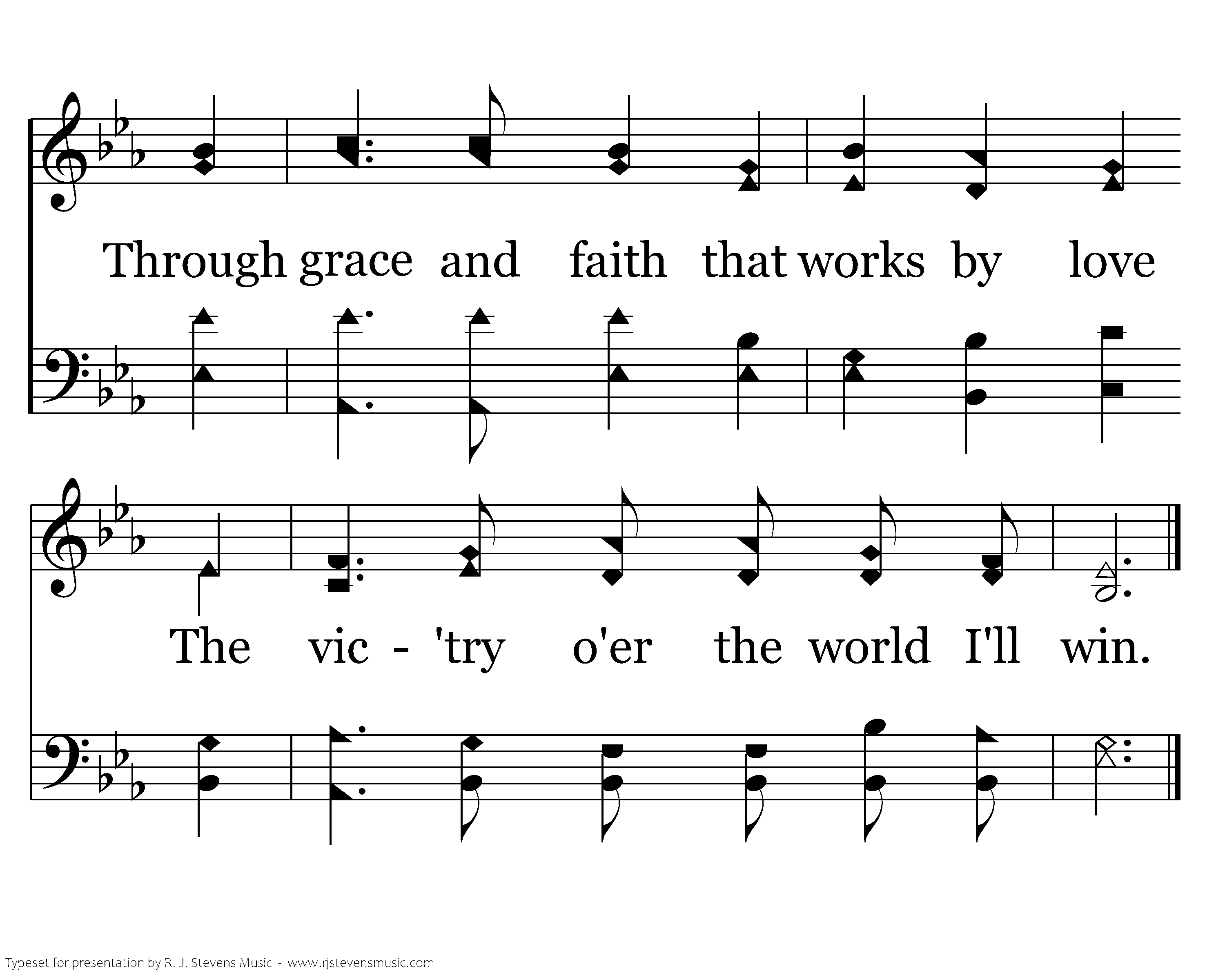 Christ's precious blood has saved my soul and cleanses me from all my sin, Through grace and faith that works by love The vic'try o'er the world I'll win.