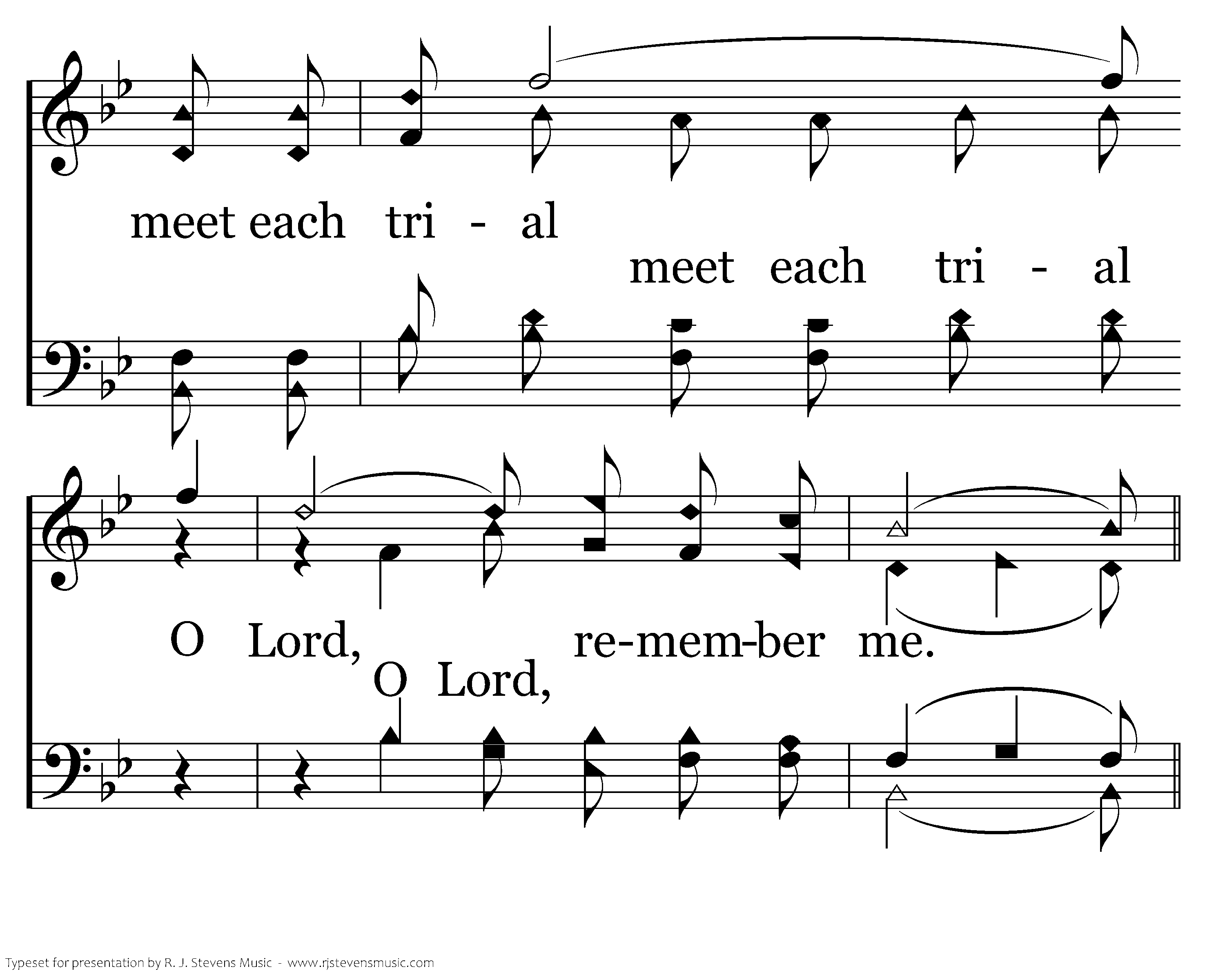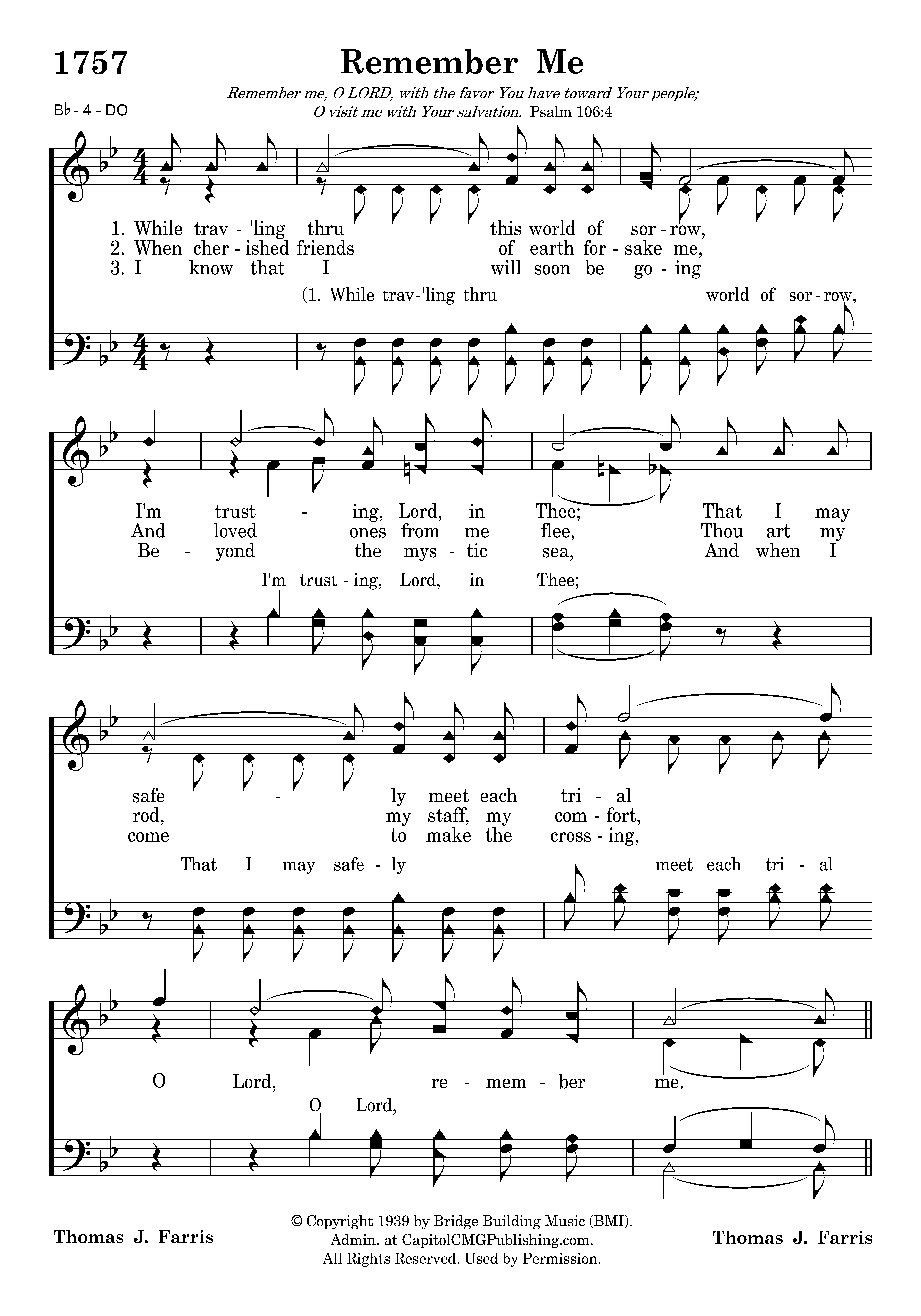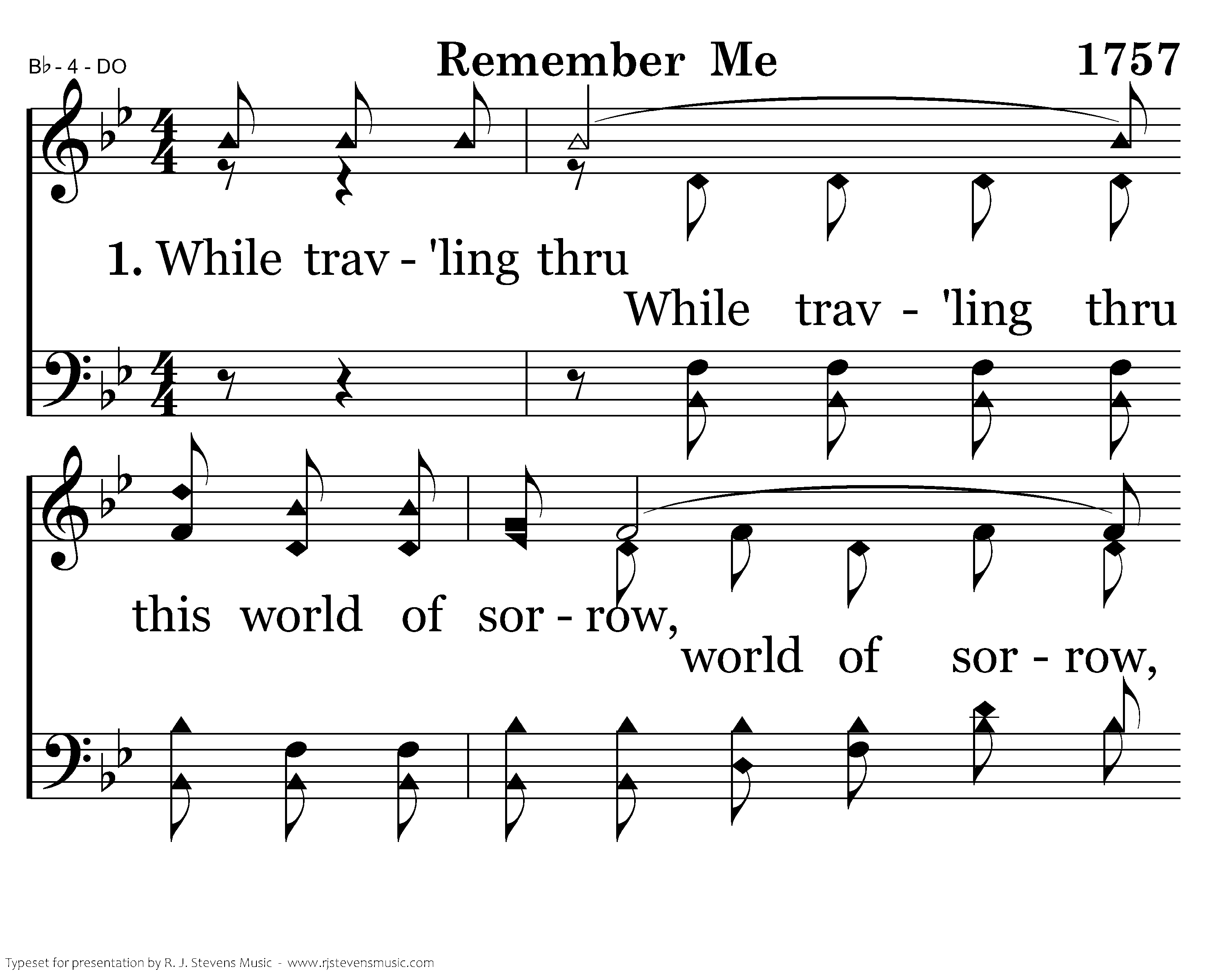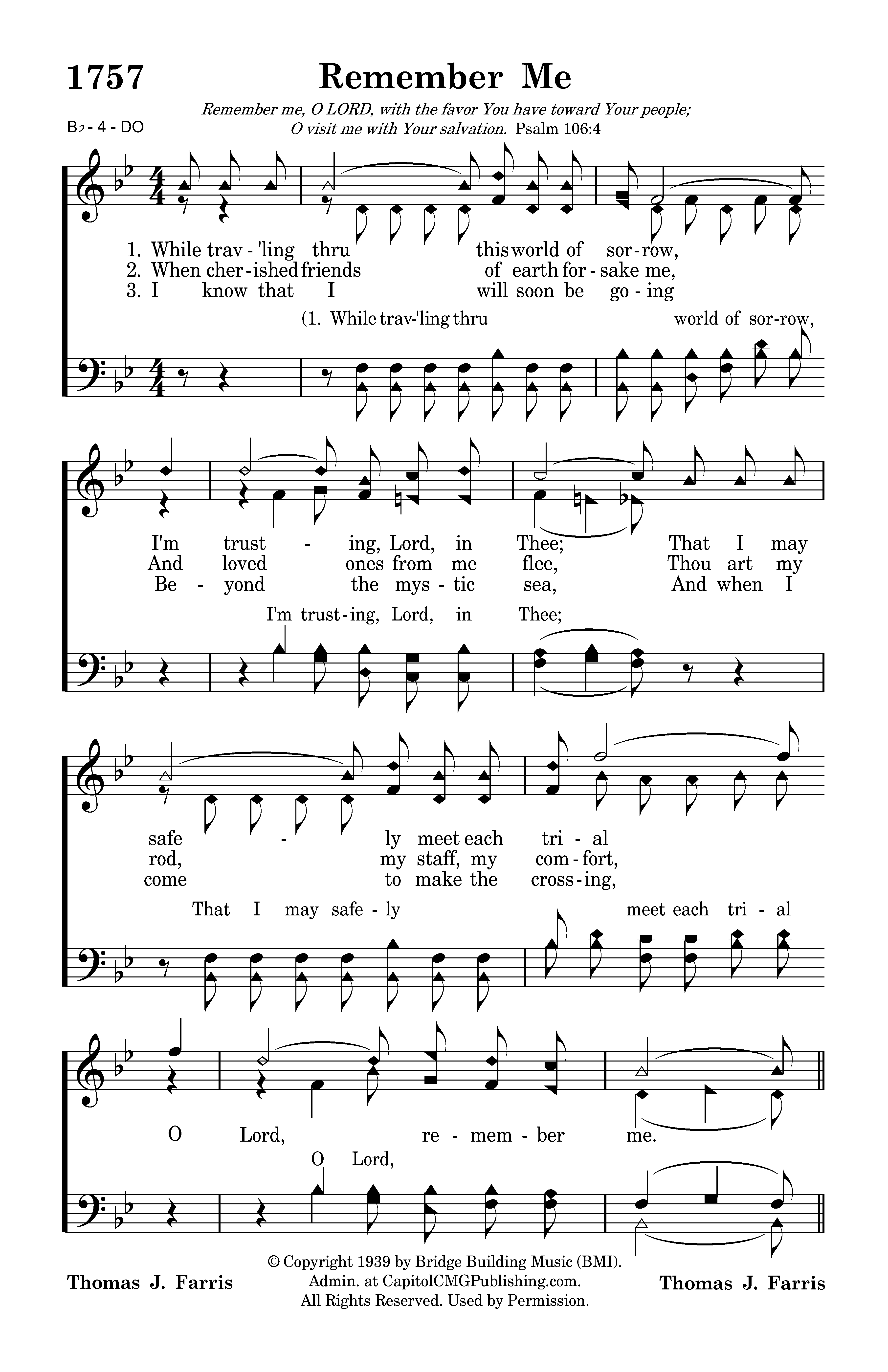 While trav'ling thru this world of sorrow, I'm trusting, Lord, in Thee; That I may safely meet each trial O Lord, remember me.