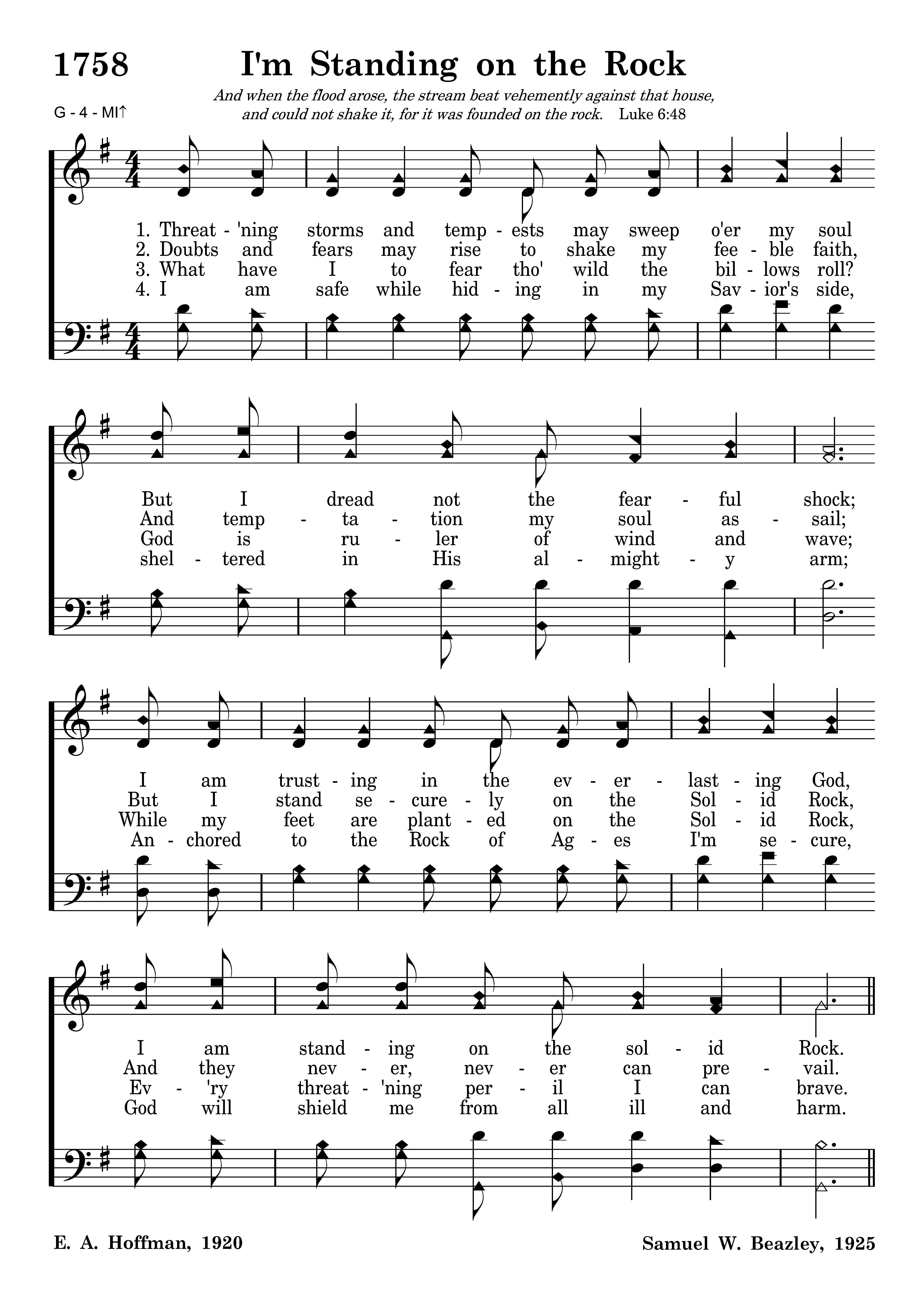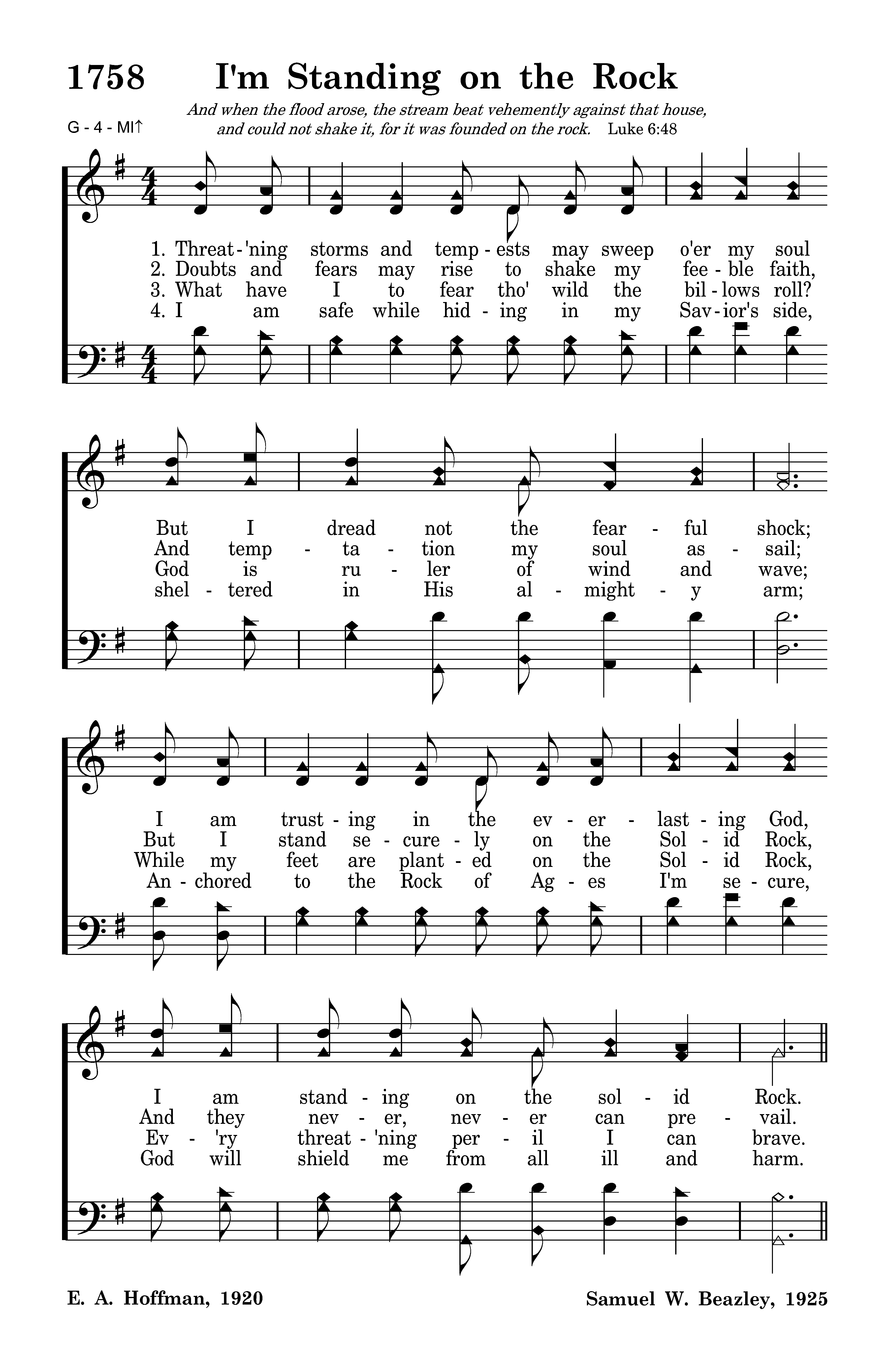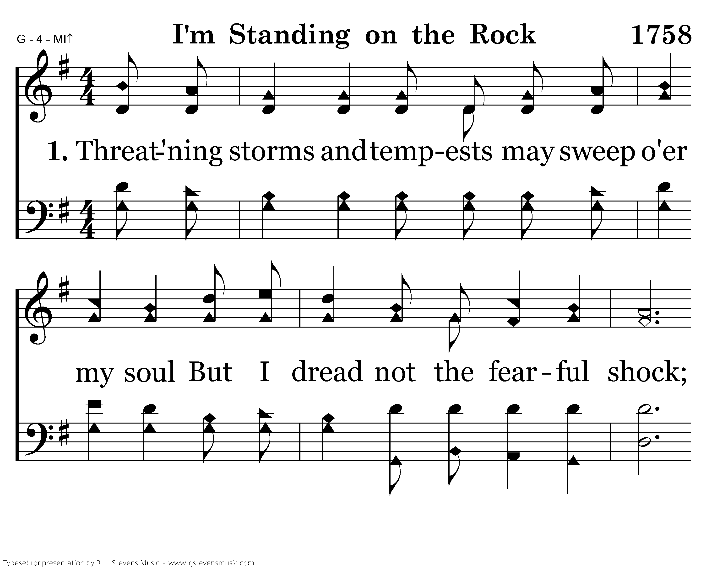 Threat'ning storms and tempests may sweep o'er my soul But I dread not the fearful shock; I am trusting in the everlasting God, I am standing on the solid Rock.