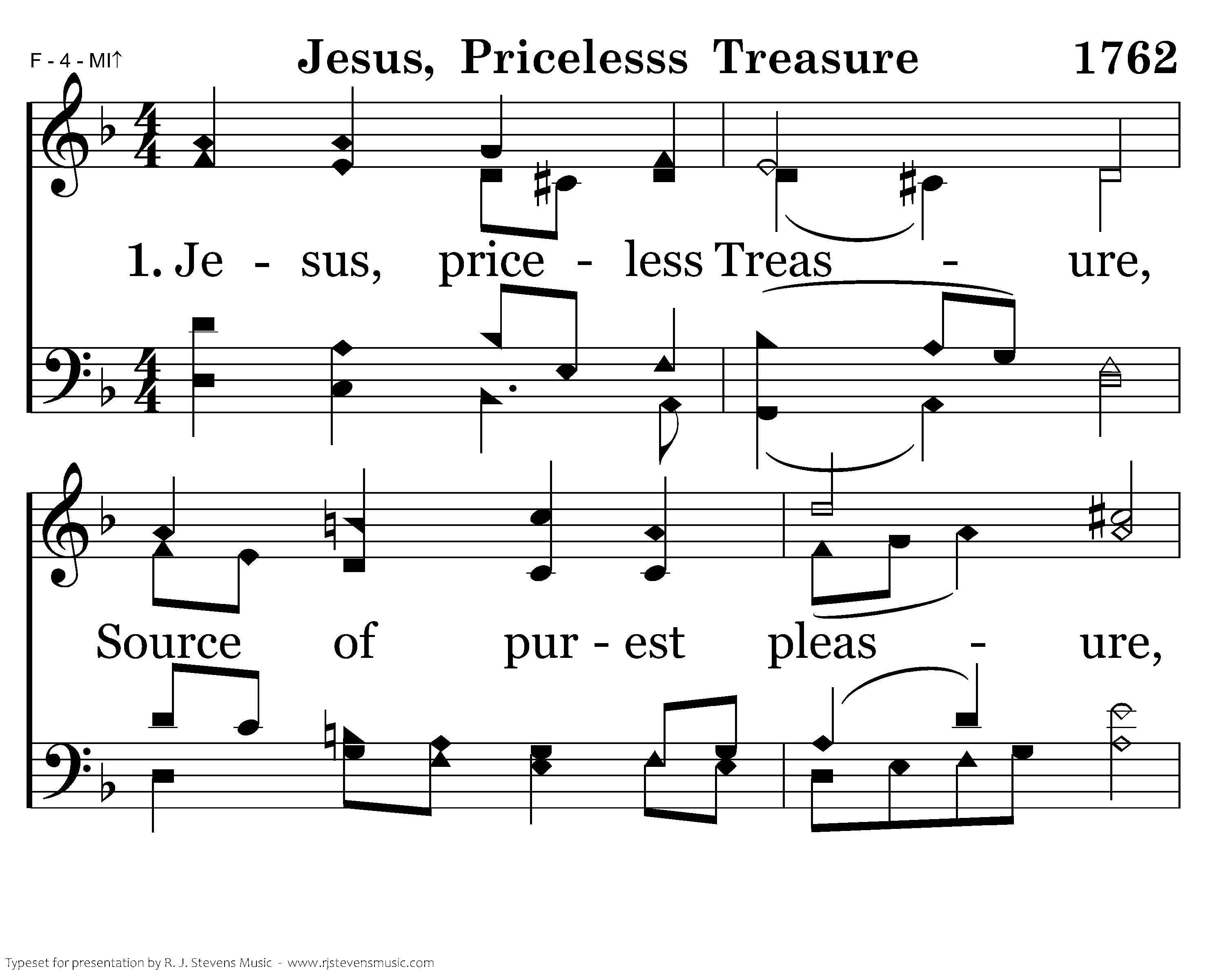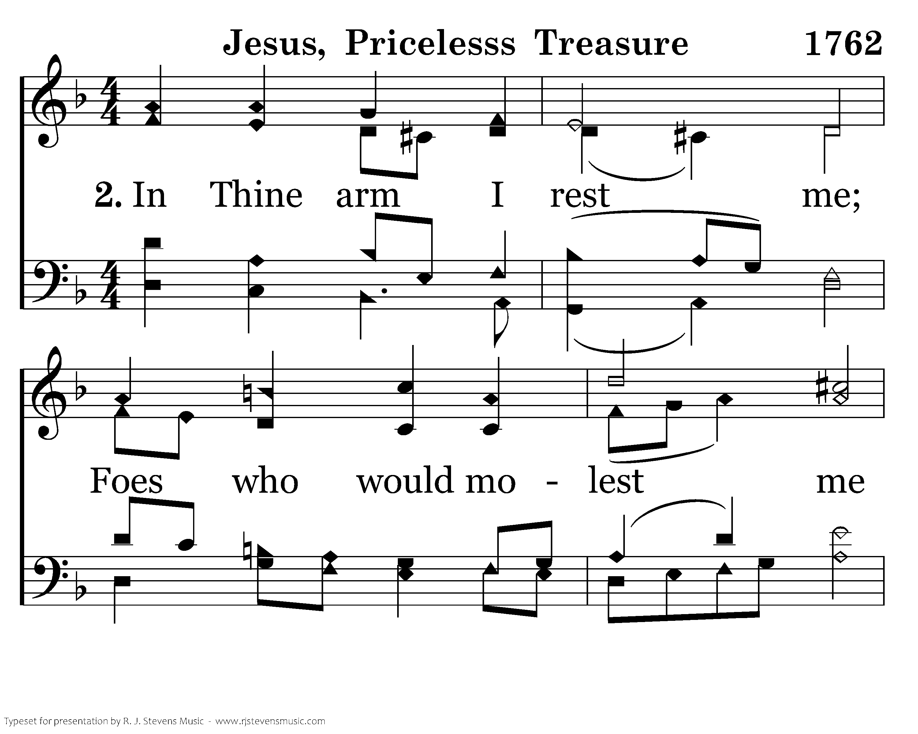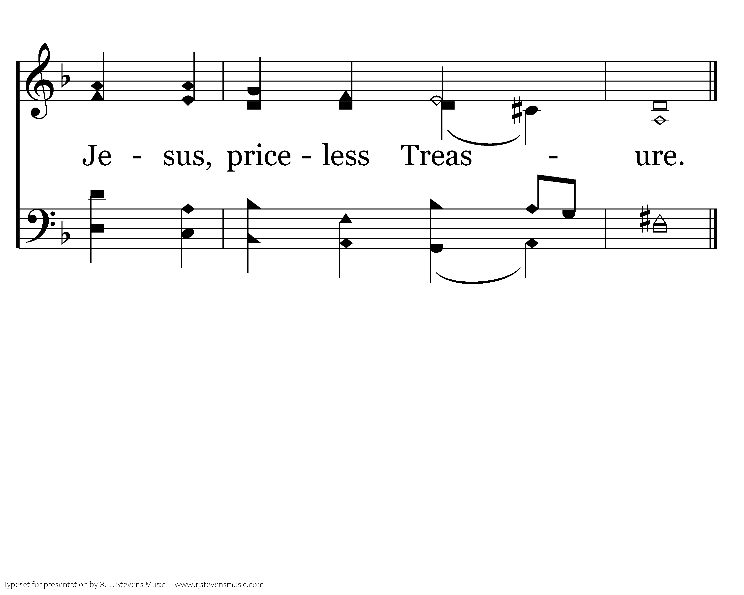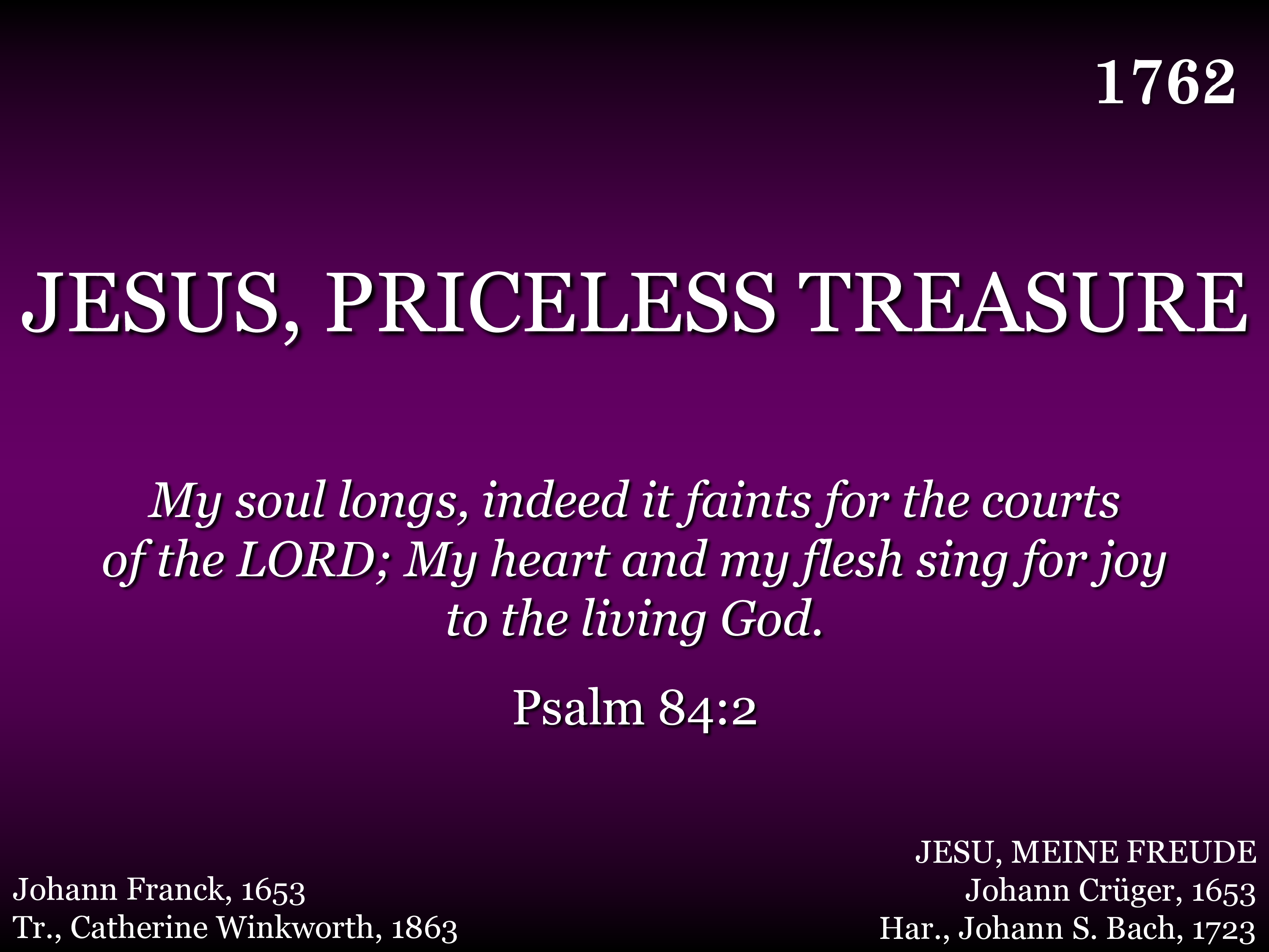 Jesus, priceless Treasure, Source of purest pleasure, Truest friend to me; Long my heart hath panted, Till it almost fainted, Thirsting after Thee. Thine I am, O spotless Lamb, I will suffer naught to hide Thee, Ask for naught beside Thee.