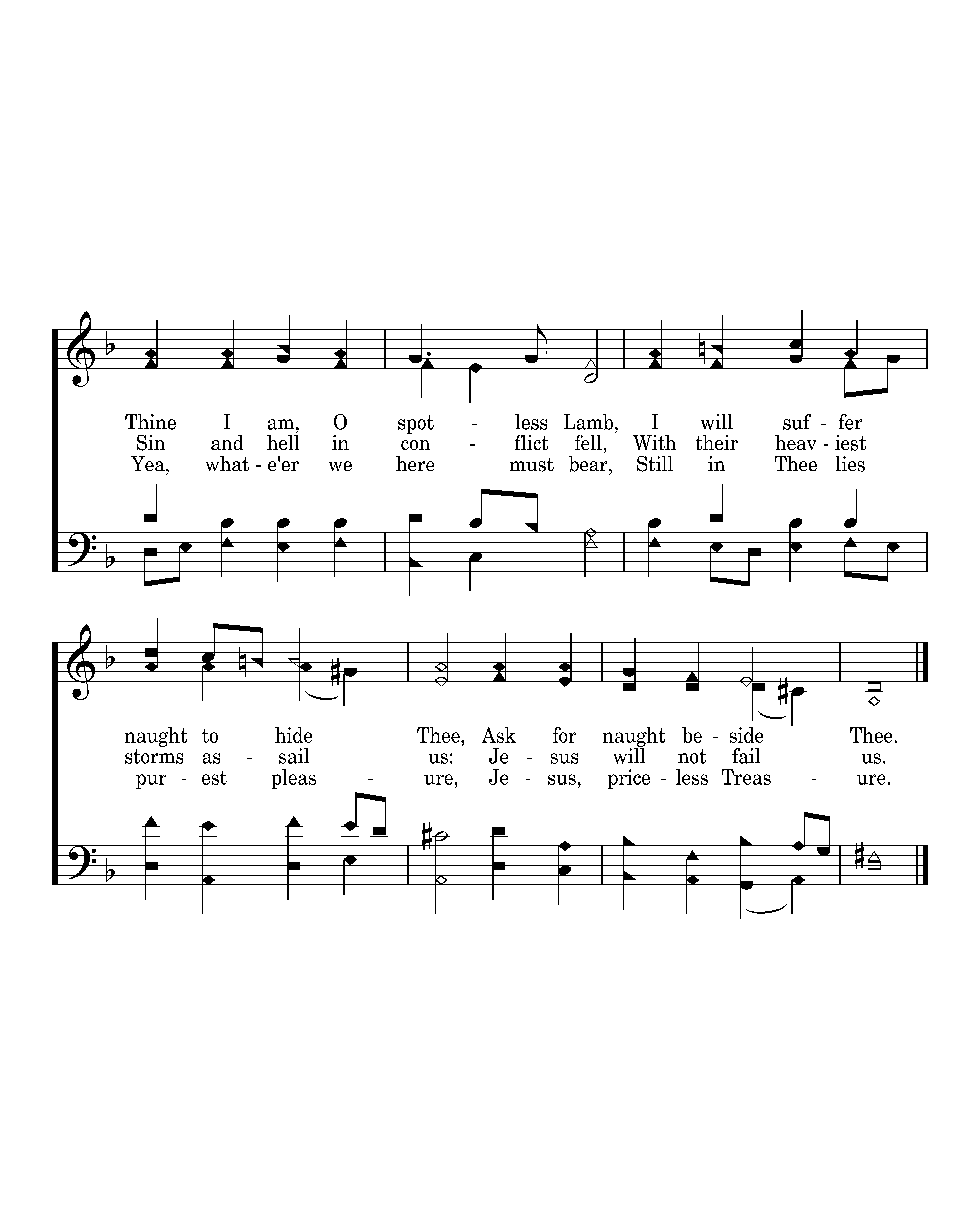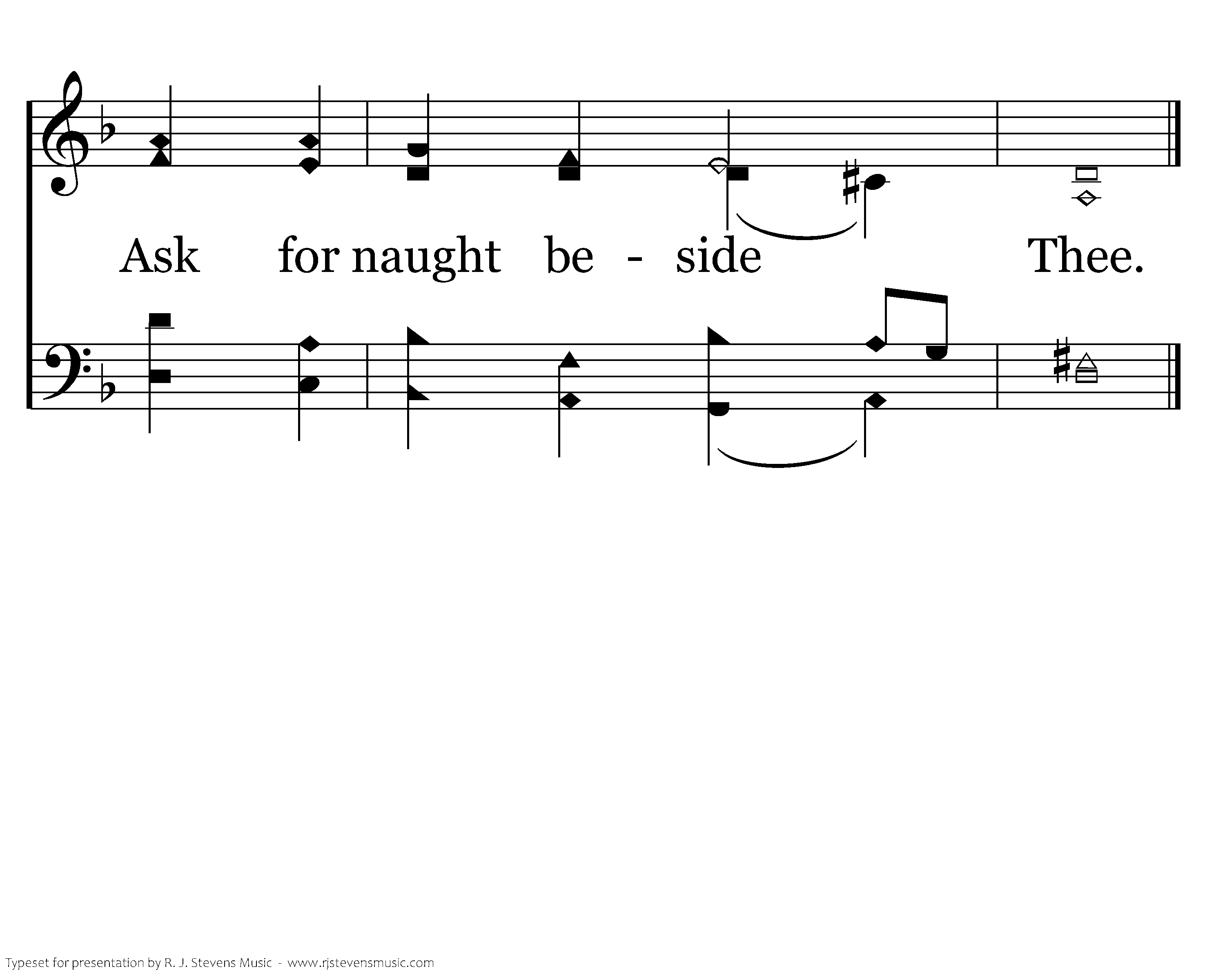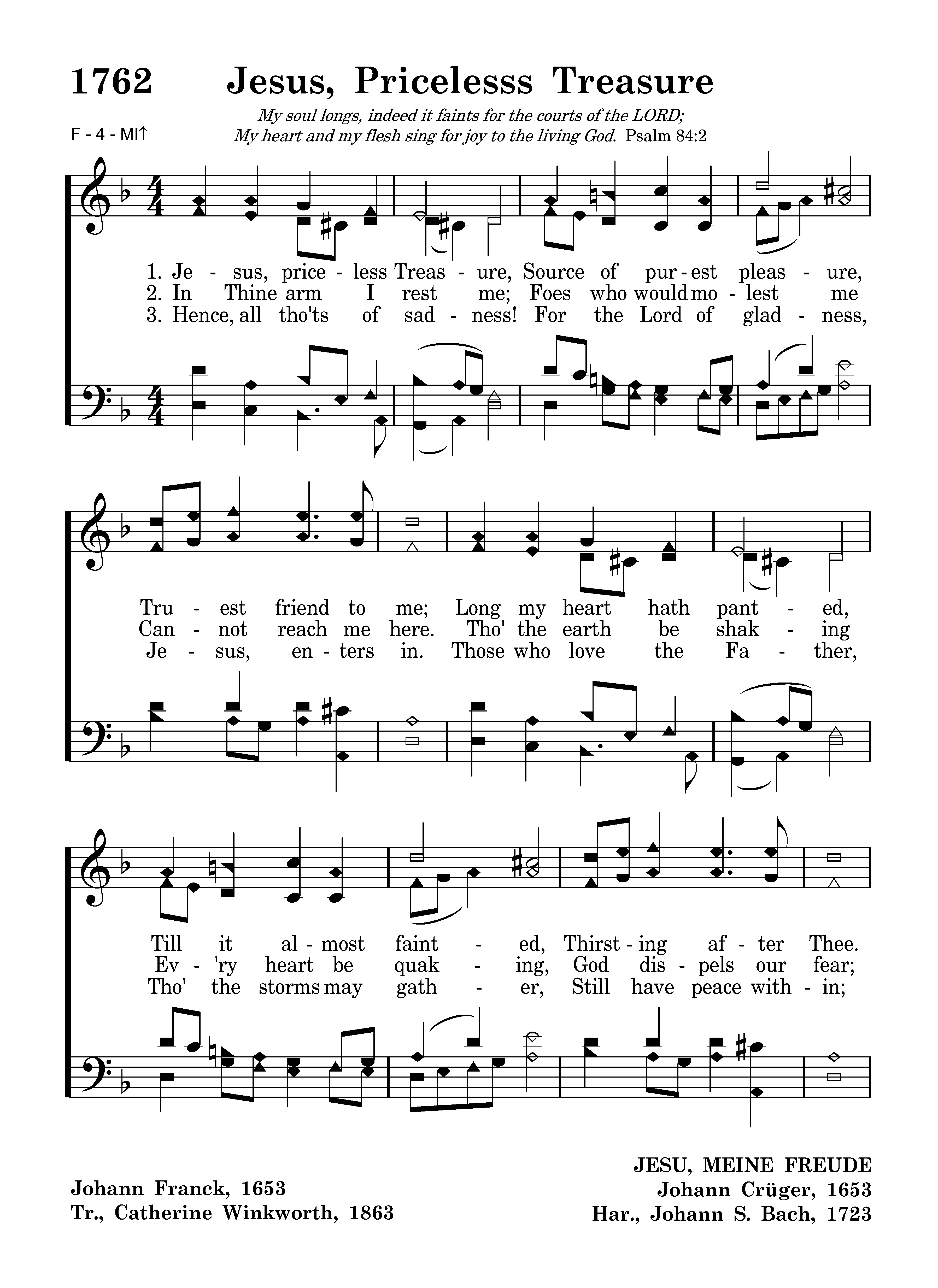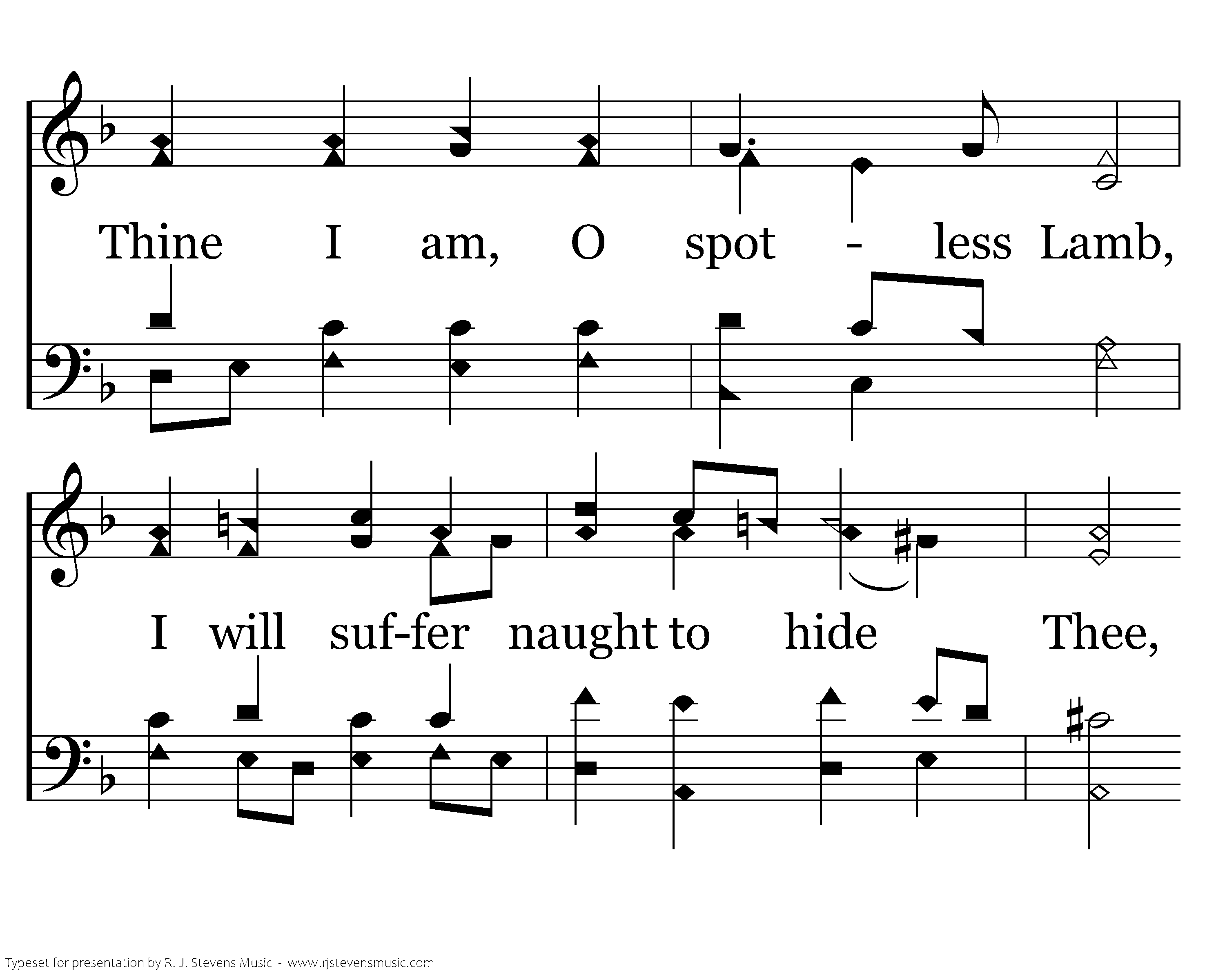 Jesus, priceless Treasure, Source of purest pleasure, Truest friend to me; Long my heart hath panted, Till it almost fainted, Thirsting after Thee. Thine I am, O spotless Lamb, I will suffer naught to hide Thee, Ask for naught beside Thee.