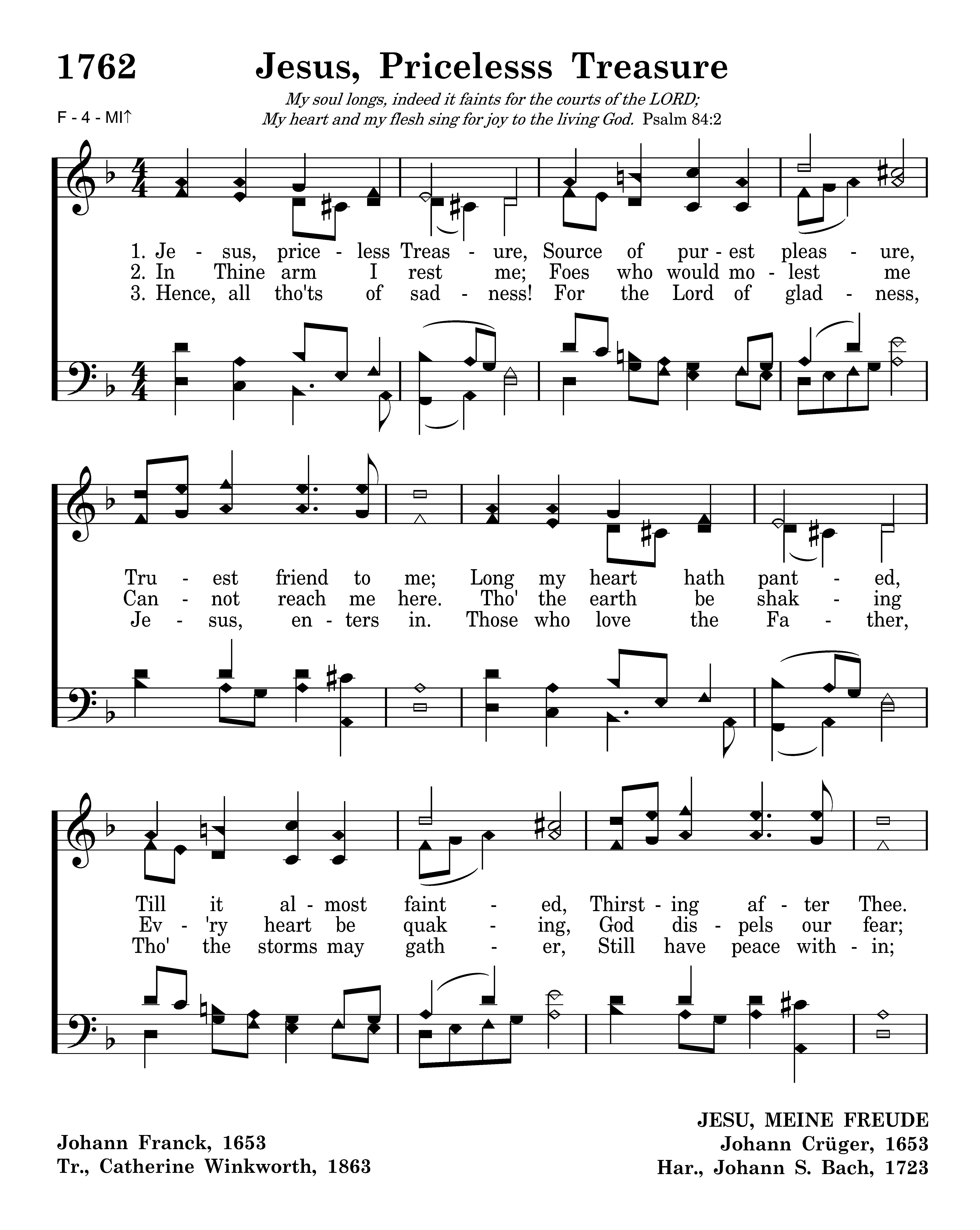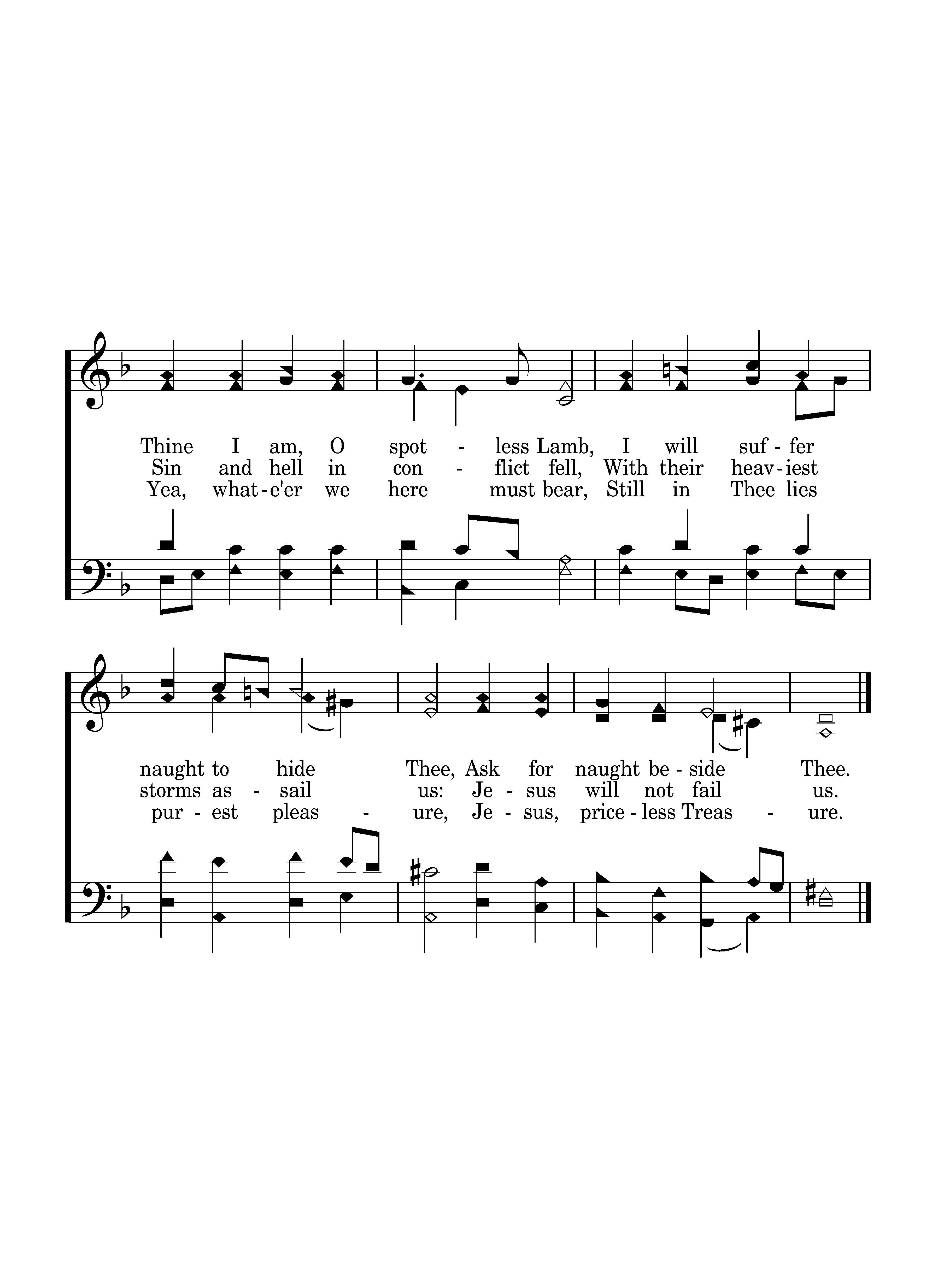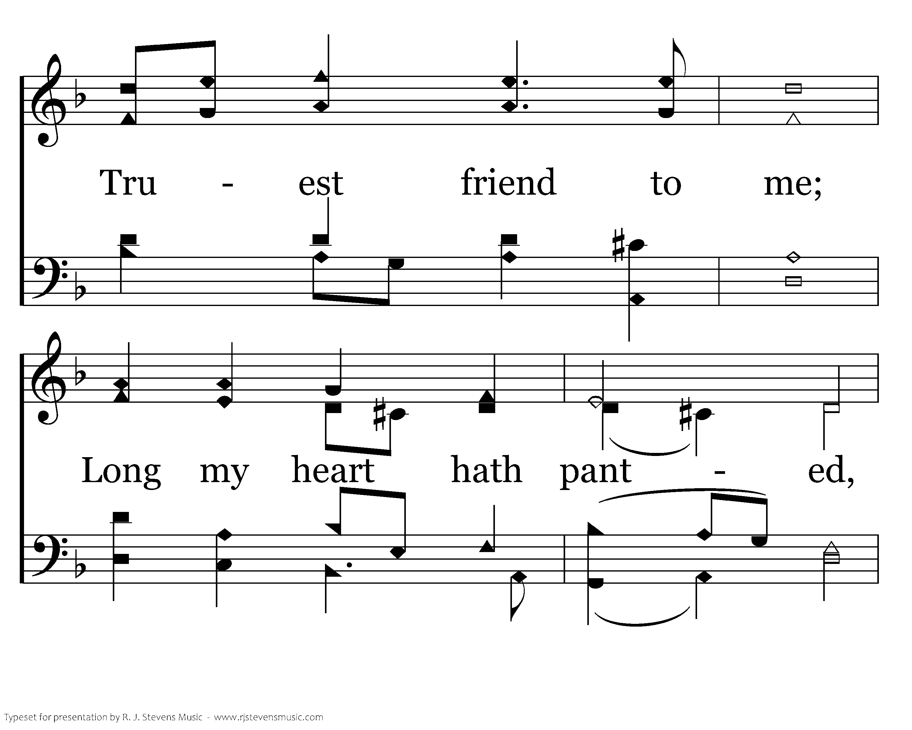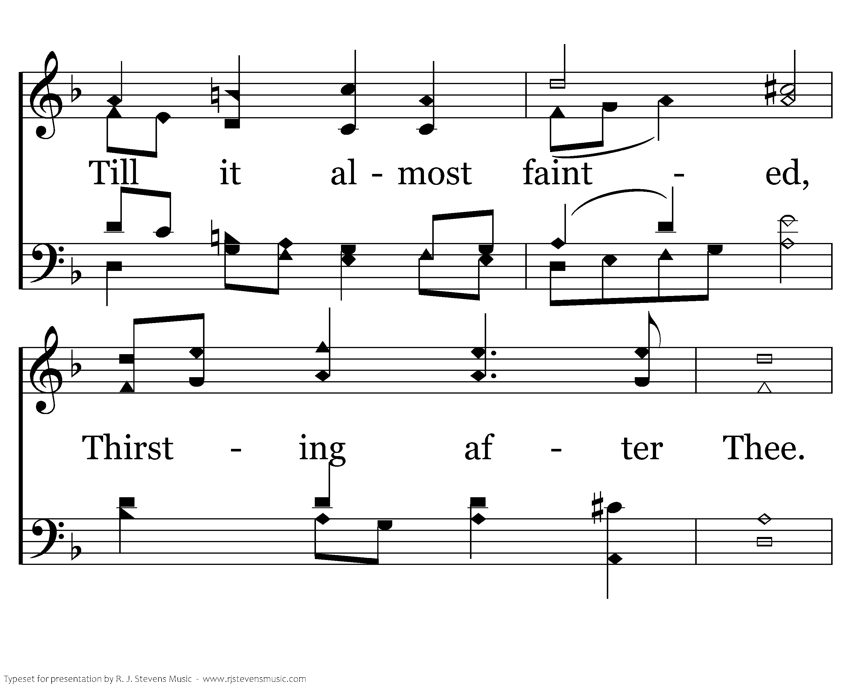 Jesus, priceless Treasure, Source of purest pleasure, Truest friend to me; Long my heart hath panted, Till it almost fainted, Thirsting after Thee. Thine I am, O spotless Lamb, I will suffer naught to hide Thee, Ask for naught beside Thee.