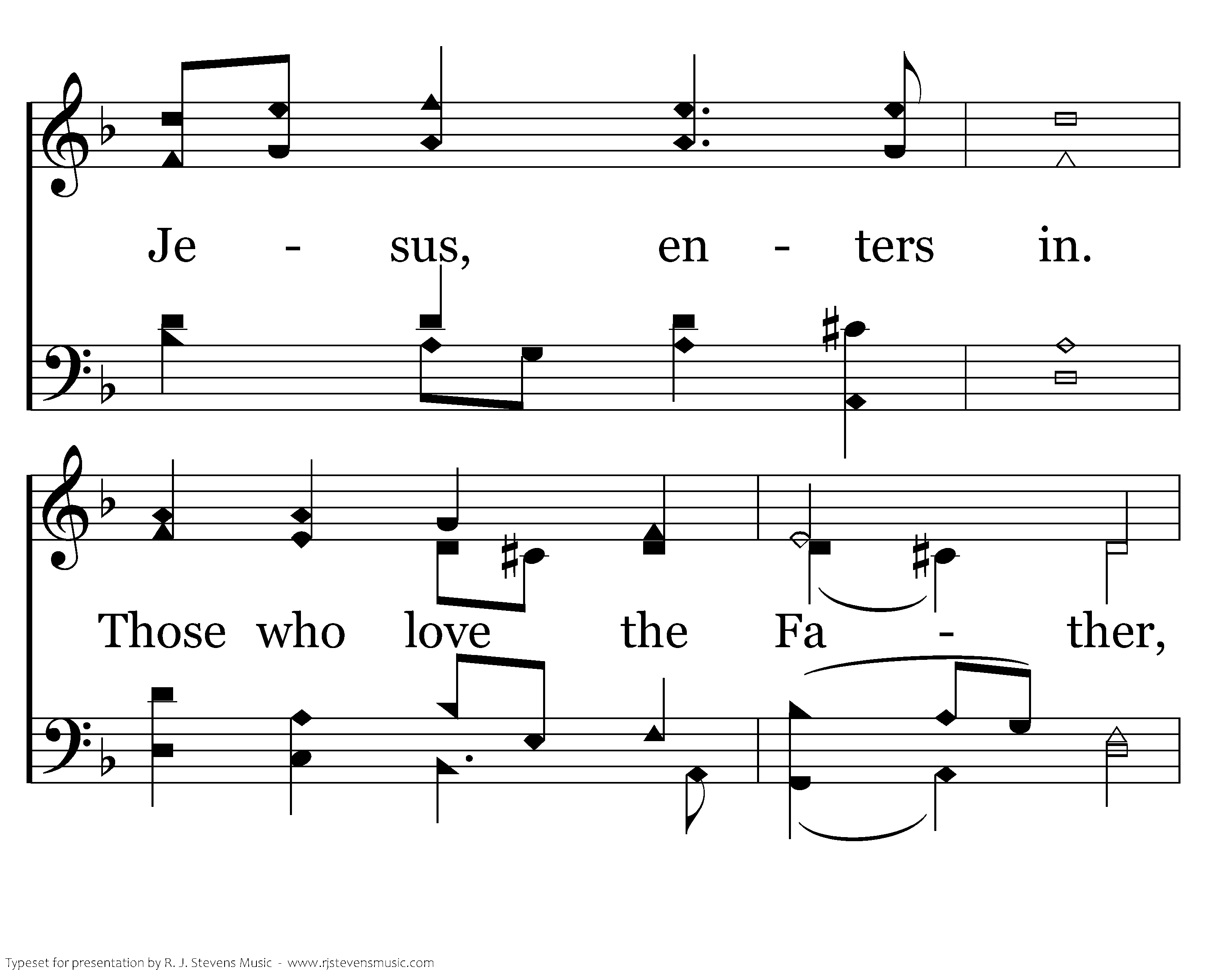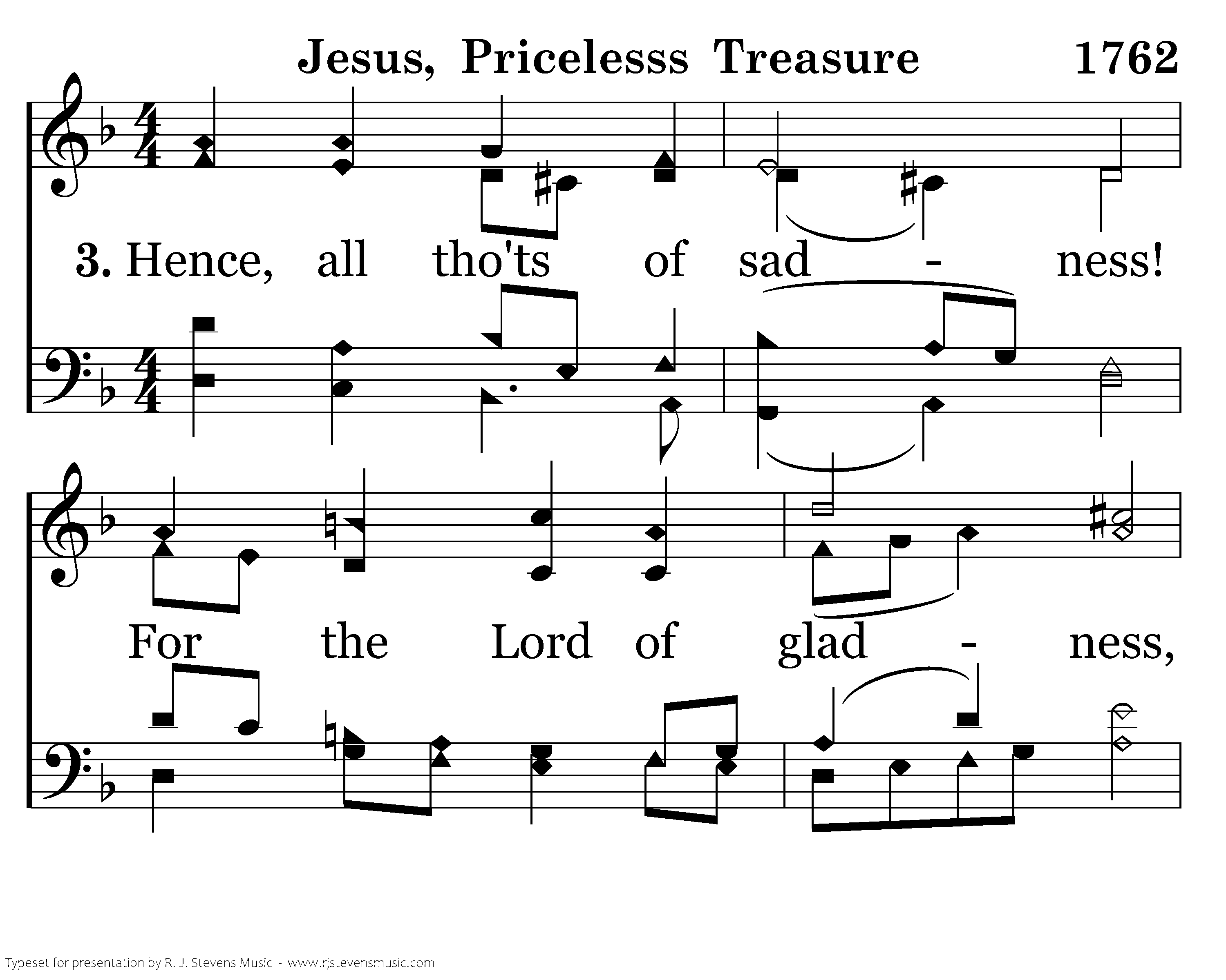 Hence, all tho'ts of sadness! For the Lord of gladness, Jesus, enters in. Those who love the Father, Tho' the storms may gather, Still have peace within; Yea, whate'er we here must bear, Still in Thee lies purest pleasure, Jesus, priceless Treasure.