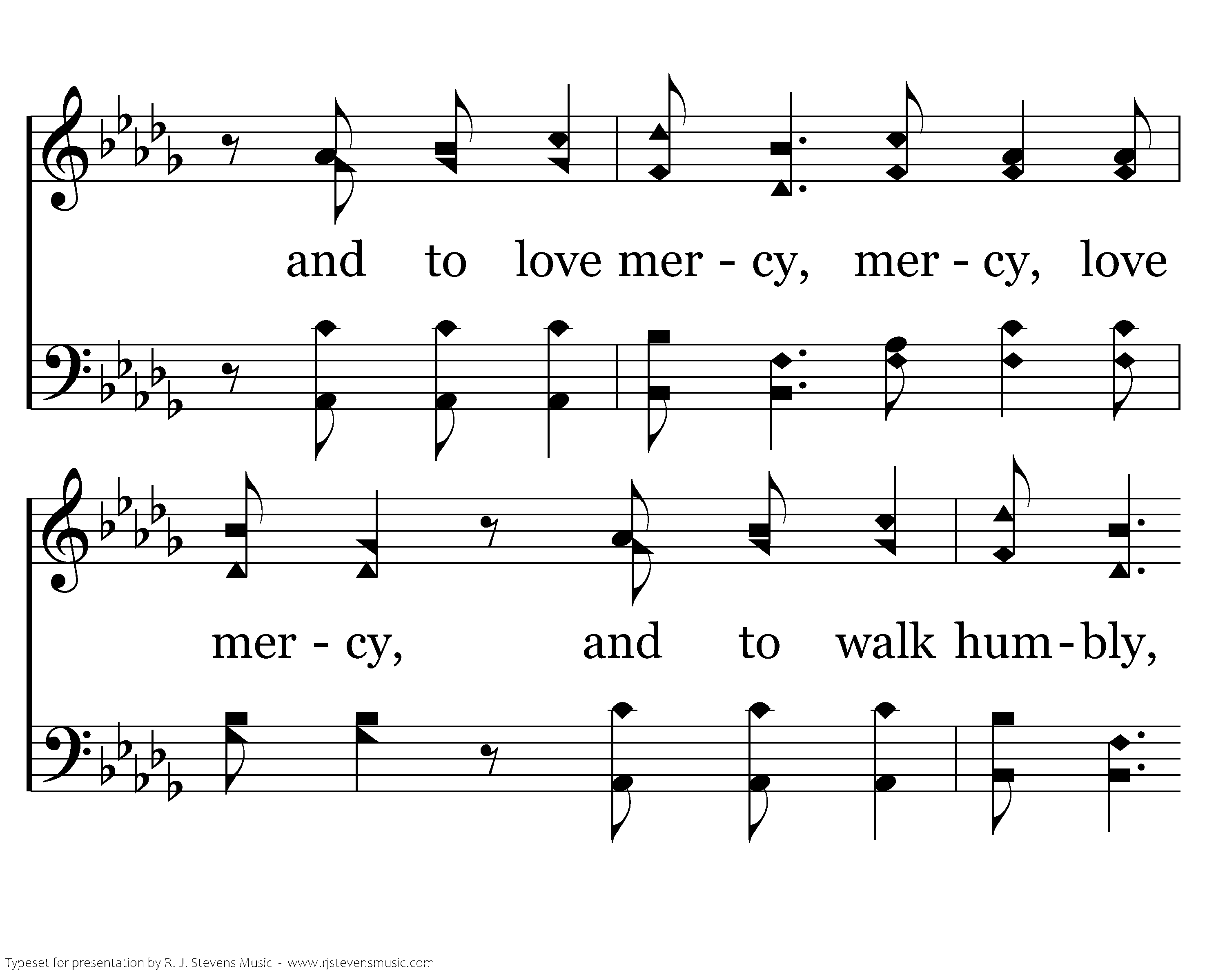 With what shall I come to the Lord and bow before God on high? Shall I give my firstborn to pay for my toll? The fruit of my body for sin of my soul? He showed you, O man, what is good, and what does the Lord require? But to do justice, justice, do justice, and to love mercy, mercy, love mercy, and to walk humbly, humbly, walk humbly with our God.
