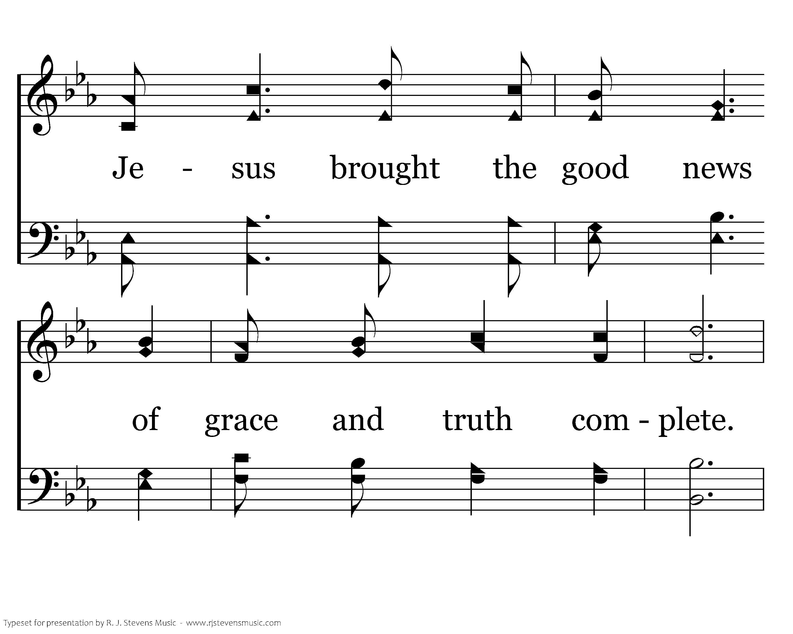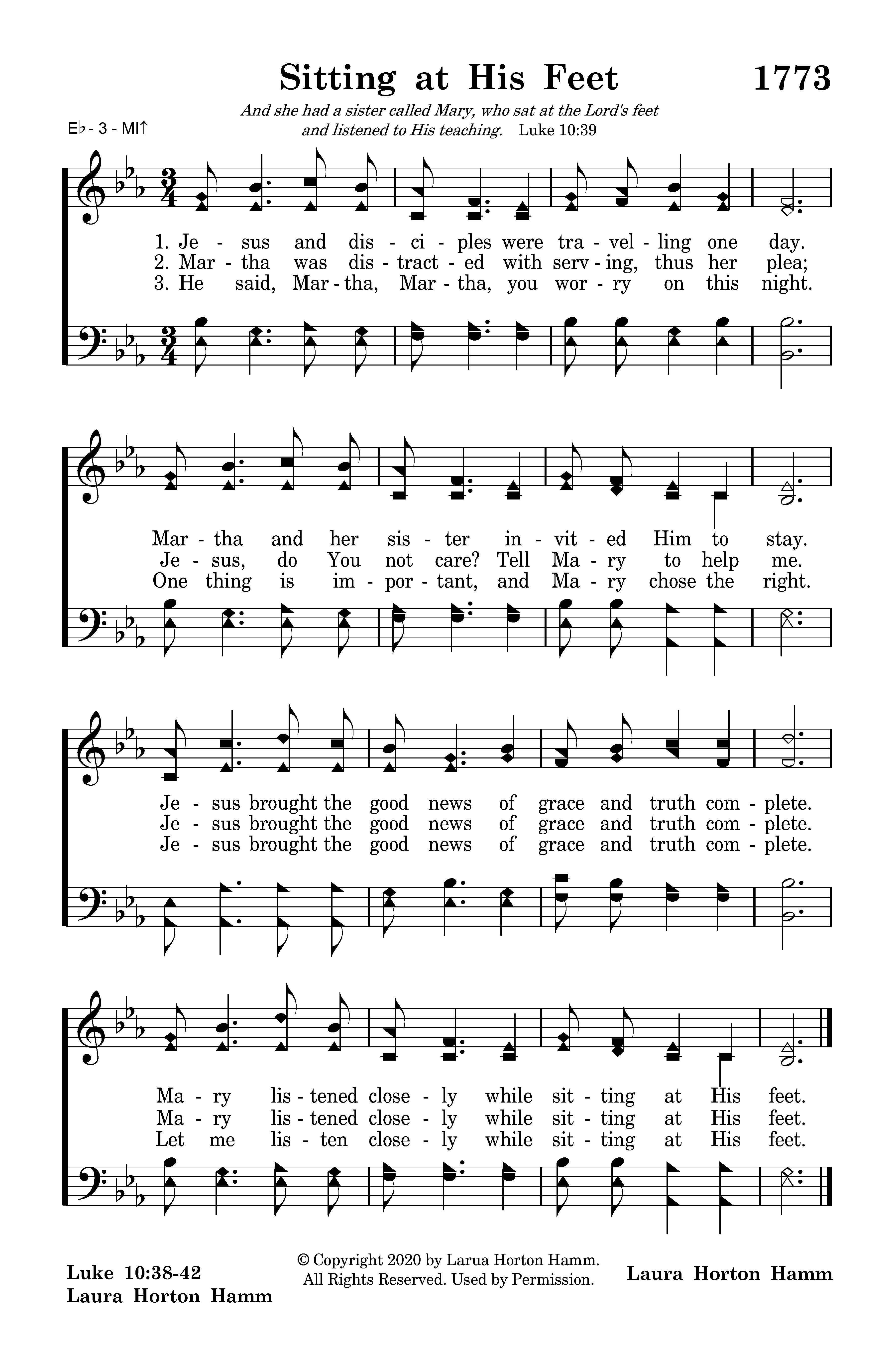 Jesus and disciples were travelling one day. Martha and her sister invited Him to stay. Jesus brought the good news of grace and truth complete. Mary listened closely while sitting at His feet.
