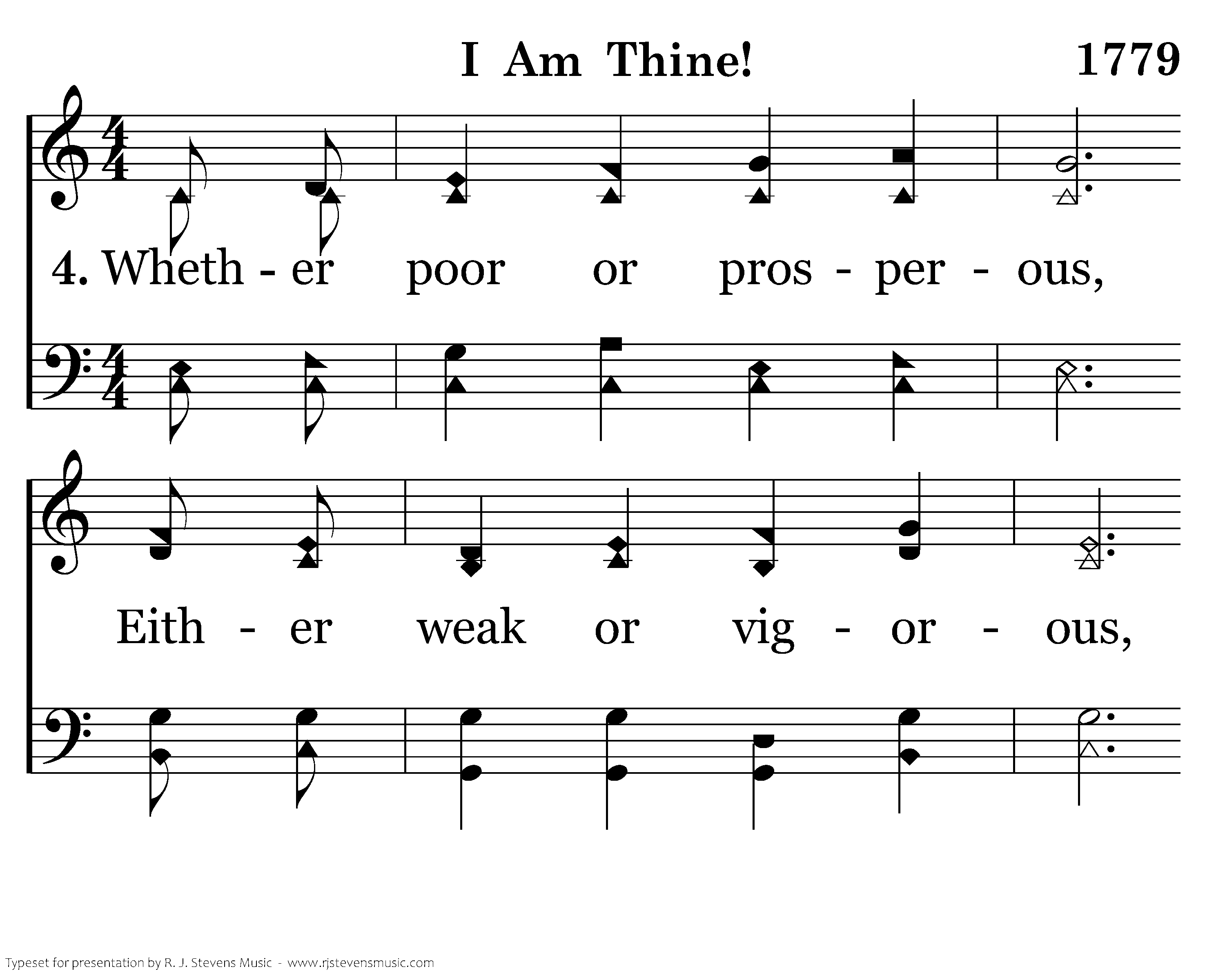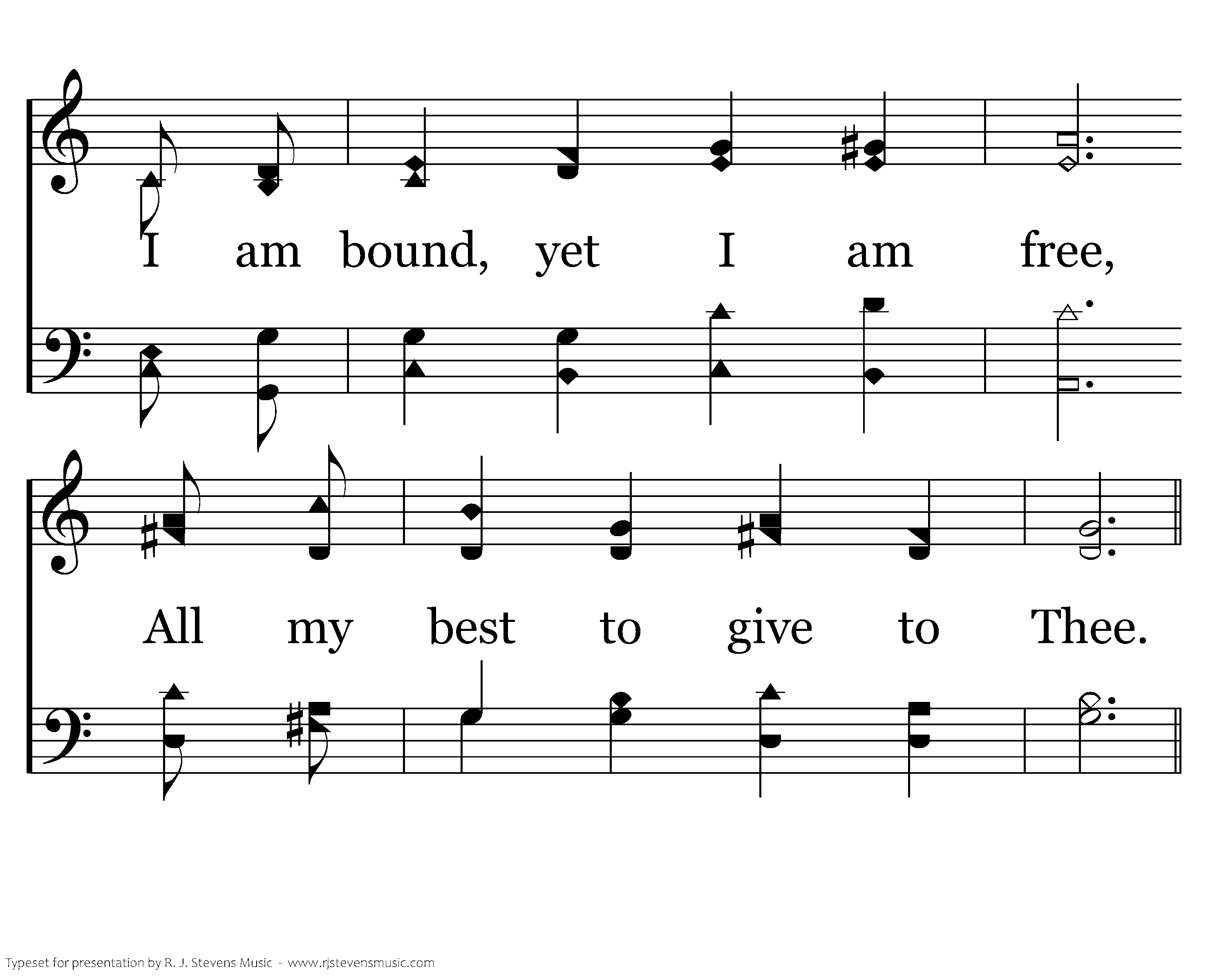 Whether poor or prosperous, Either weak or vigorous, I am bound, yet I am free, All my best to give to Thee.