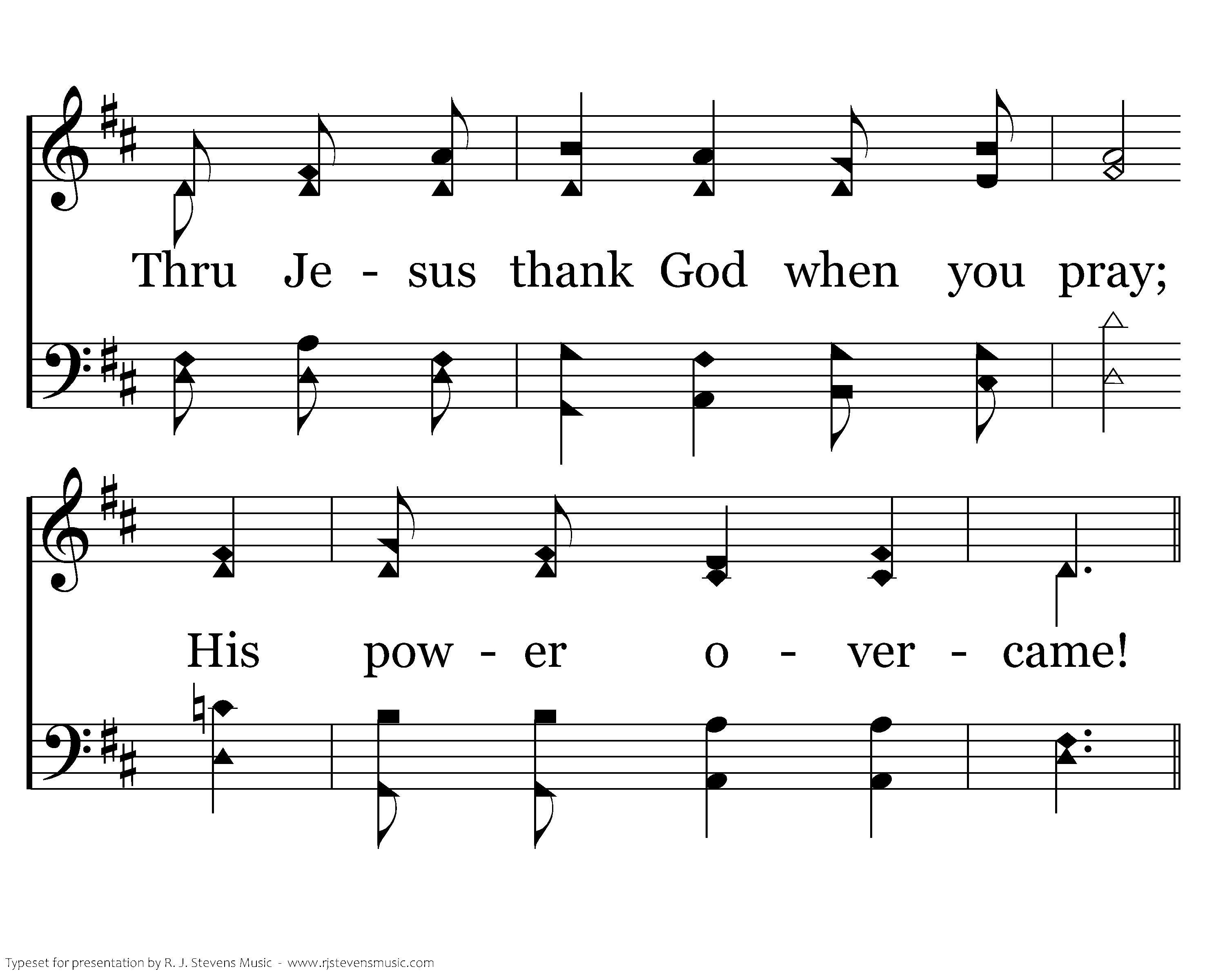 And put on love above all things; it binds us one and all. What perfect harmony love brings! Walk worthy of His call Whatever you will do or say, do all in Jesus' name. Thru Jesus thank God when you pray; His power overcame!