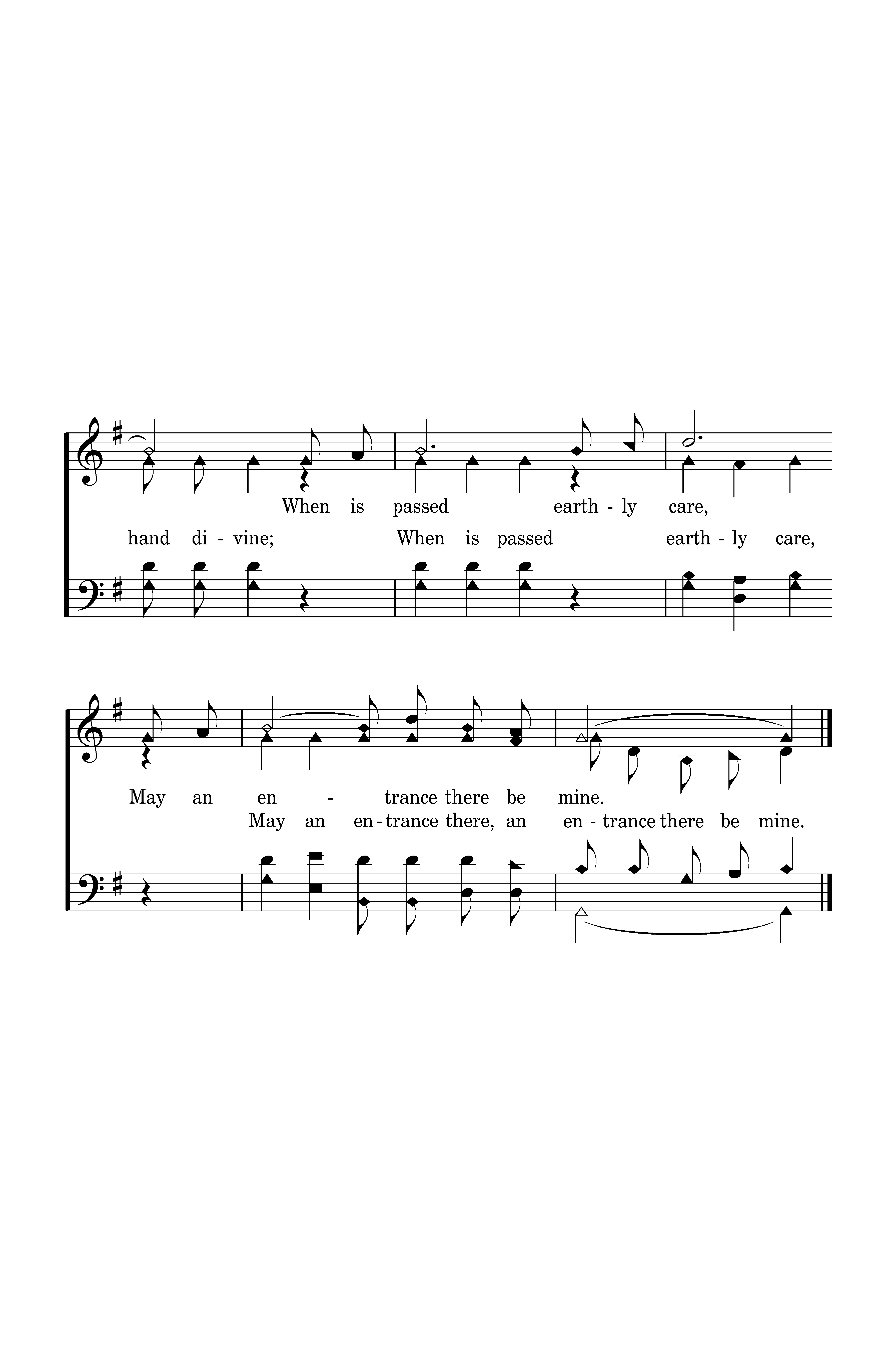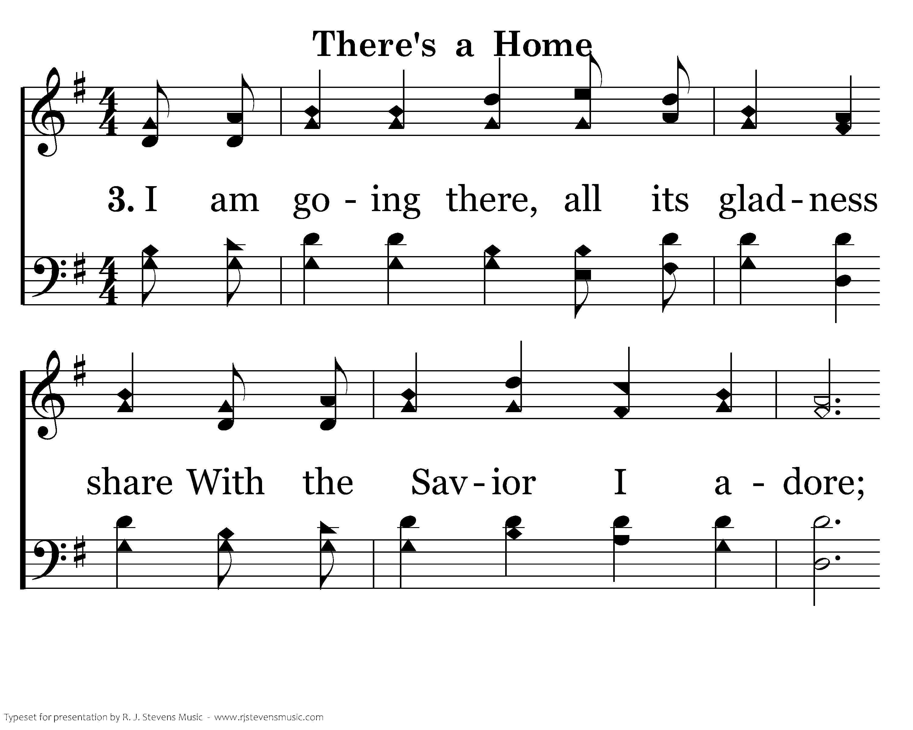 There's a home bright and fair, Fashioned by the hand divine; When is passed earthly care, May an entrance there, an entrance there be mine.