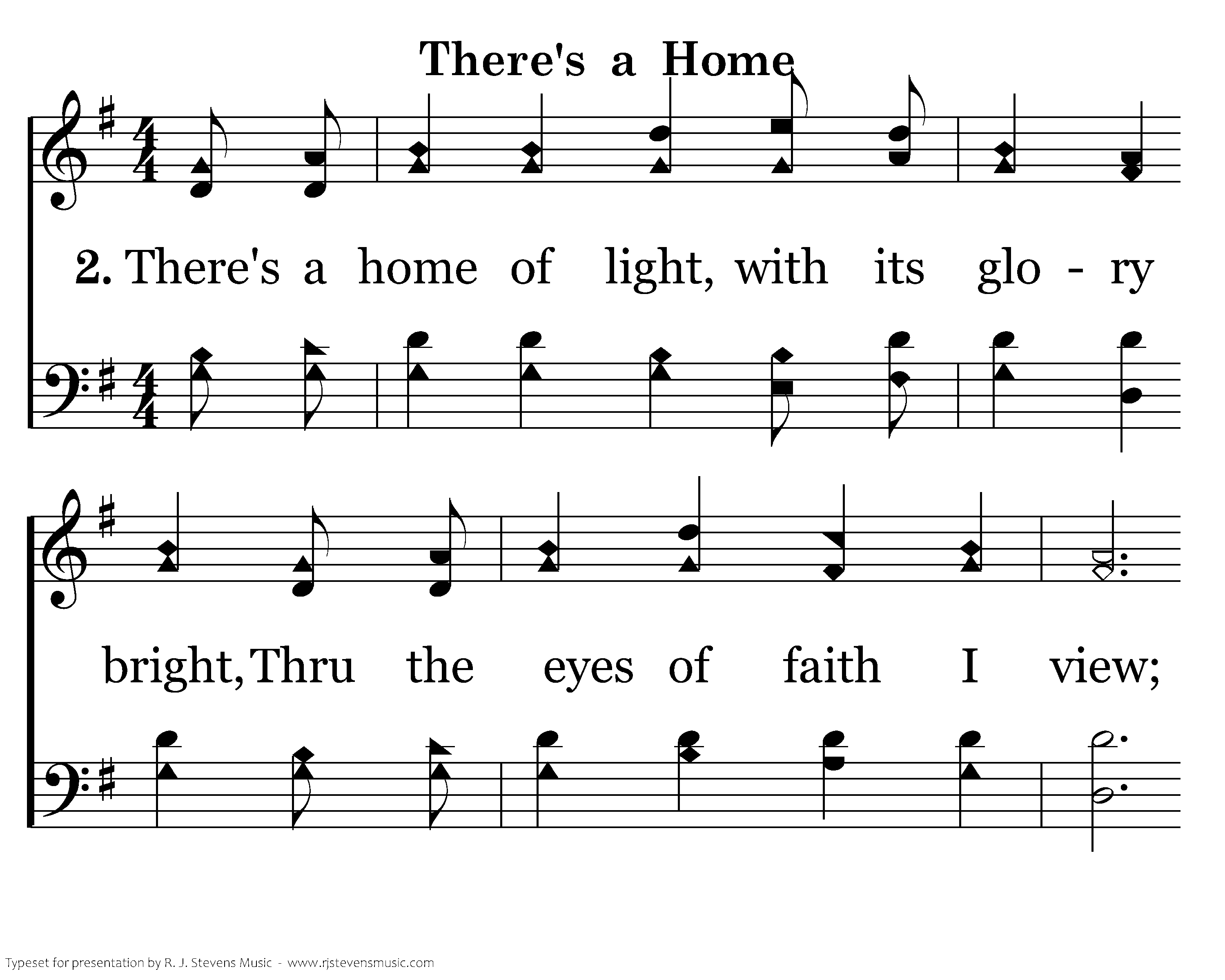 There's a home of light, with its glory bright, Thru the eyes of faith I view; Soon may come the time, when that sunny clime Shall be ours thru grace so true.