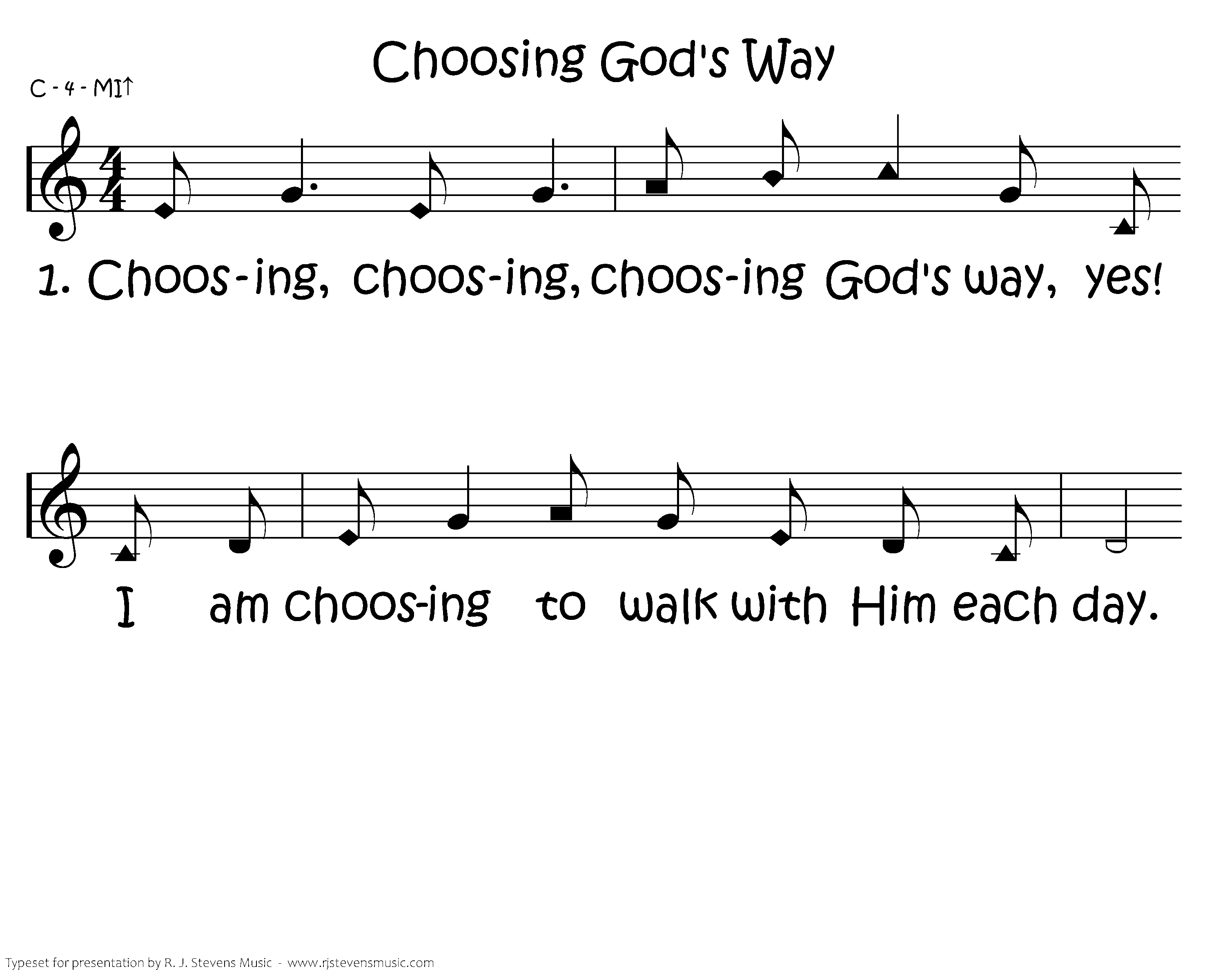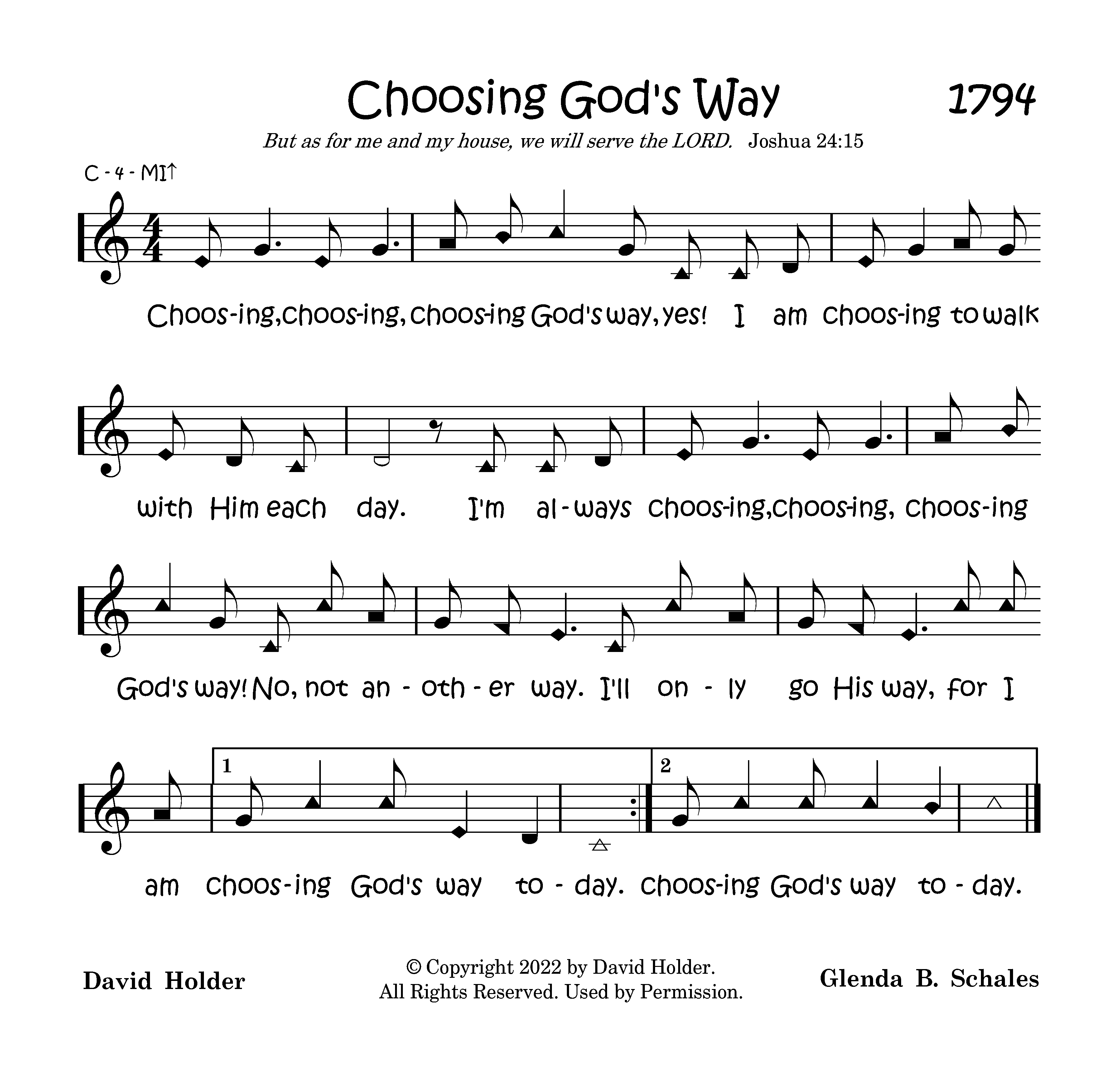 Choosing, choosing, choosing God's way, yes! I am choosing to walk with Him each day. I'm always choosing, choosing, choosing God's way! No, not another way. I'll only go His way, for I am choosing God's way today. God's way today. choosing God's way to Choosing, choosing, choosing God's way, yes! I am choosing to walk with Him each day. I'm always choosing, choosing, choosing God's way! No, not another way. I'll only go His way, for I am choosing God's way today.