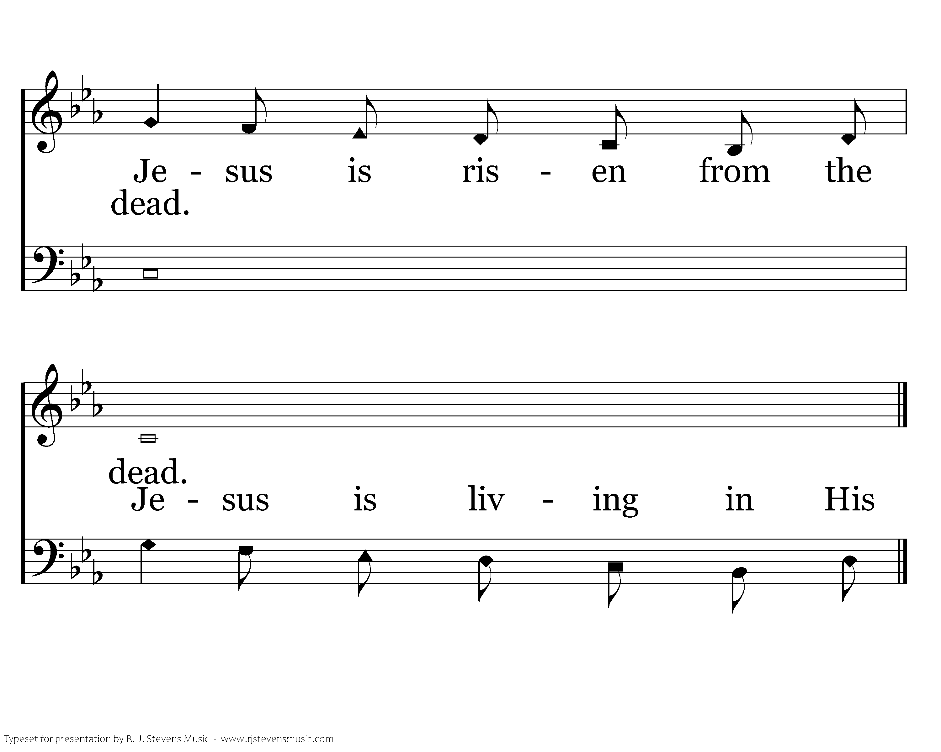 Jesus is risen from the dead, Jesus is risen Jesus is risen from the dead. dead, Jesus is risen from the dead. Jesus is risen, Jesus is risen, Jesus is risen from the dead. Jesus is living in His dead.