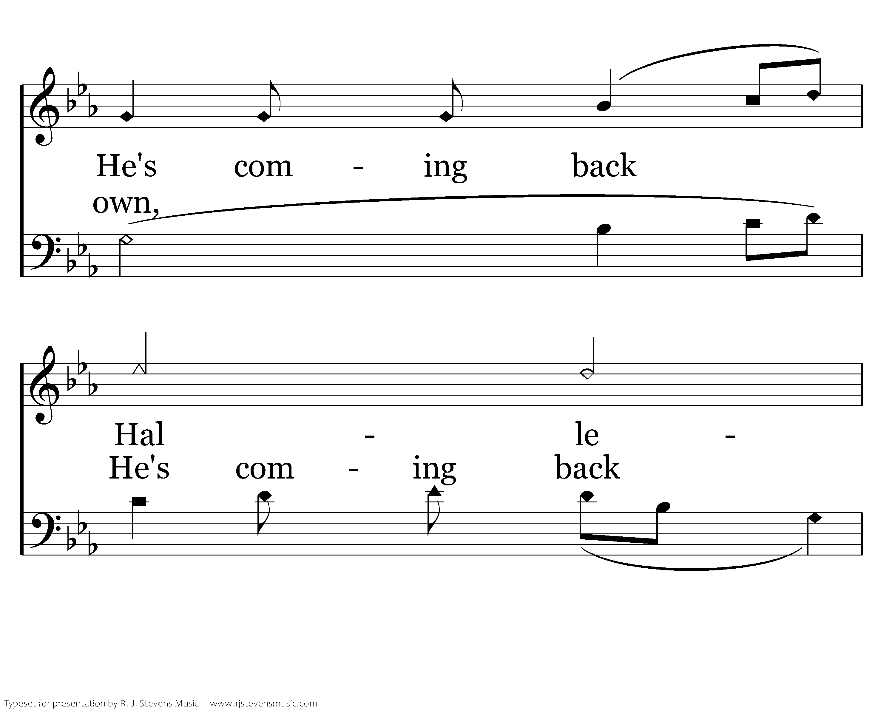 He's coming back to claim His own, He's coming back He's coming back to claim His own. own, He's coming back to claim His own. He's coming back, He's coming back, He's coming back to claim His own. Sing hallelujah to the own.