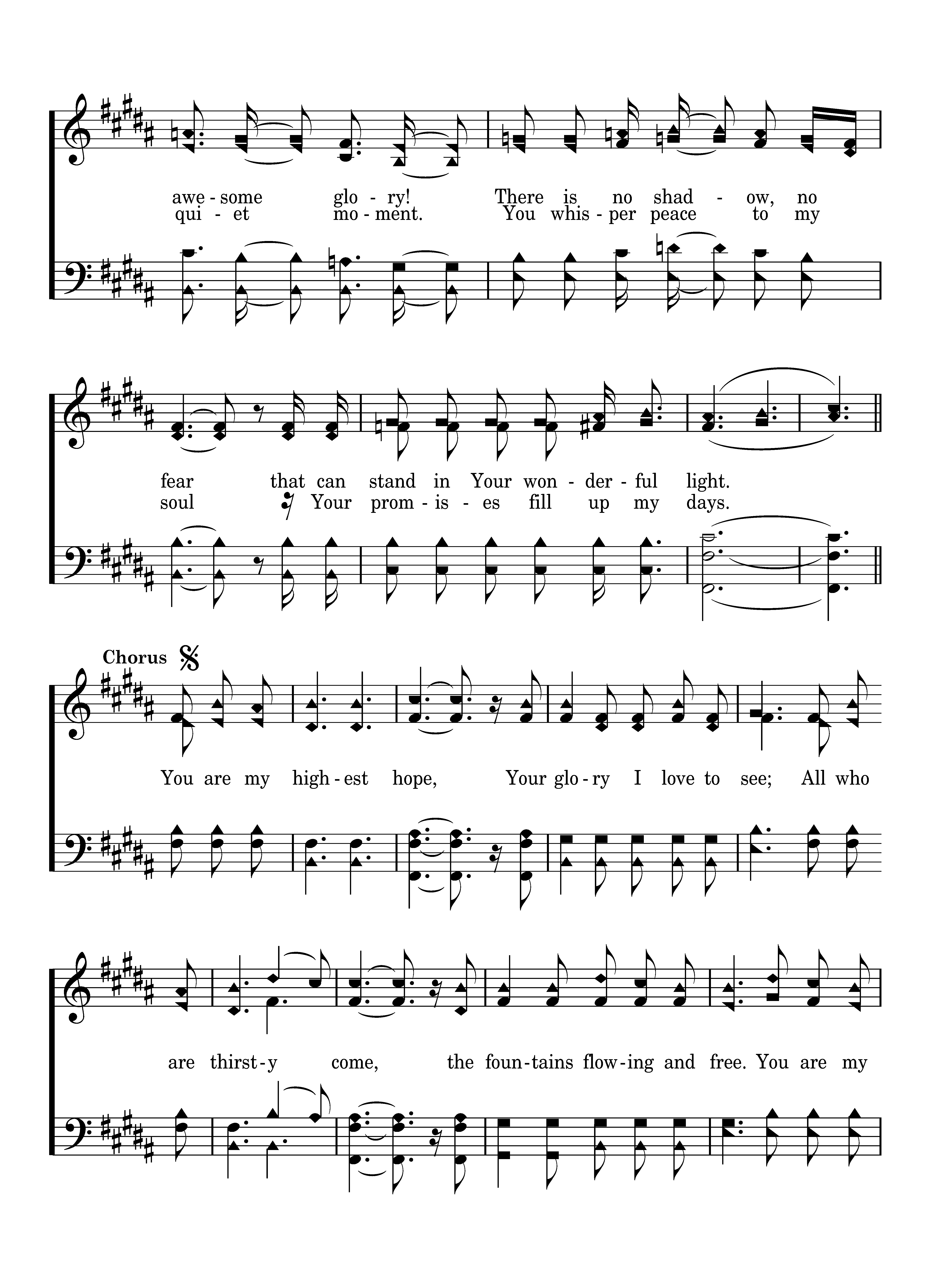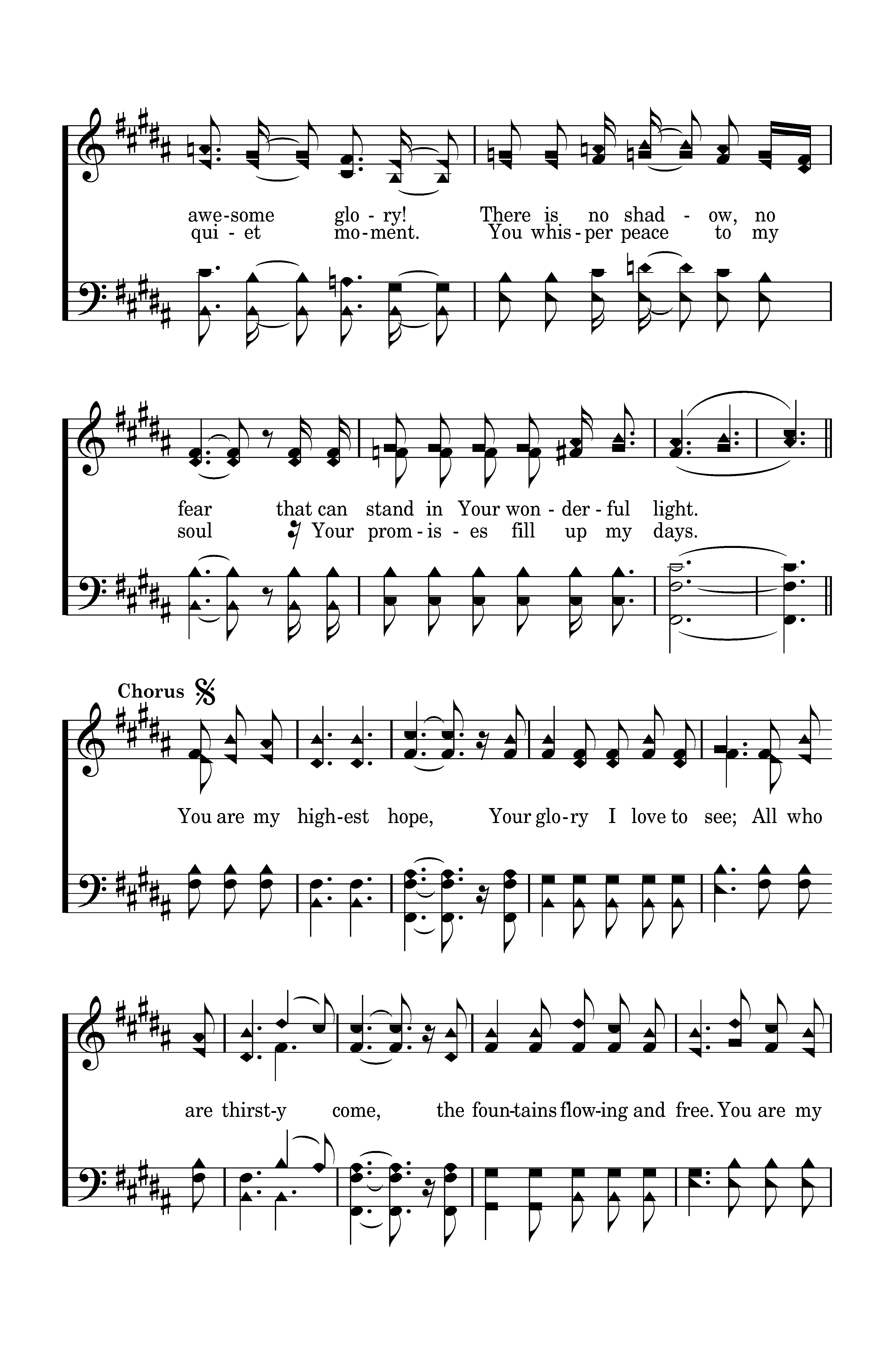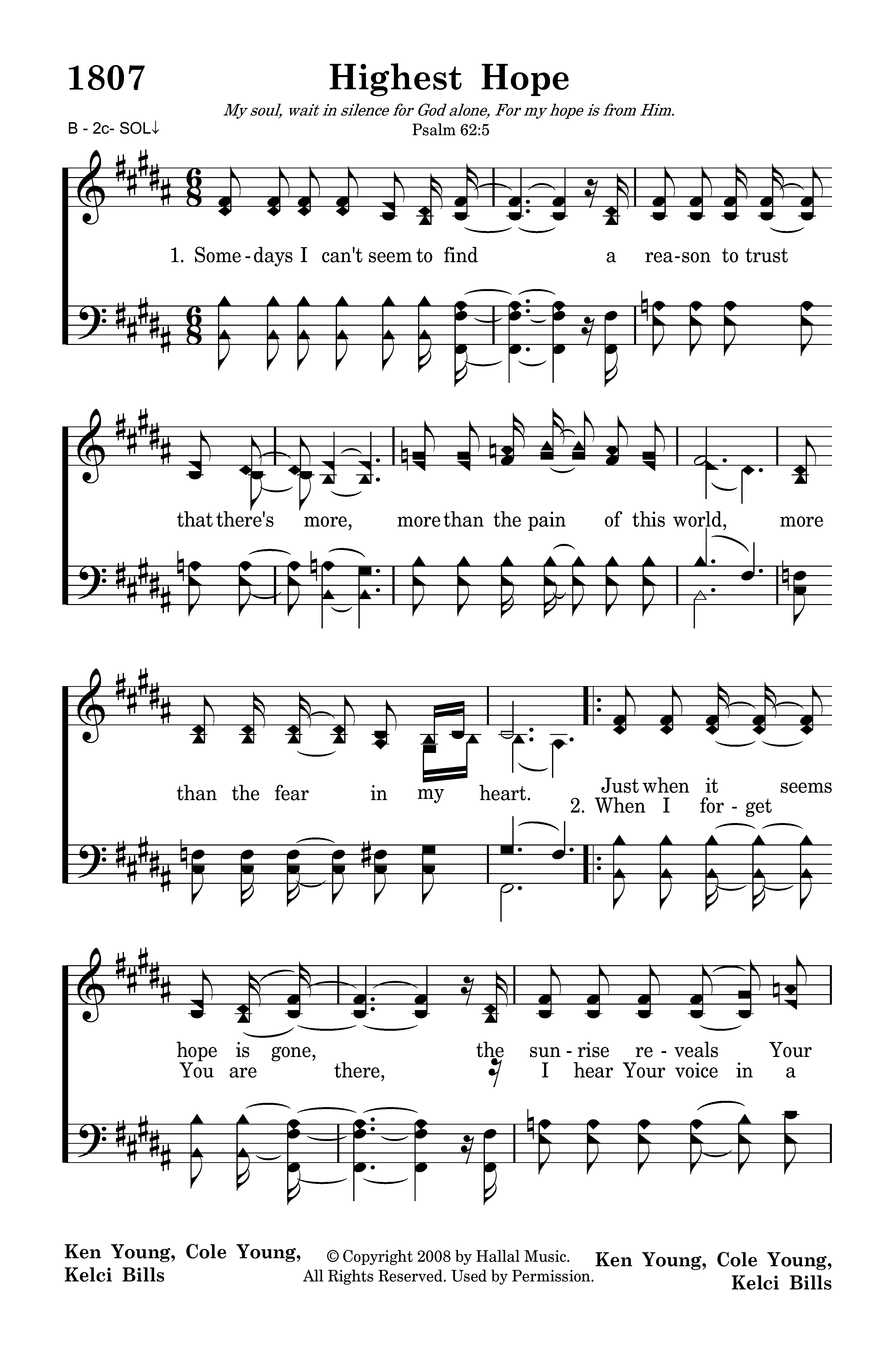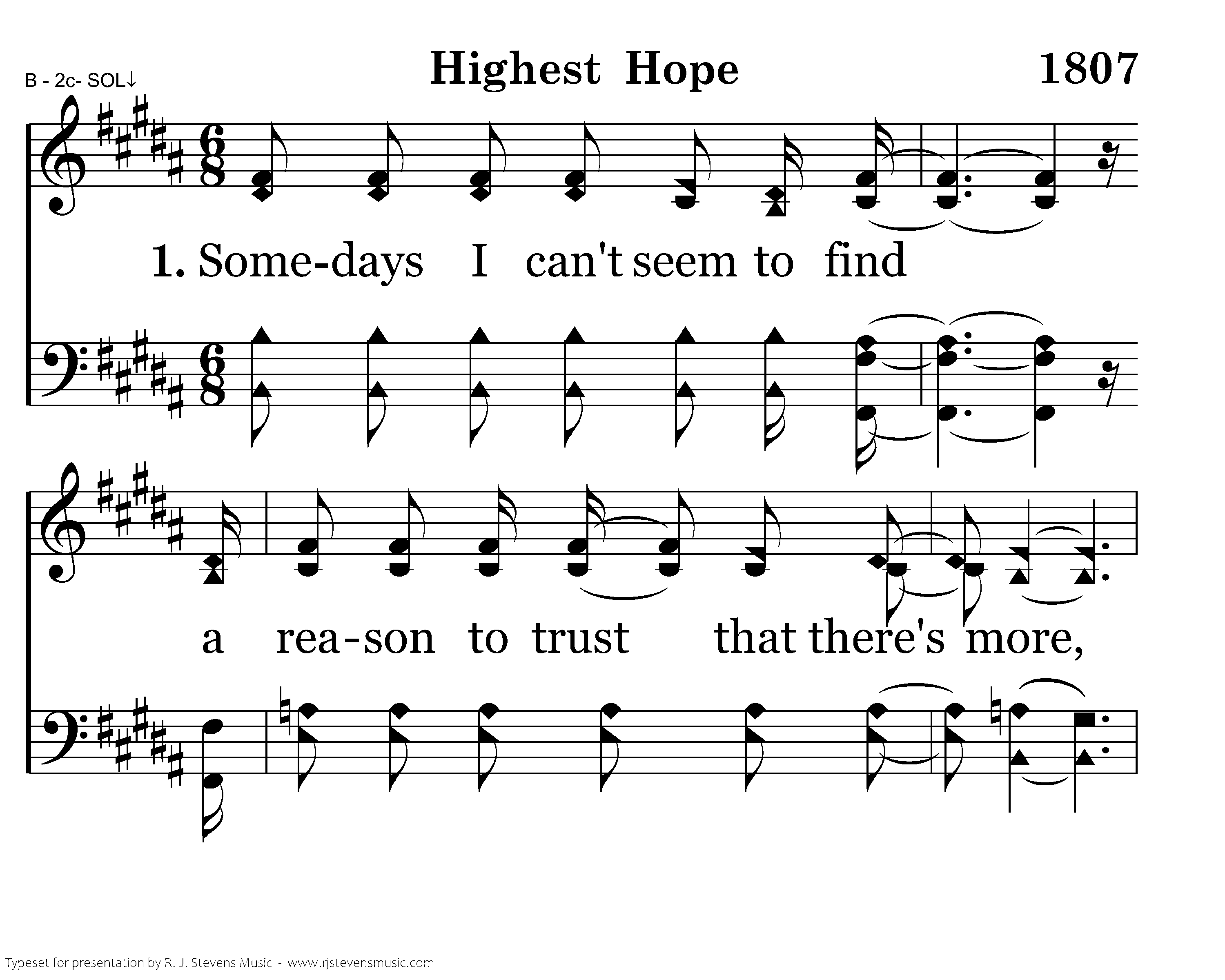 Somedays I can't seem to find a reason to trust that there's more, more than the pain of this world, more than the fear in my heart. Just when it seems hope is gone, the sunrise reveals Your awesome glory! There is no shadow, no fear that can stand in Your wonderful light. You are my highest hope, Your glory I love to see; All who are thirsty come, the fountains flowing and free. You are my rest, You are my peace, You are the hope for all who believe. Faithful and true, King of all kings, You always will be my highest hope.