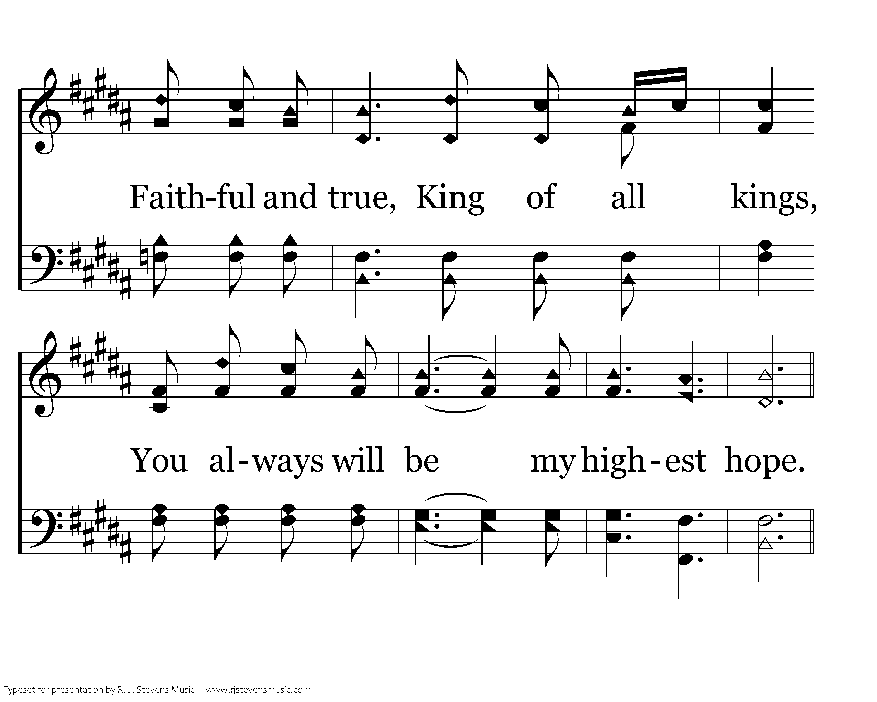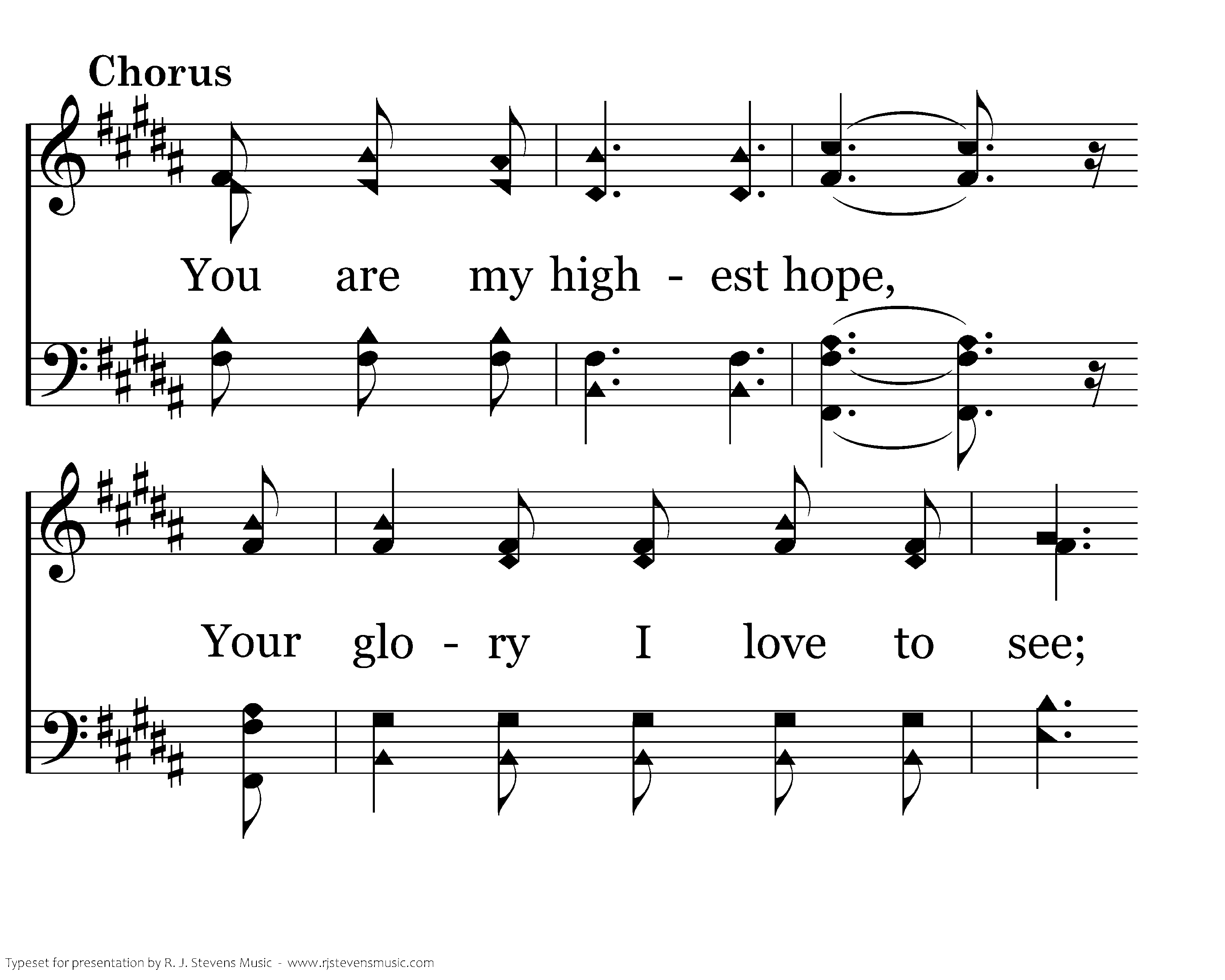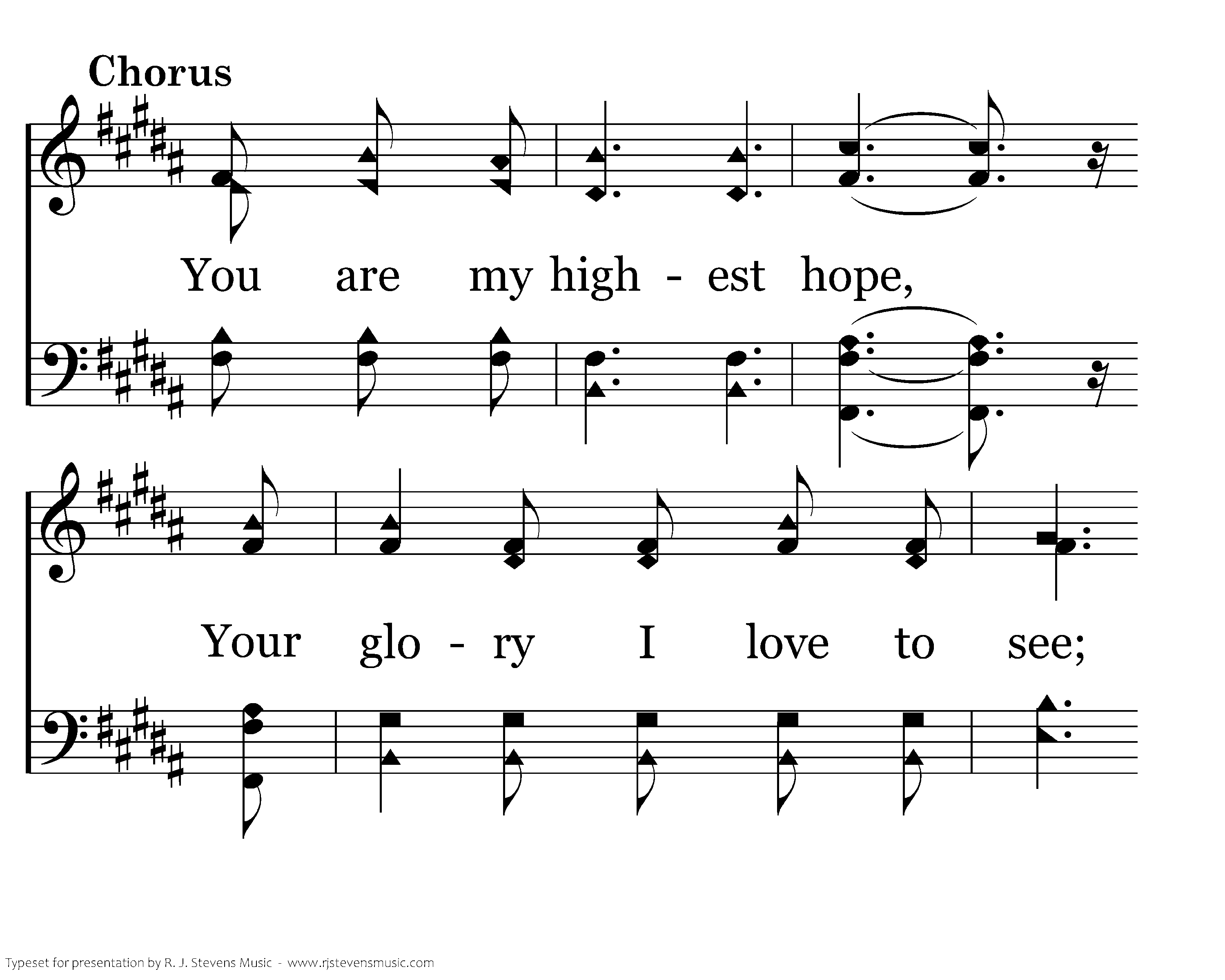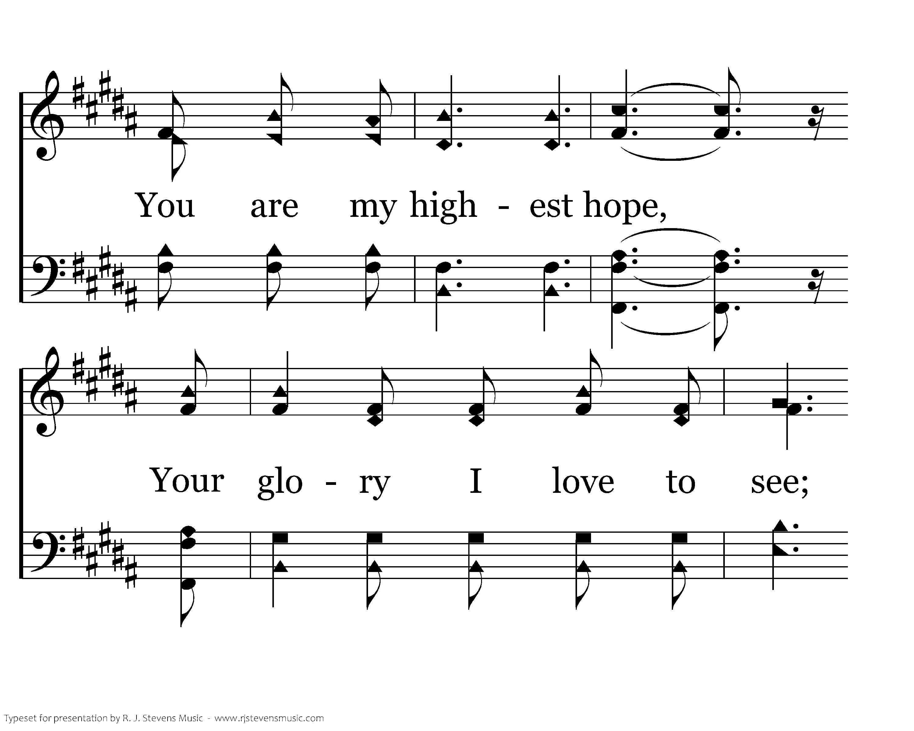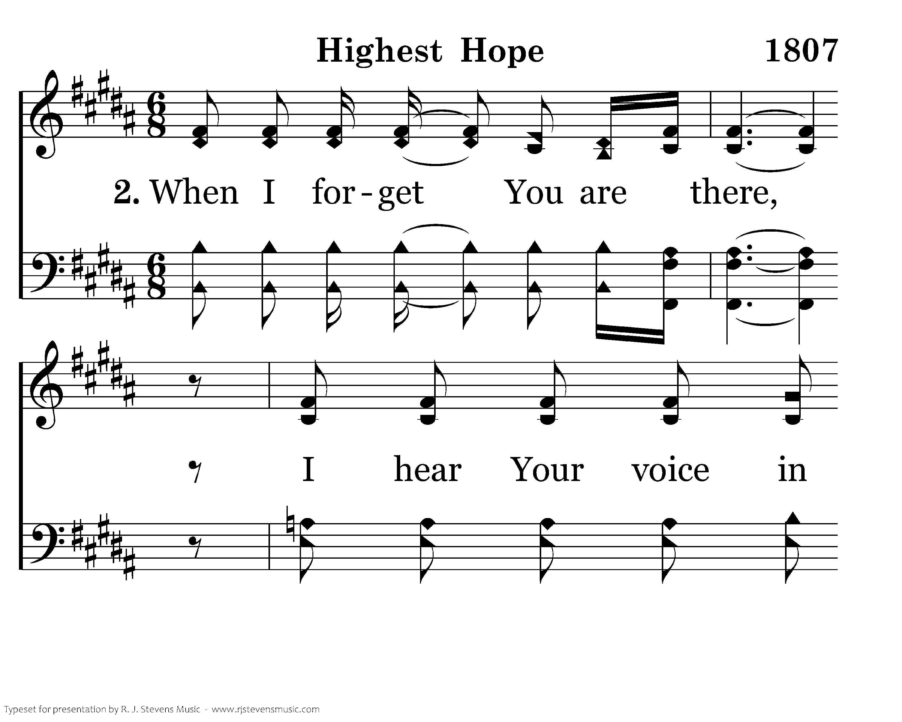 When I forget You are there, I hear Your voice in a quiet moment. You whisper peace to my soul Your promises fill up my days. You are my highest hope, Your glory I love to see; All who are thirsty come, the fountains flowing and free. You are my rest, You are my peace, You are the hope for all who believe. Faithful and true, King of all kings, You always will be my highest hope. Come to the table of blessing, enter His courts with praise; Goodness and mercy will surely follow me all of my days. You are my highest hope, Your glory I love to see; All who are thirsty come, the fountains flowing and free. You are my rest, You are my peace, You are the hope for all who believe. Faithful and true, King of all kings, You always will be my highest hope.
