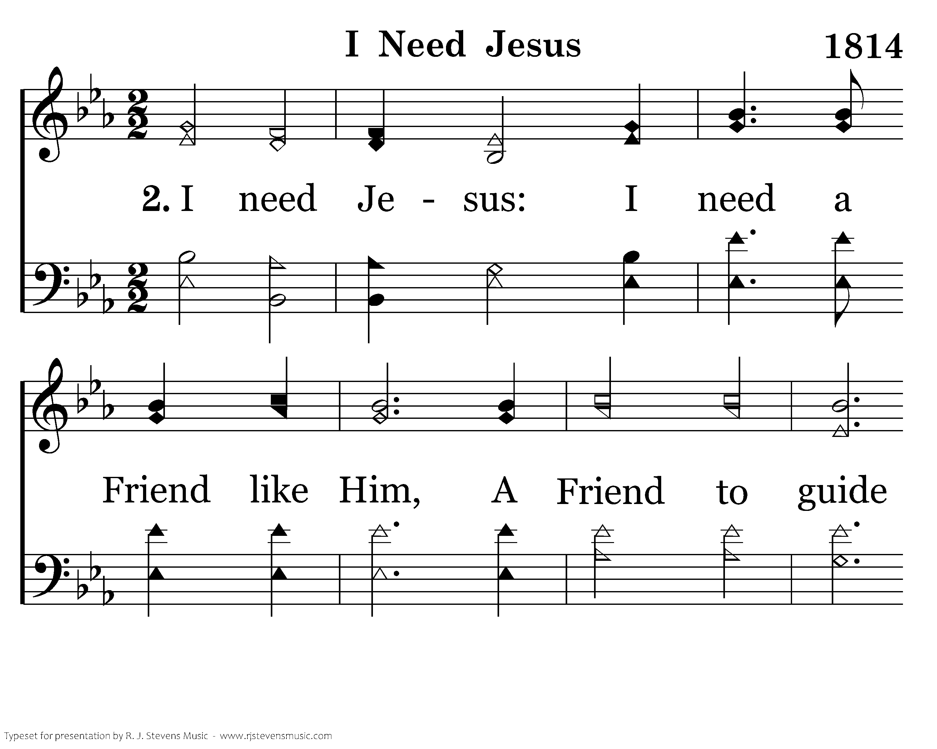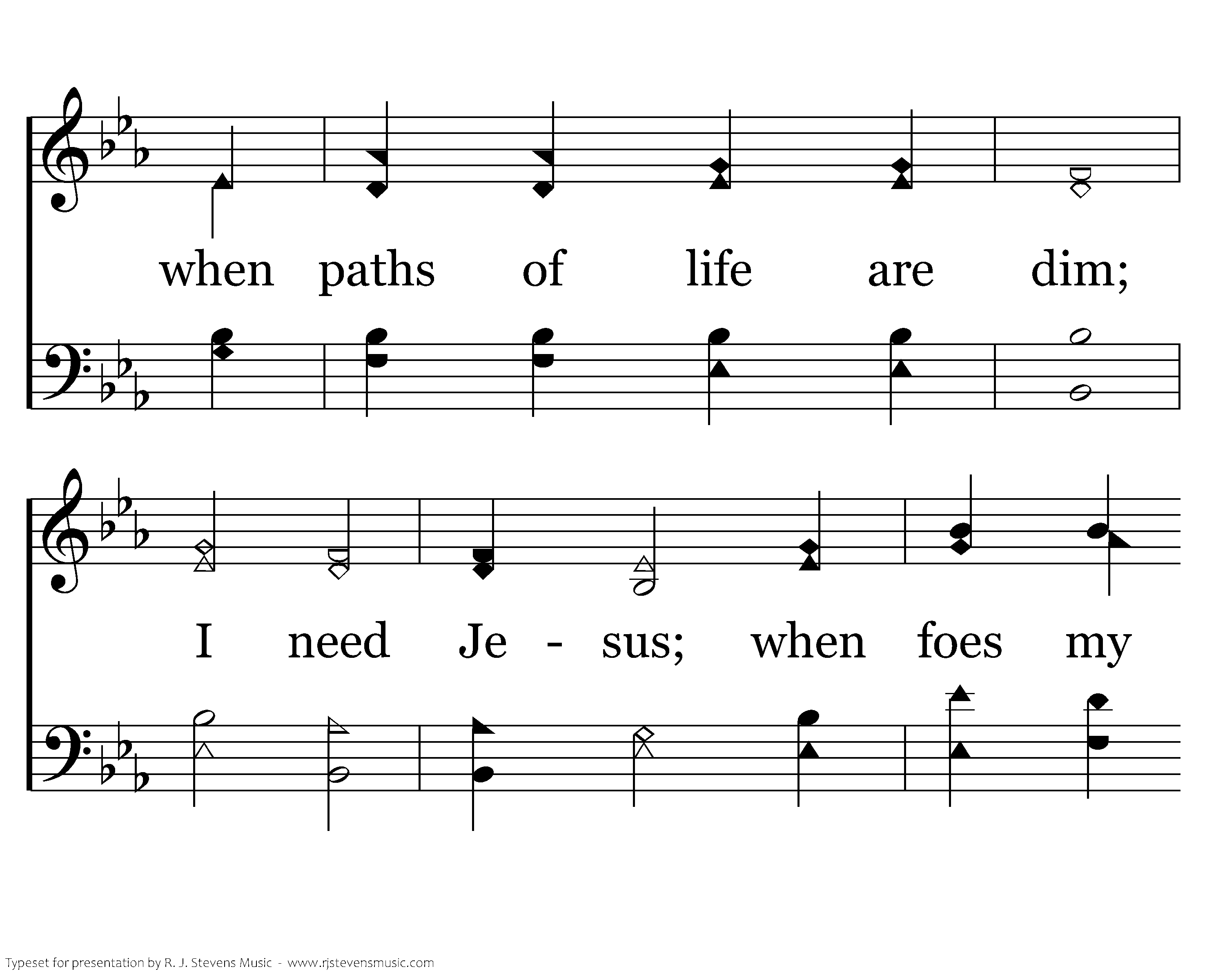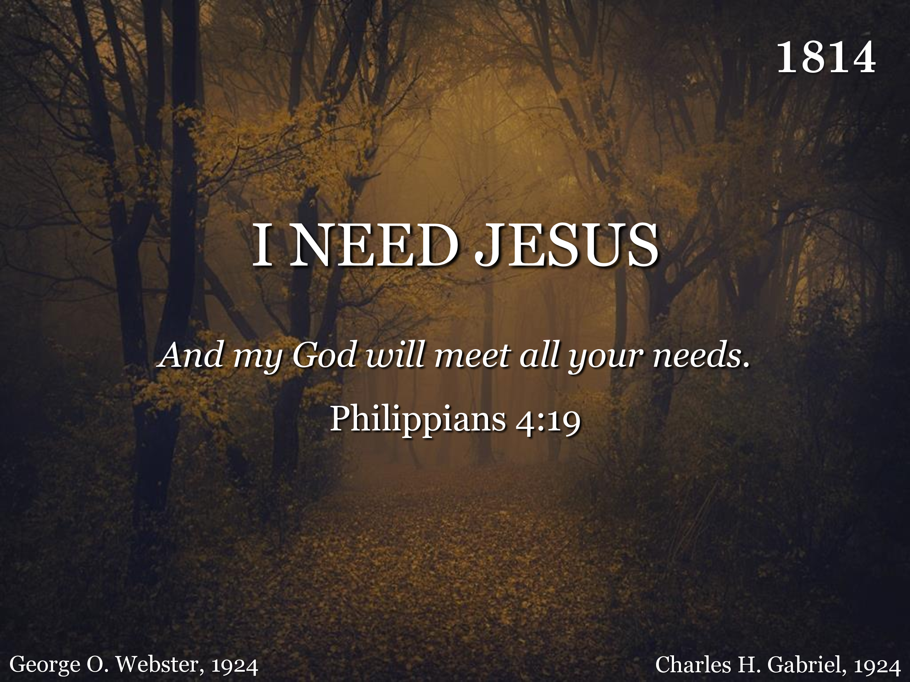 I need Jesus: I need a Friend like Him, A Friend to guide when paths of life are dim; I need Jesus; when foes my soul assail, Alone, I know I can but fail, So I need Jesus.