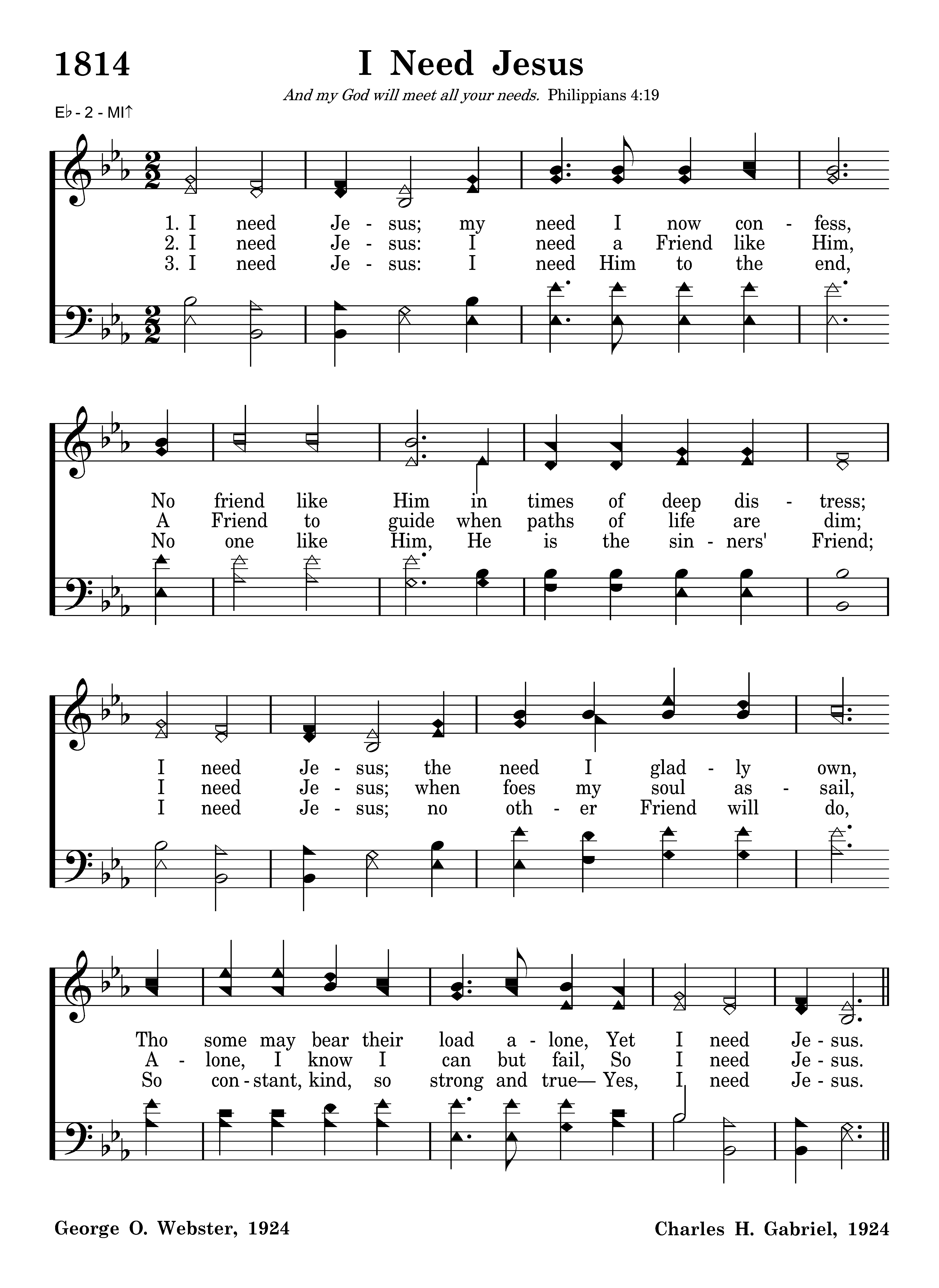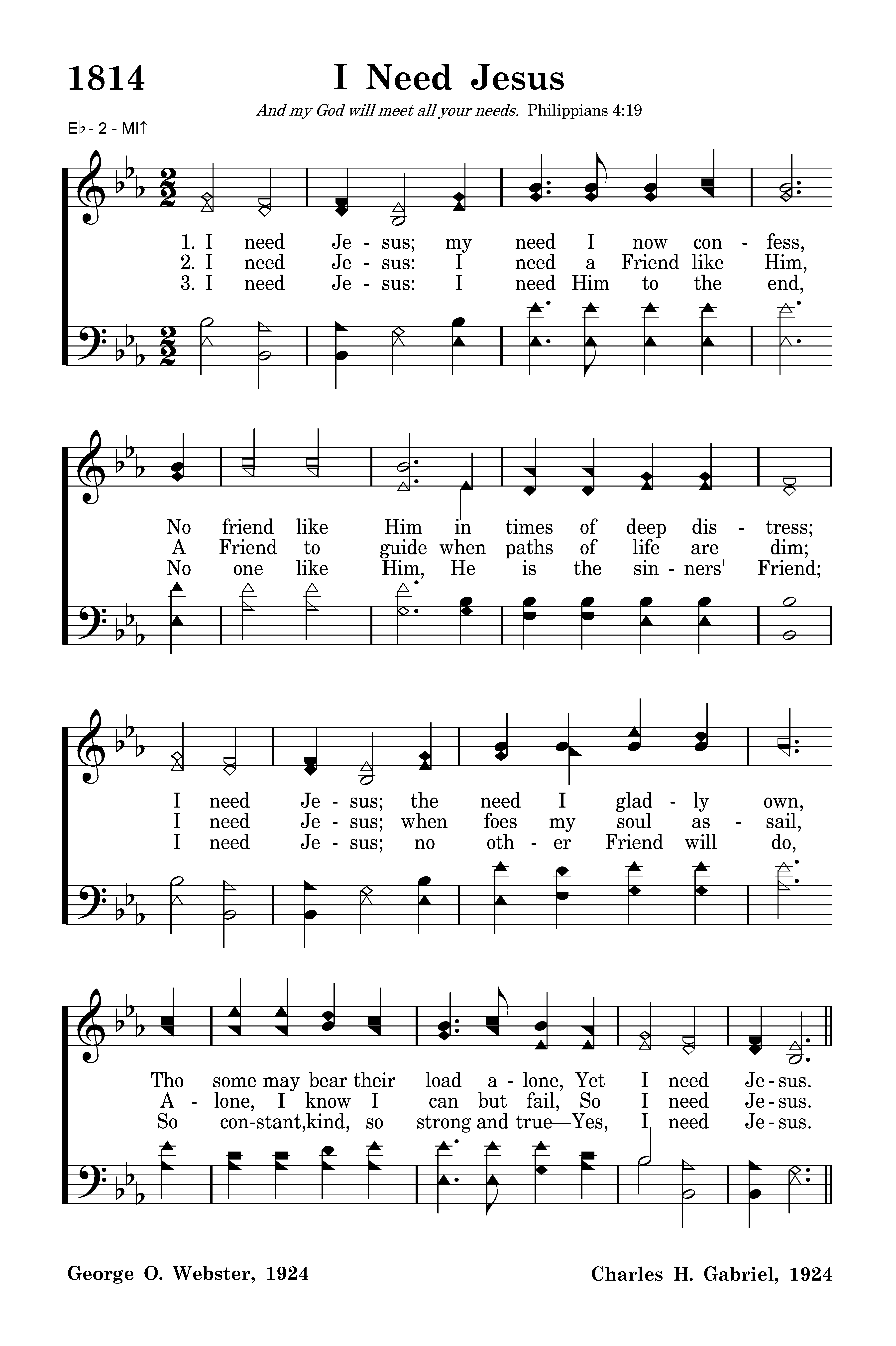 I need Jesus; my need I now confess, No friend like Him in times of deep distress; I need Jesus; the need I gladly own, Tho some may bear their load alone, Yet I need Jesus.