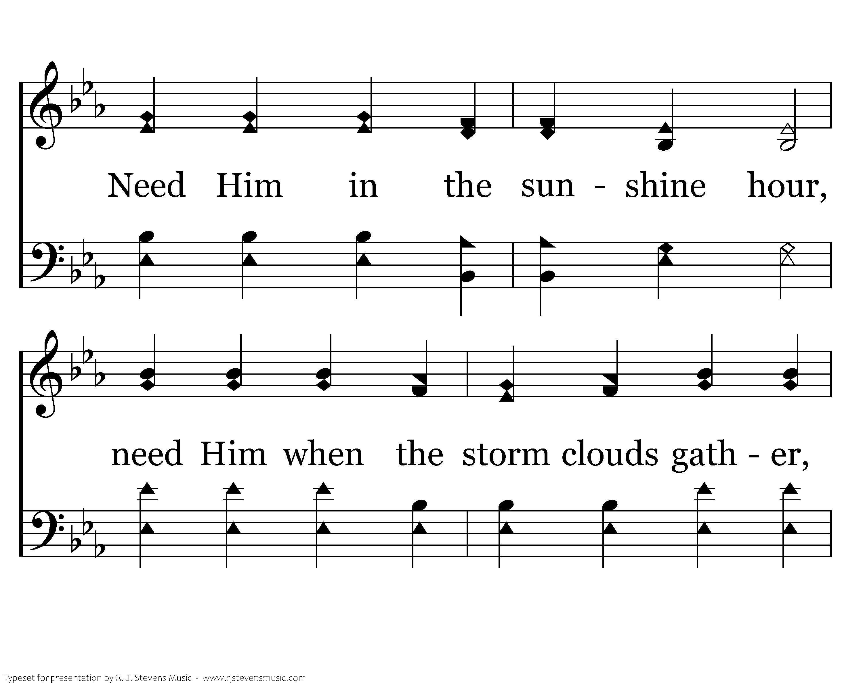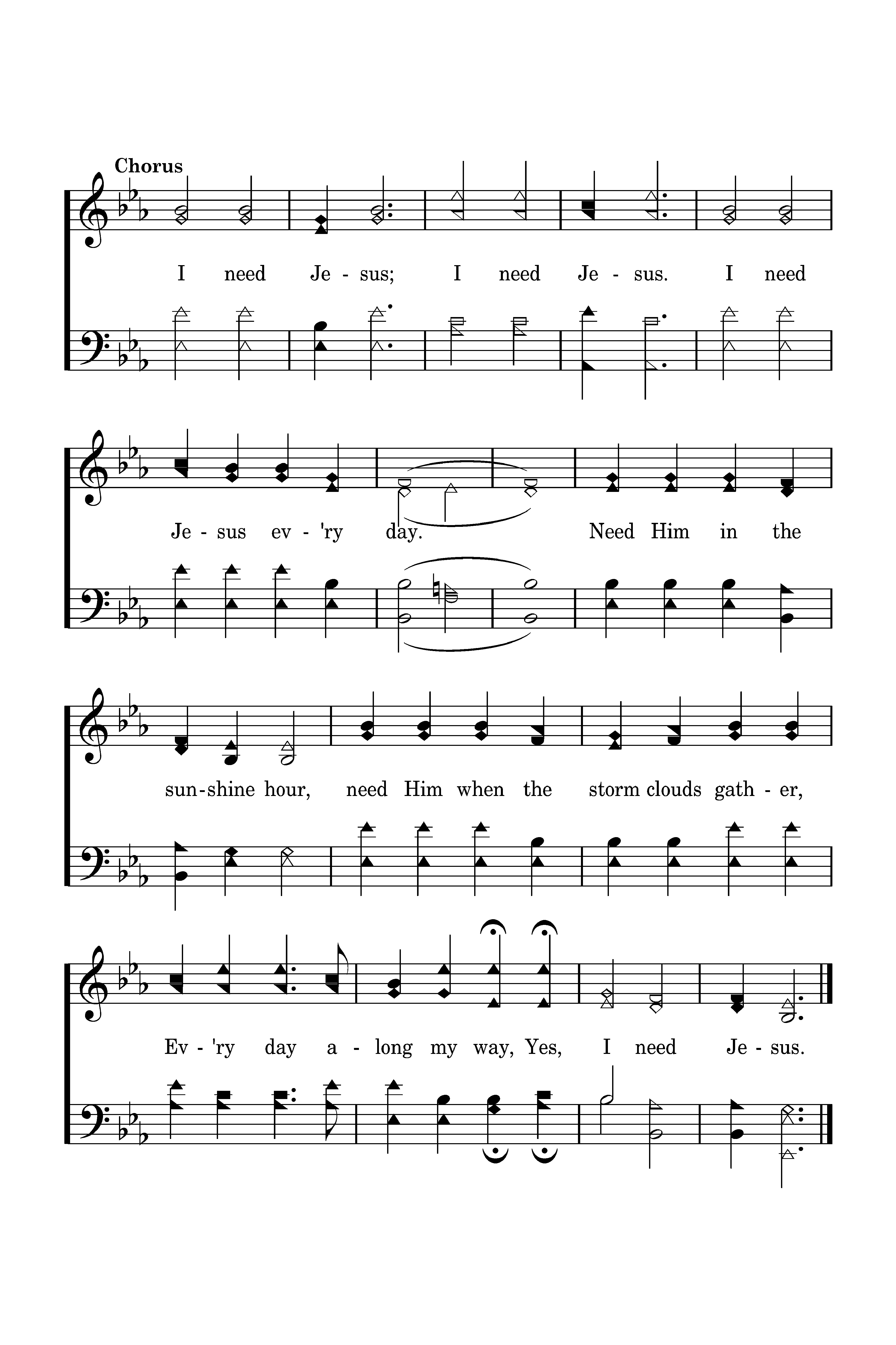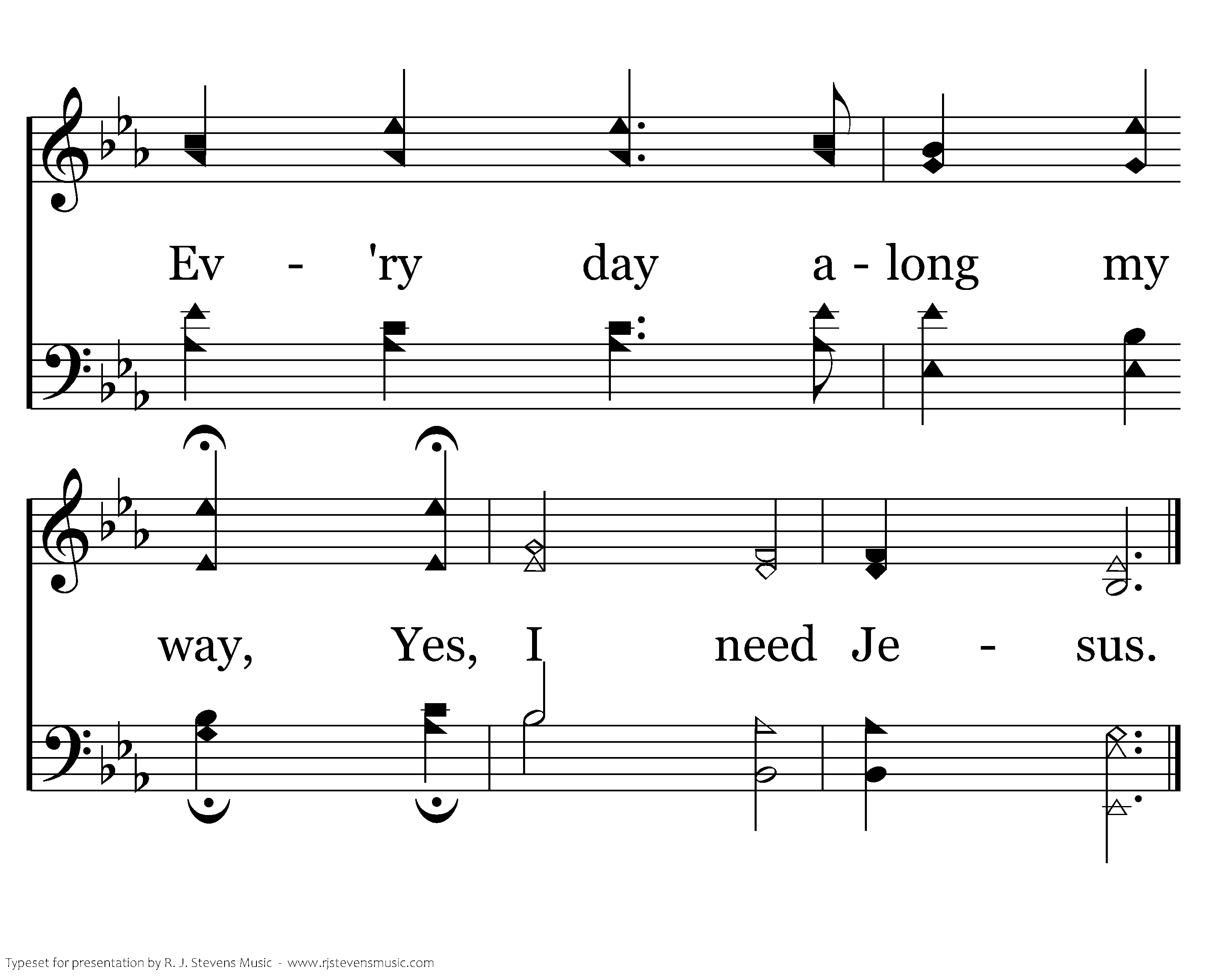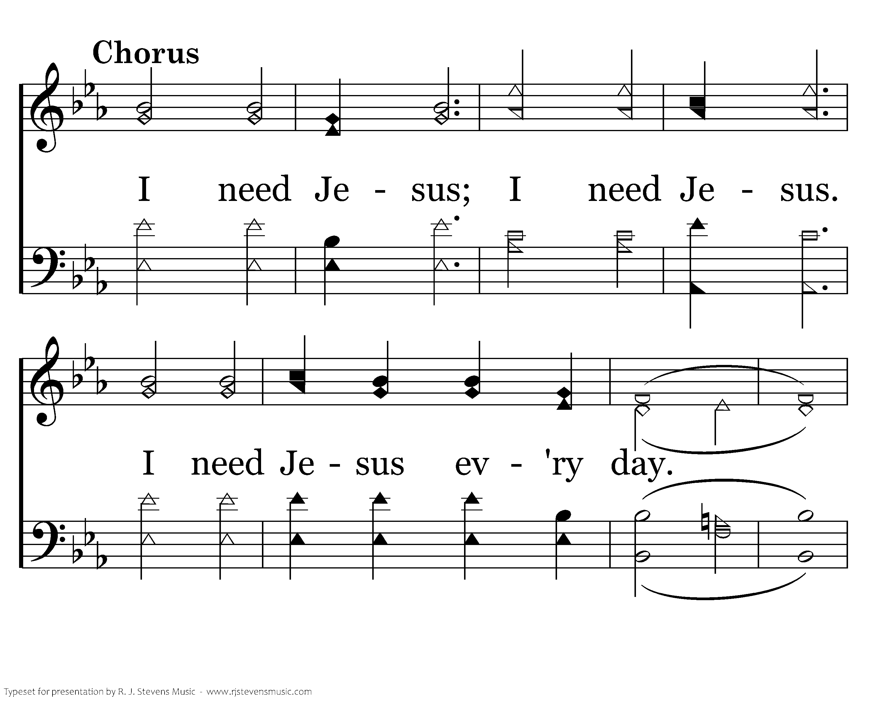 I need Jesus; I need Jesus. I need Jesus ev'ry day. Need Him in the sunshine hour, need Him when the storm clouds gather, Ev'ry day along my way, Yes, I need Jesus.