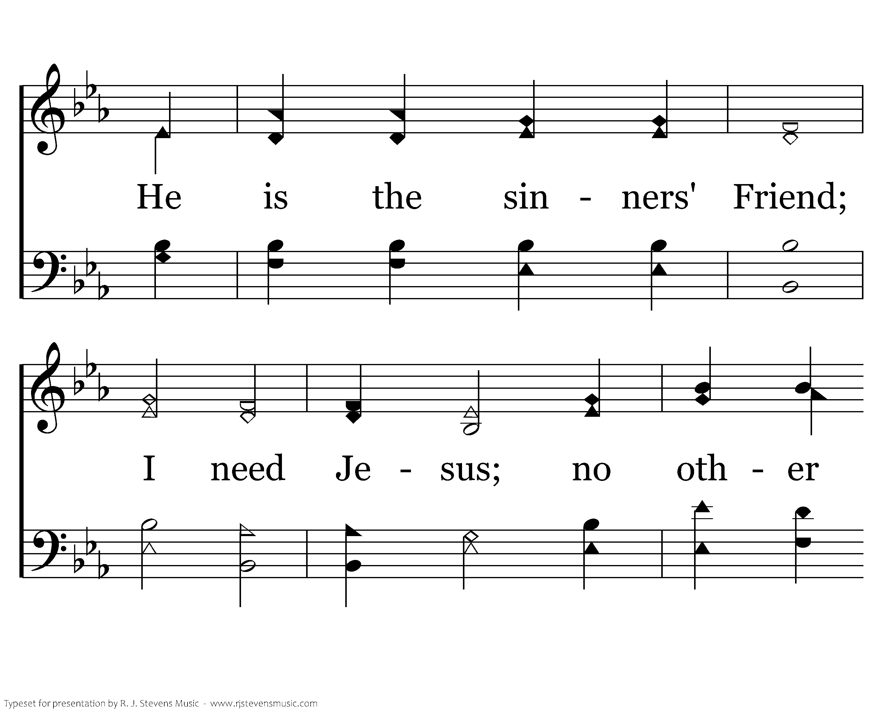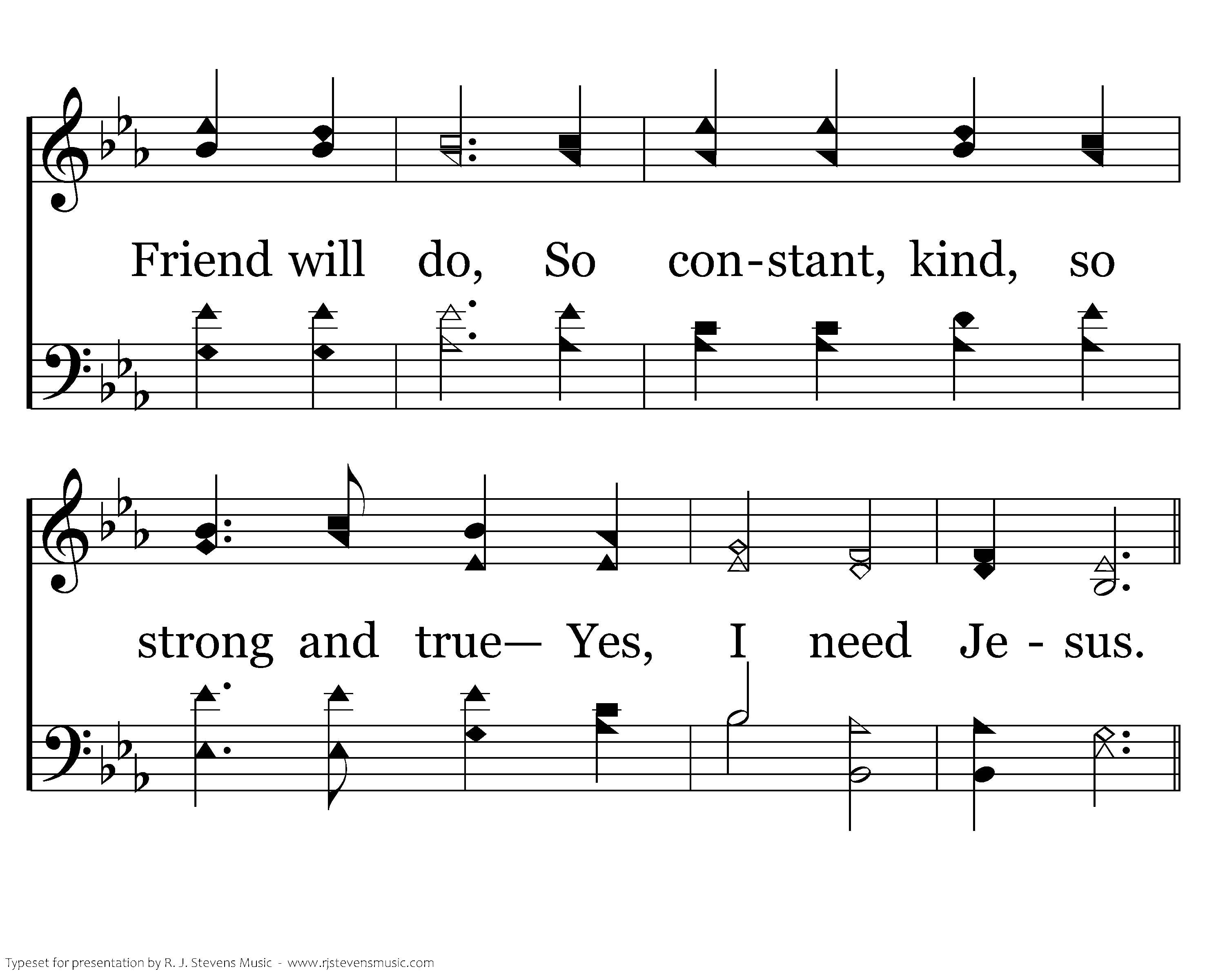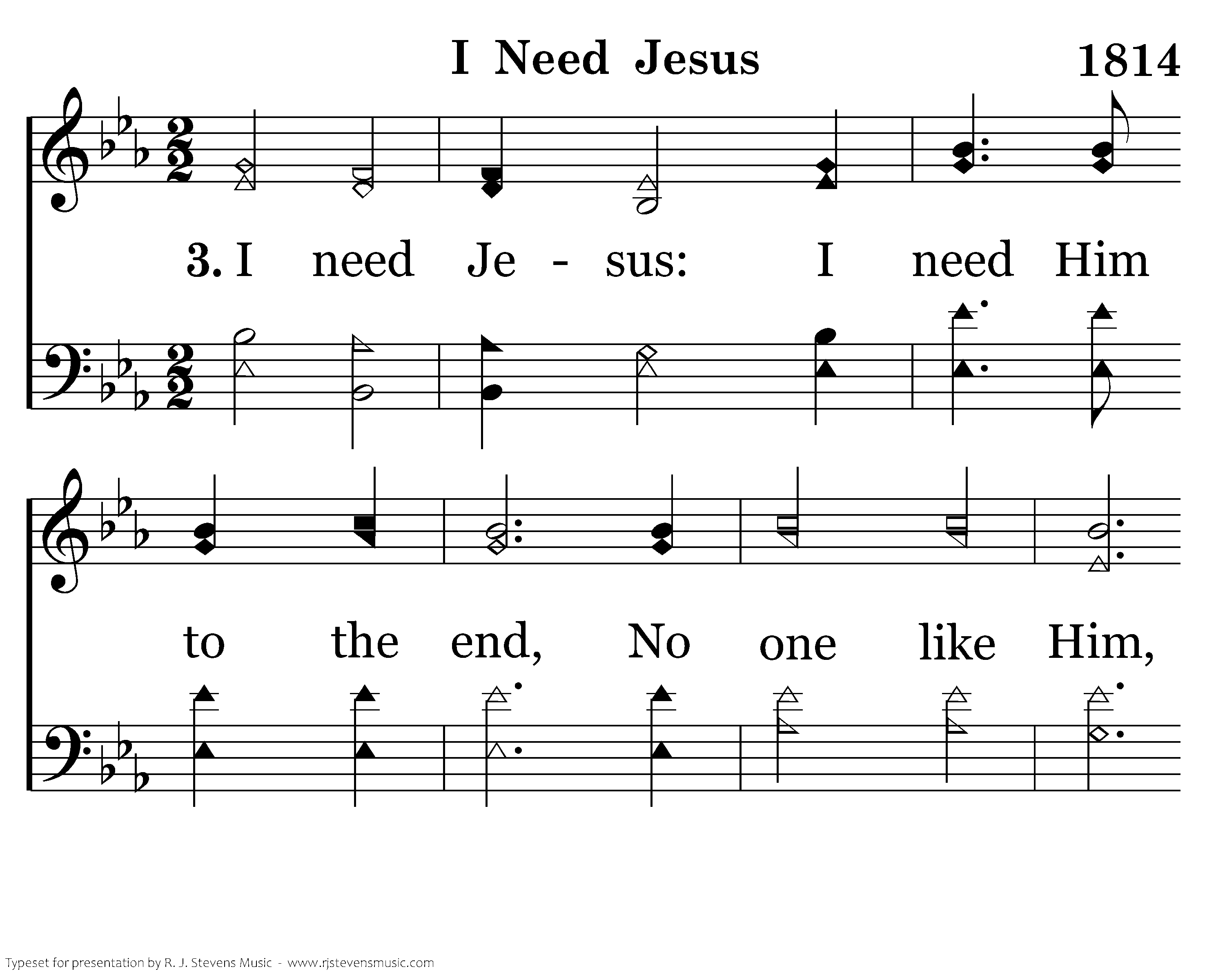 I need Jesus: I need Him to the end, No one like Him, He is the sinners' Friend; I need Jesus; no other Friend will do, So constant, kind, so strong and true Yes, I need Jesus.