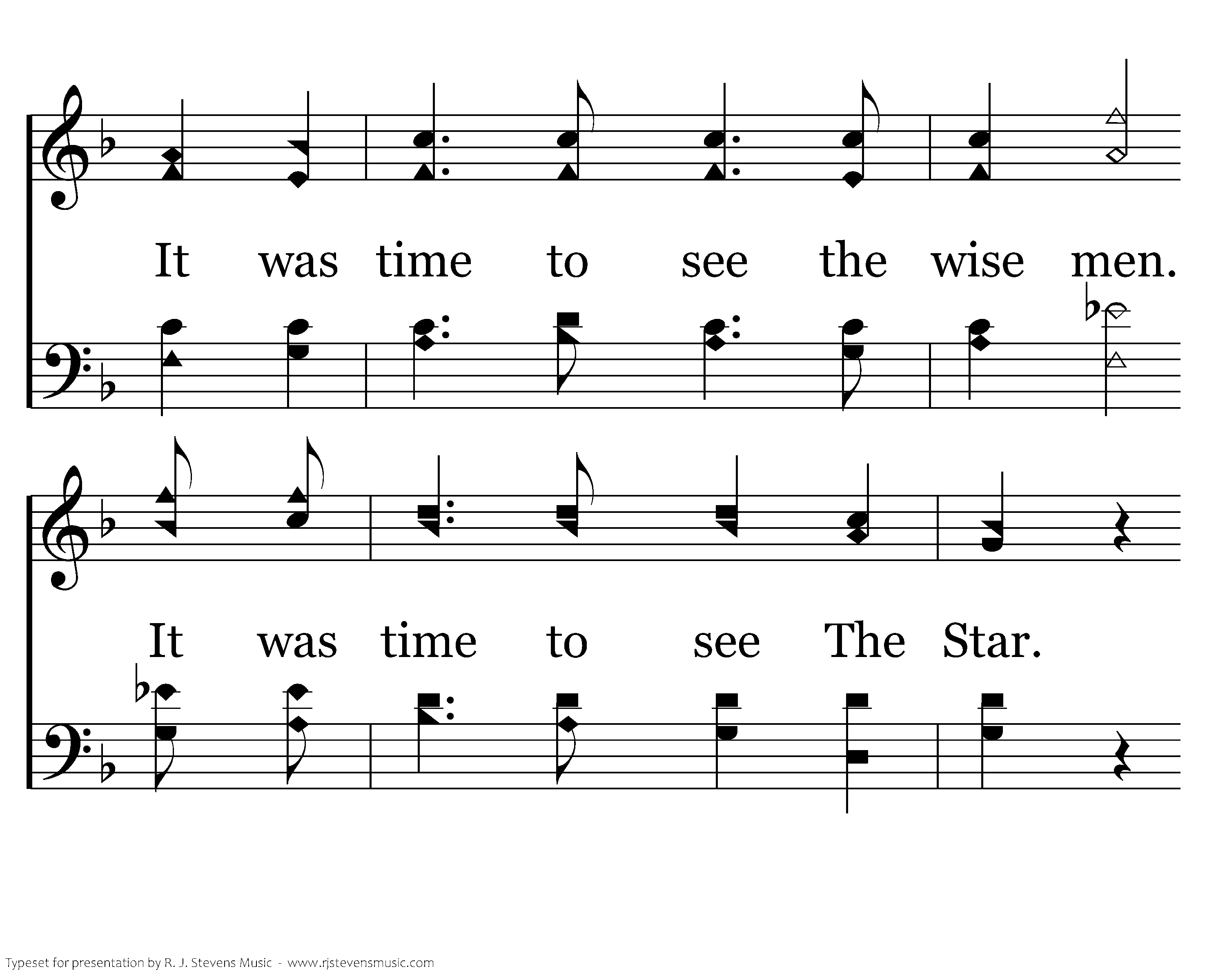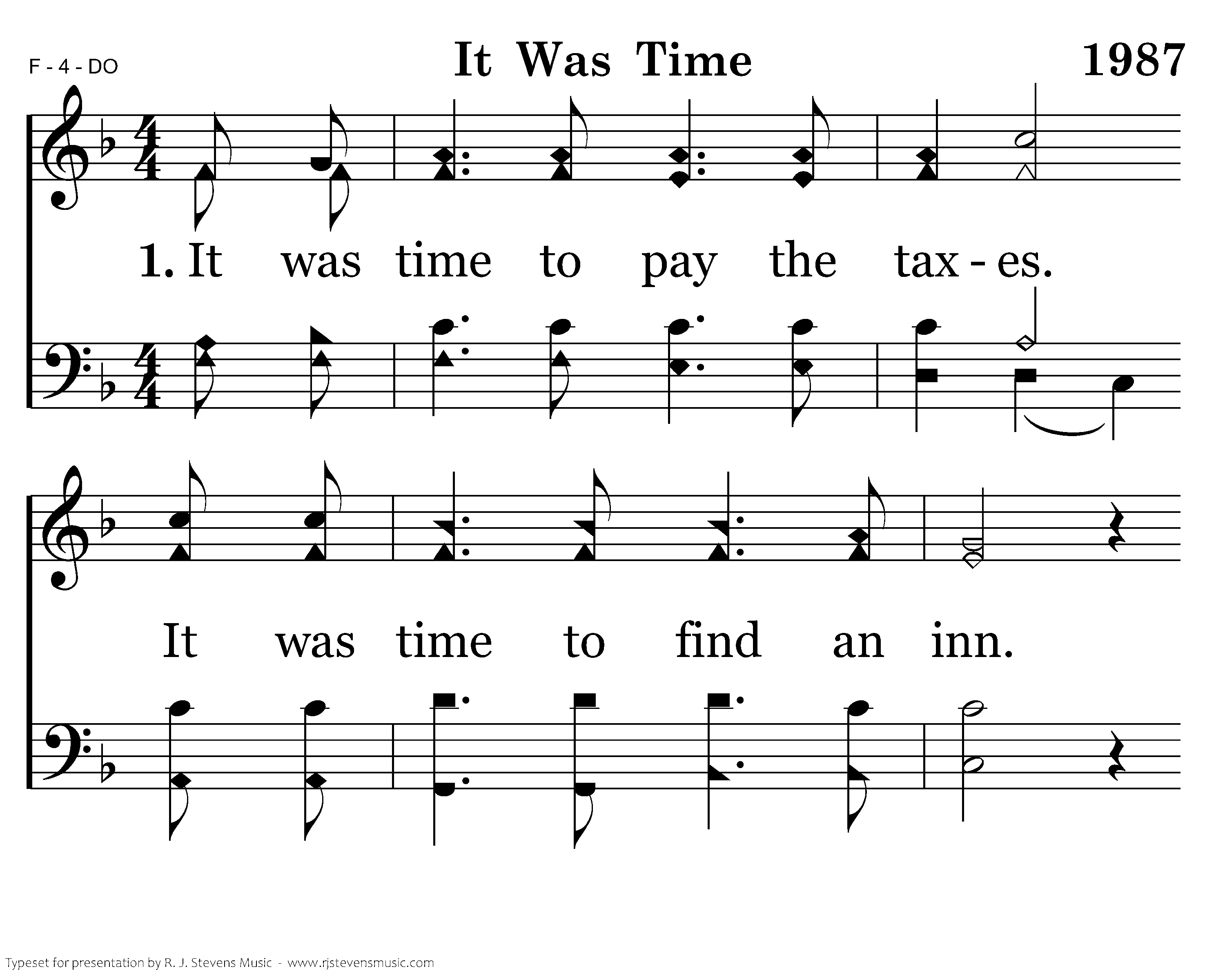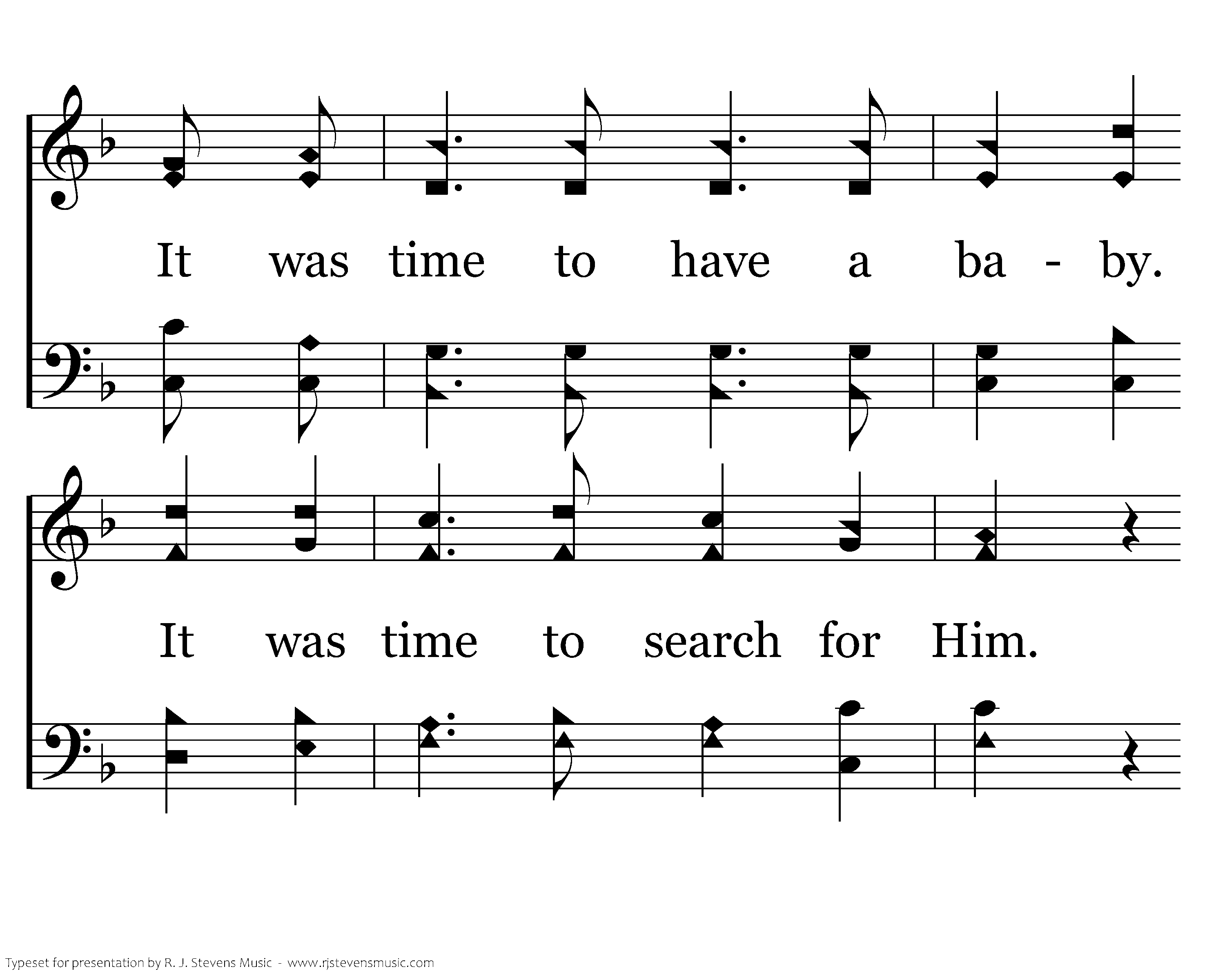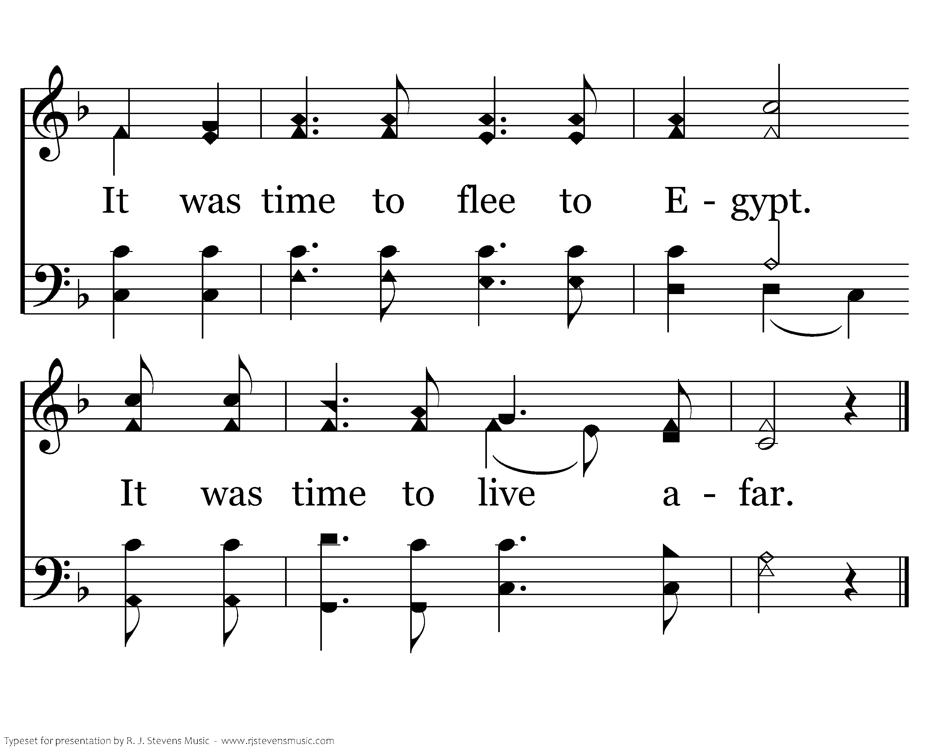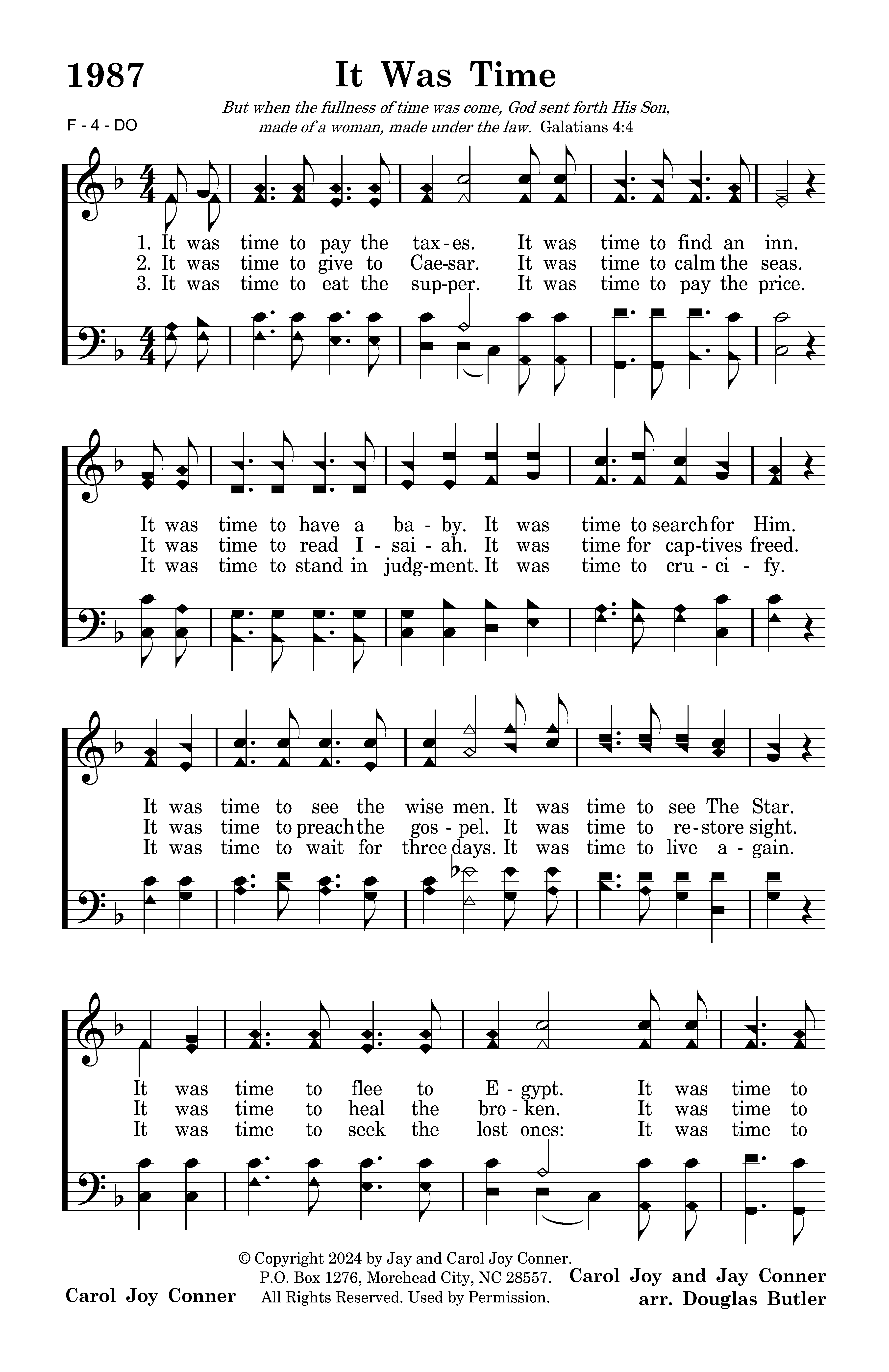 It was time to pay the taxes. It was time to find an inn. It was time to have a baby. It was time to search for Him. It was time to see the wise men. It was time to see The Star. It was time to flee to Egypt. It was time to live afar.