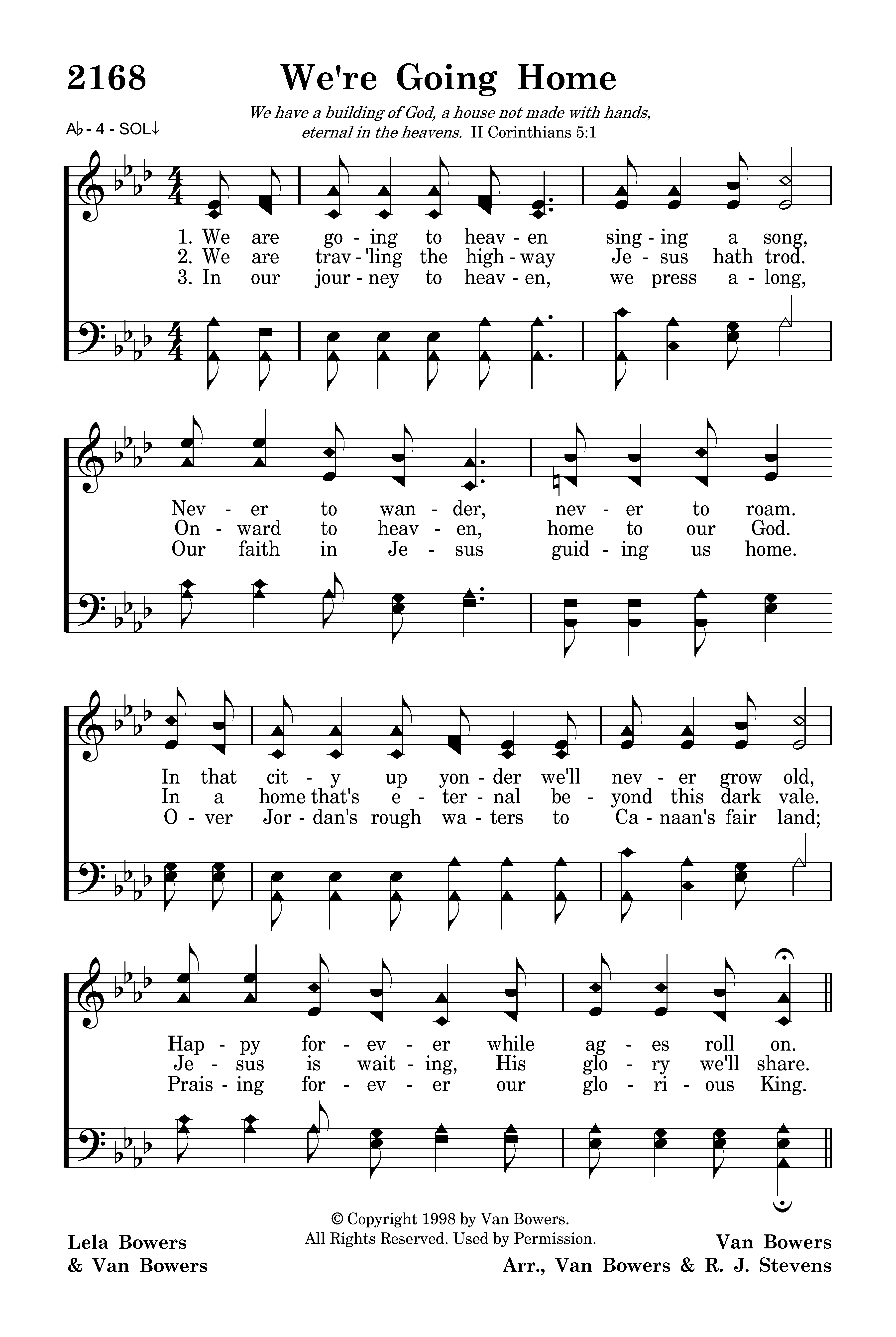 We are going to heaven singing a song, Never to wander, never to roam. In that city up yonder we'll never grow old, Happy forever while ages roll on.