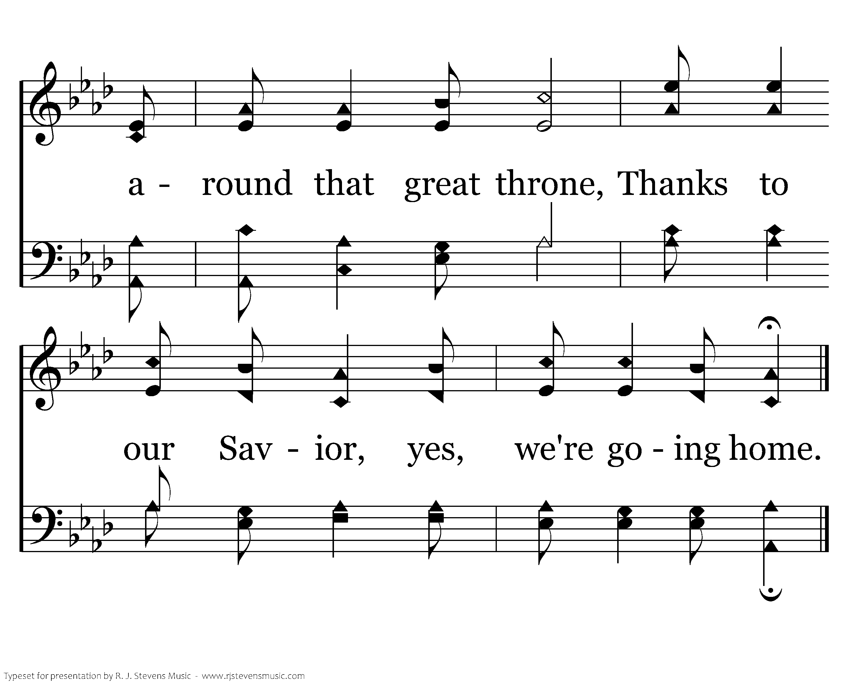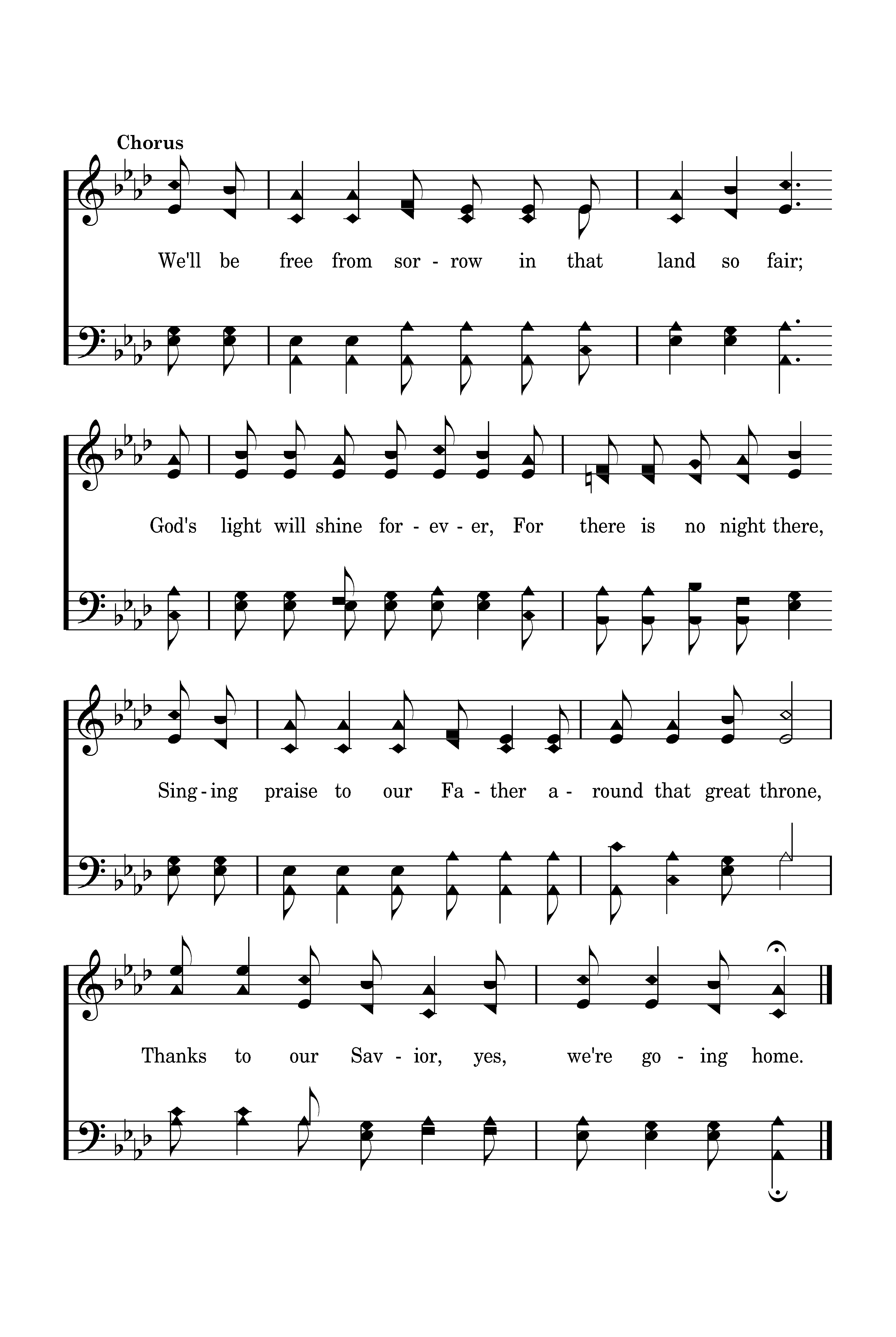 We'll be free from sorrow in that land so fair; God's light will shine forever, For there is no night there, Singing praise to our Father around that great throne, Thanks to our Savior, yes, we're going home.