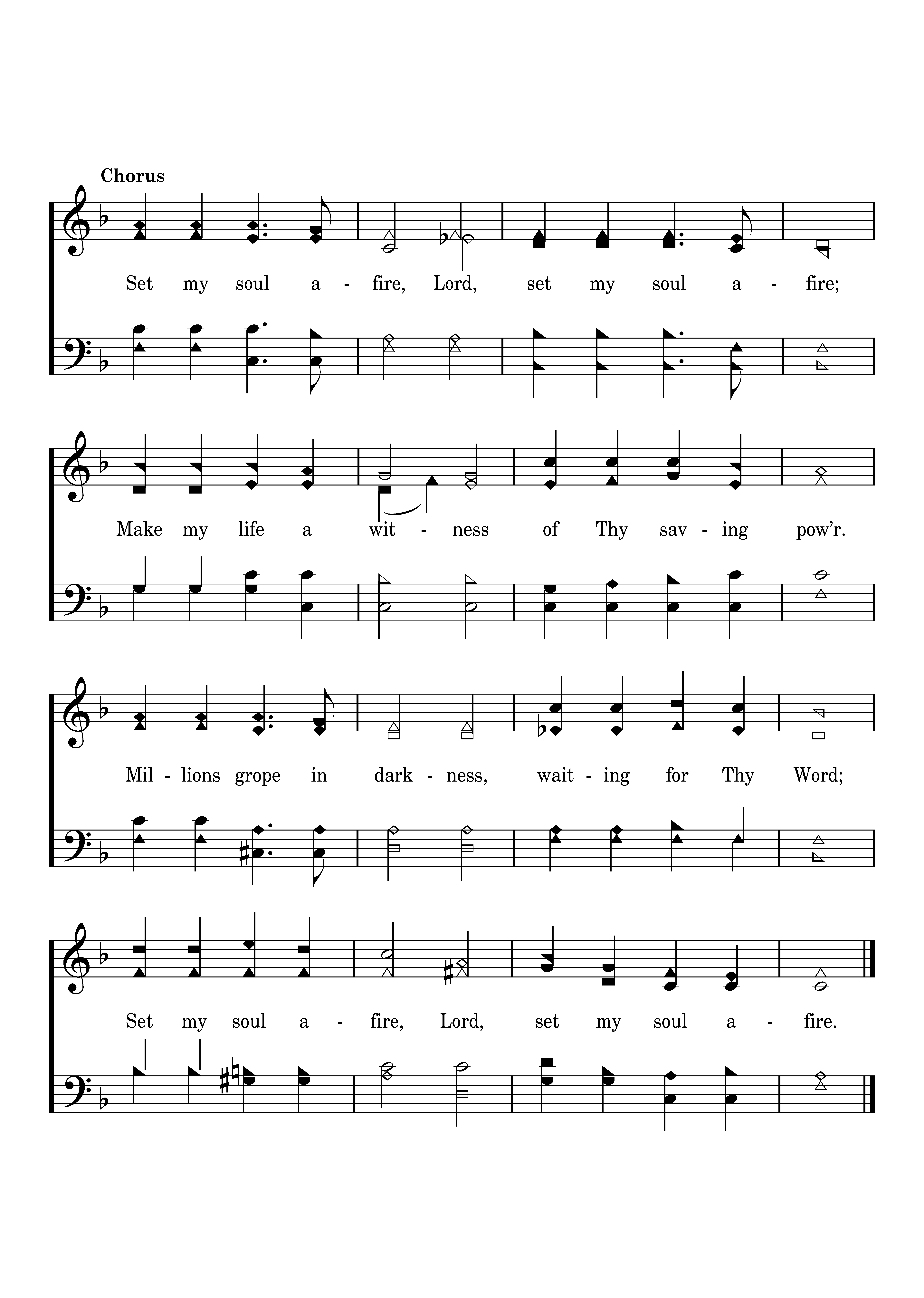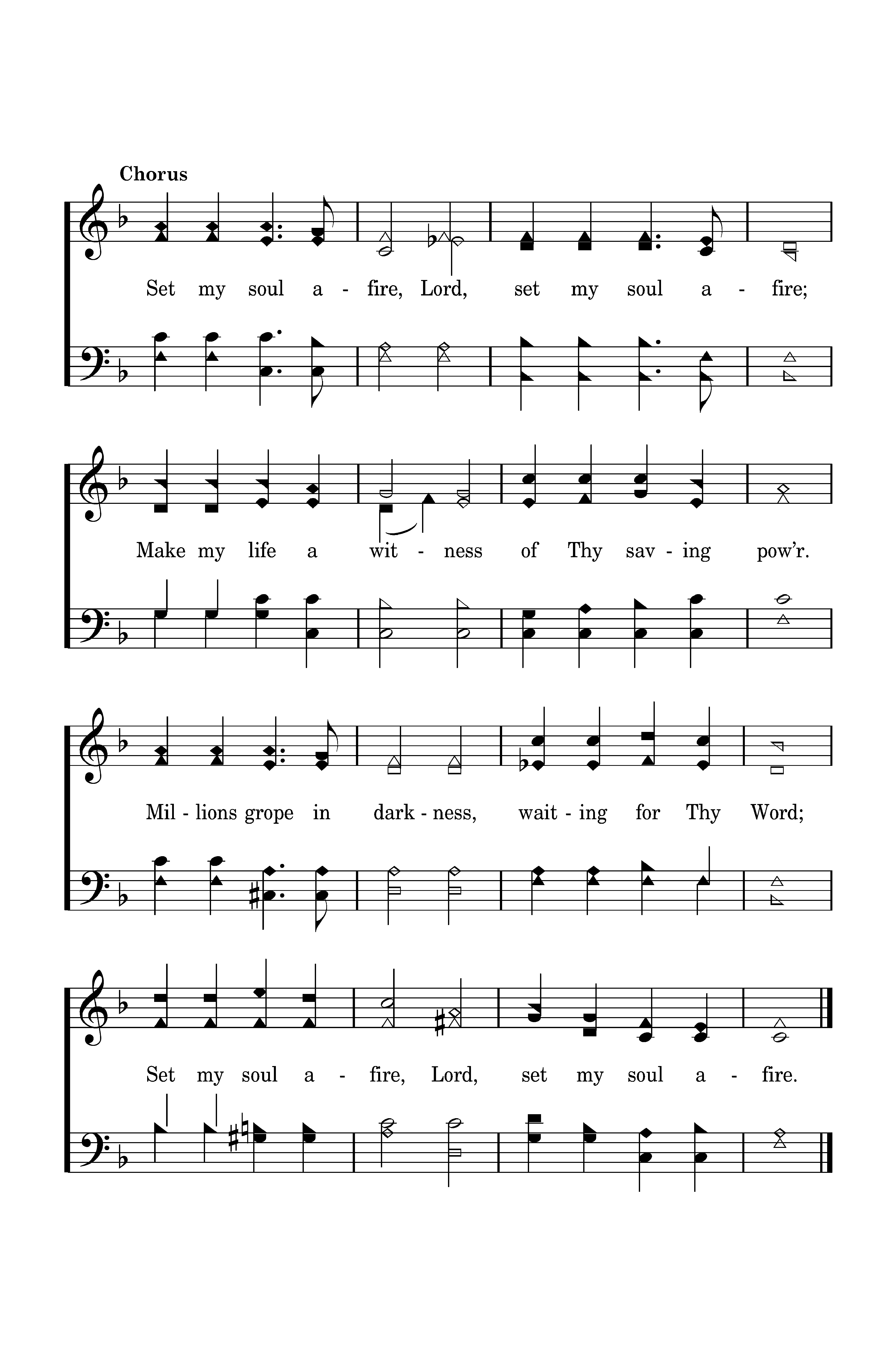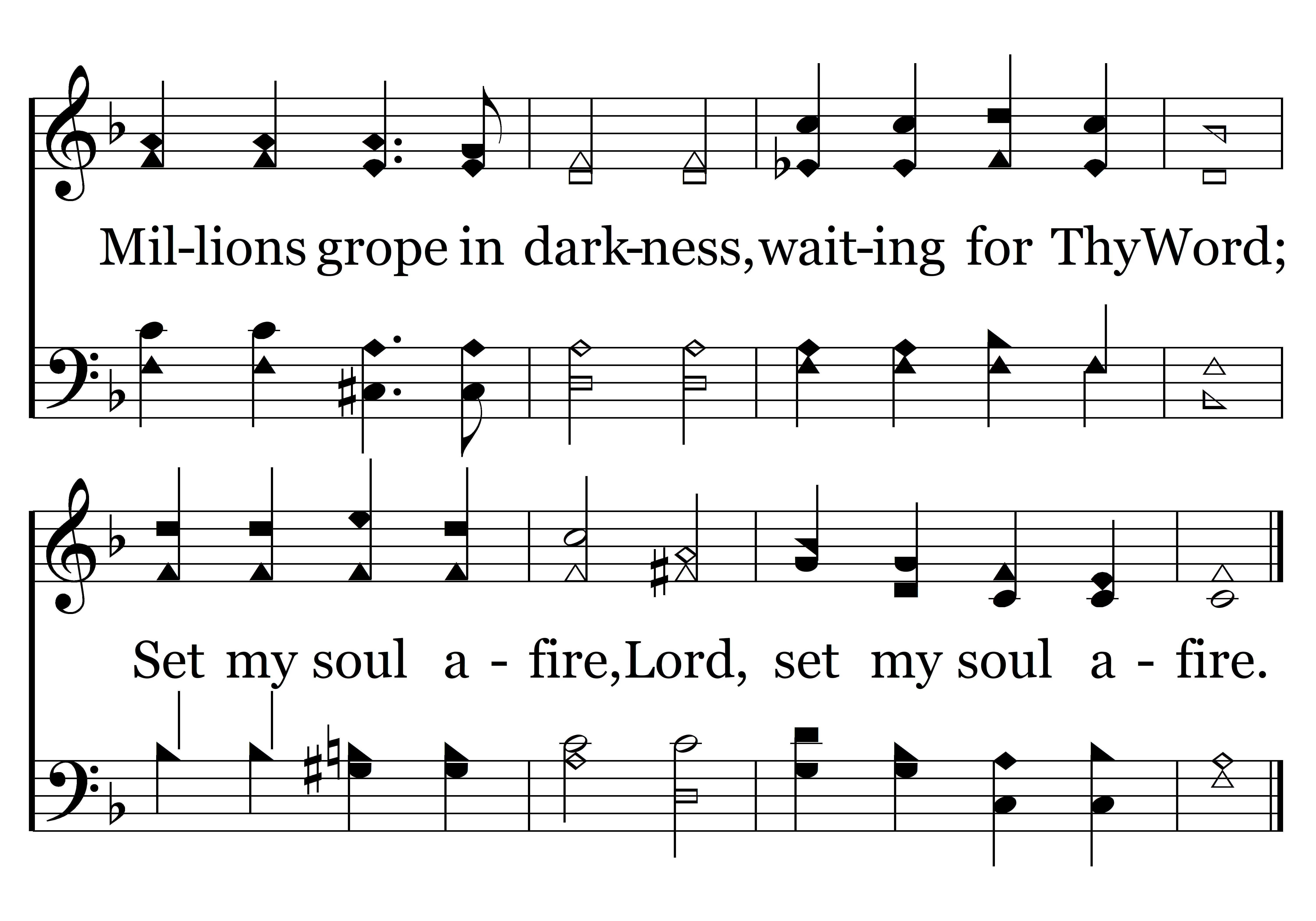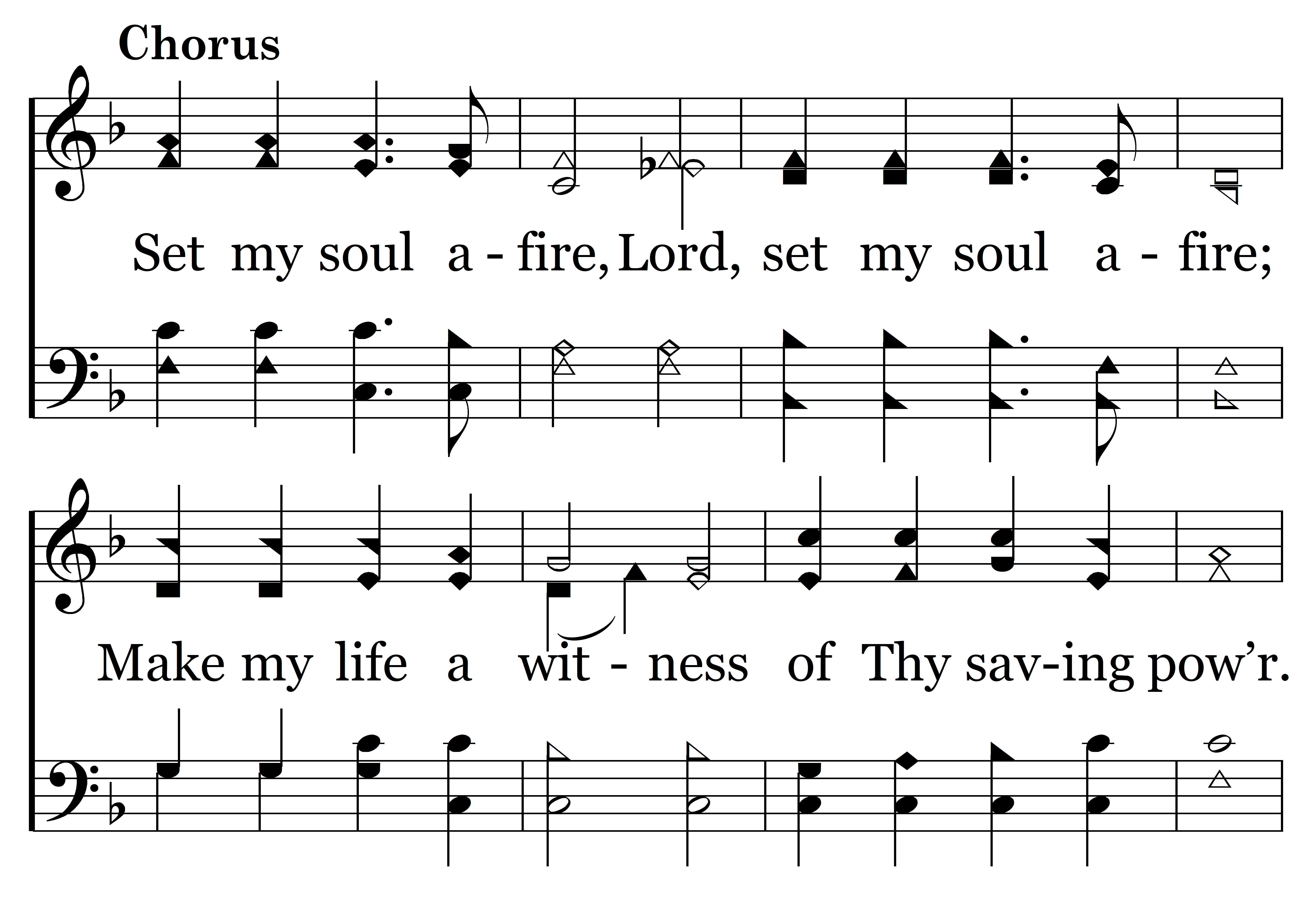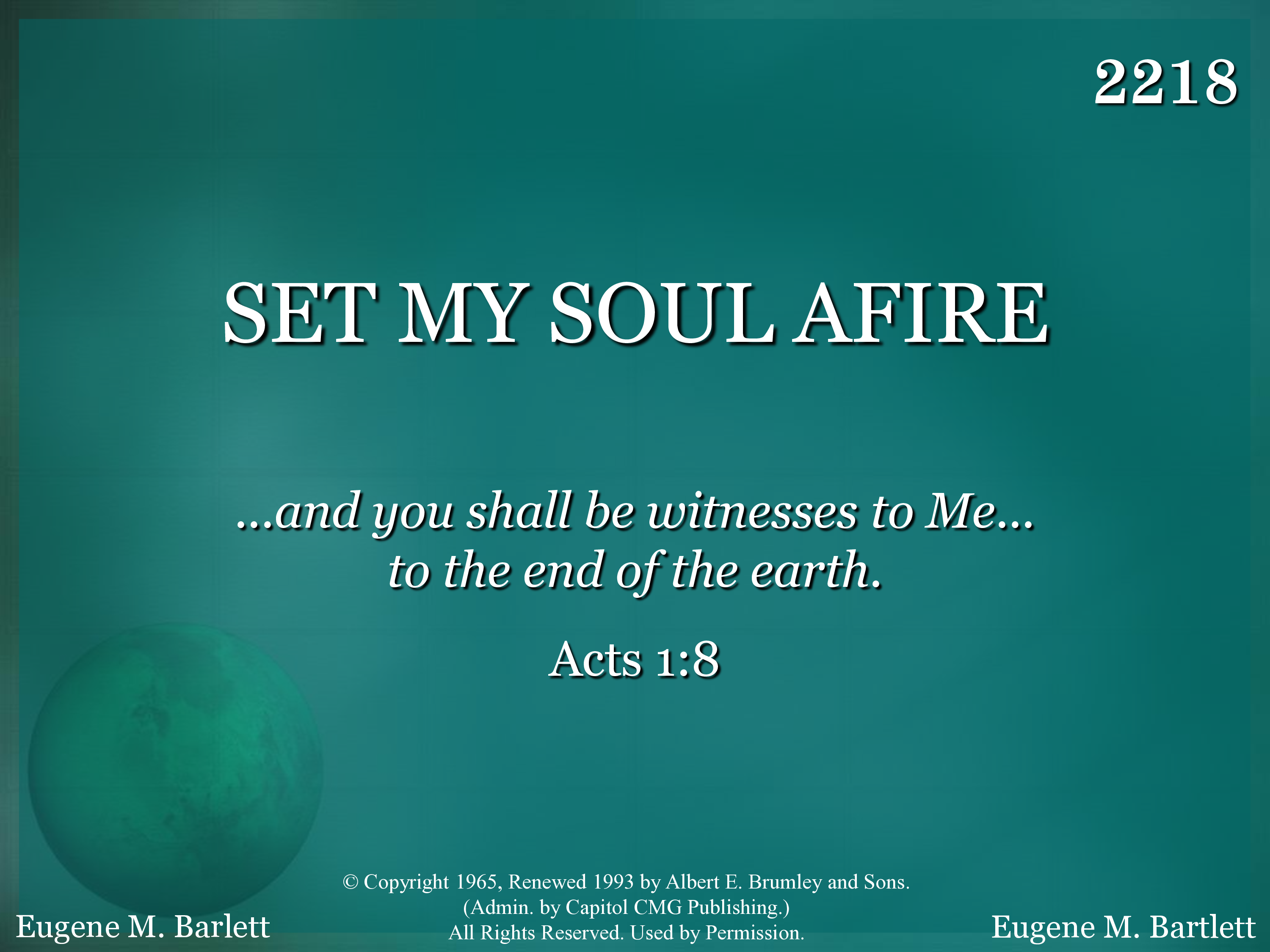 Set my soul afire, Lord, set my soul afire; Make my life a witness of Thy saving pow’r. Millions grope in darkness, waiting for Thy Word; Set my soul afire, Lord, set my soul afire.