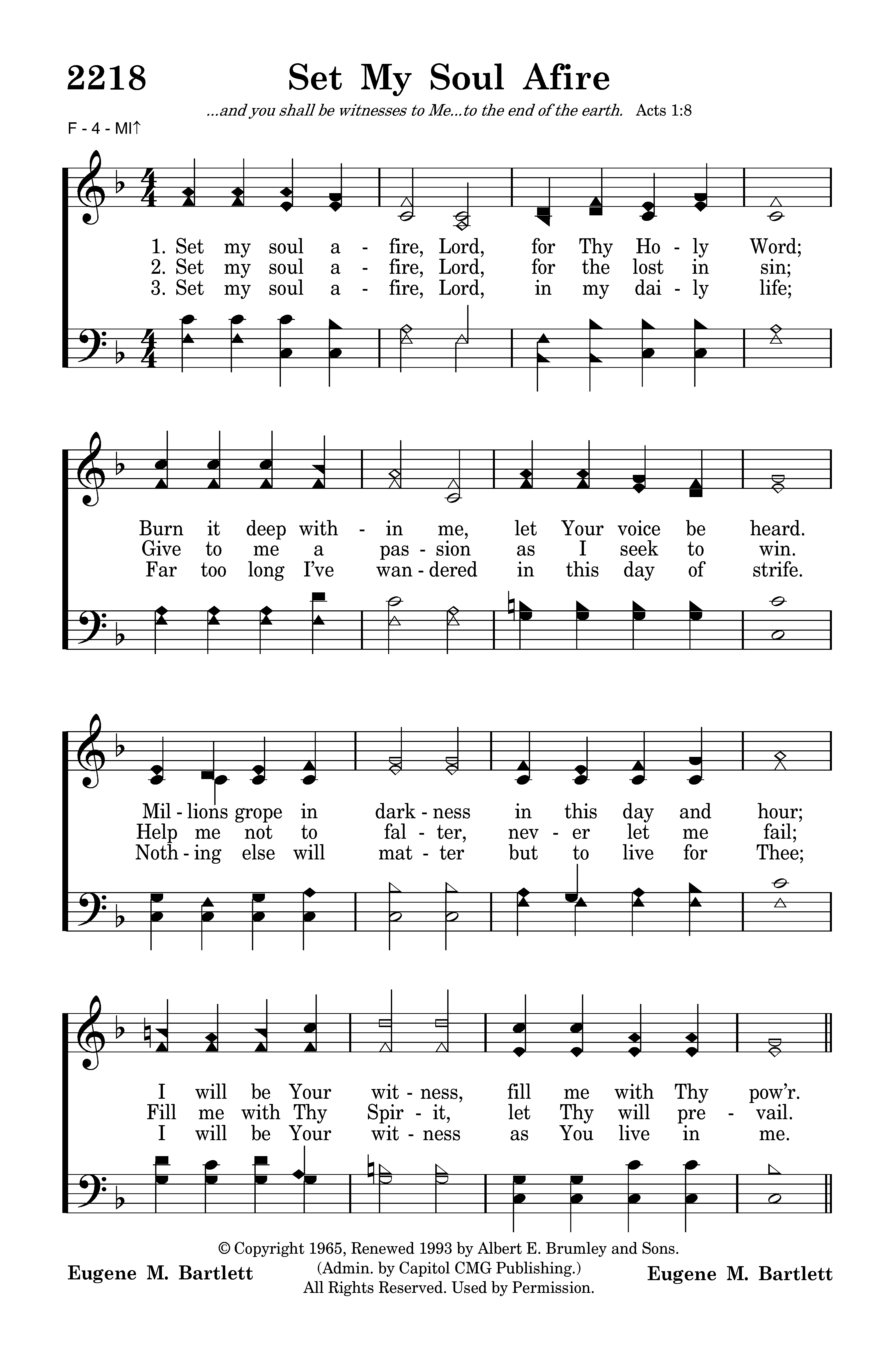 Set my soul afire, Lord, in my daily life; Far too long I’ve wandered in this day of strife. Nothing else will matter but to live for Thee; I will be Your witness as You live in me.